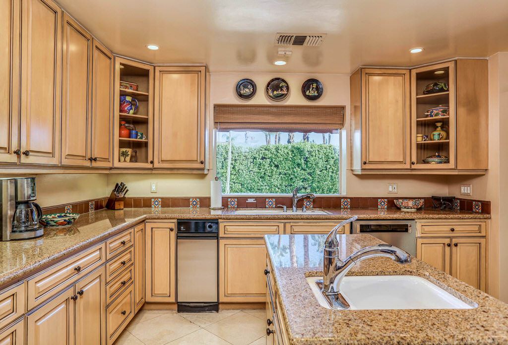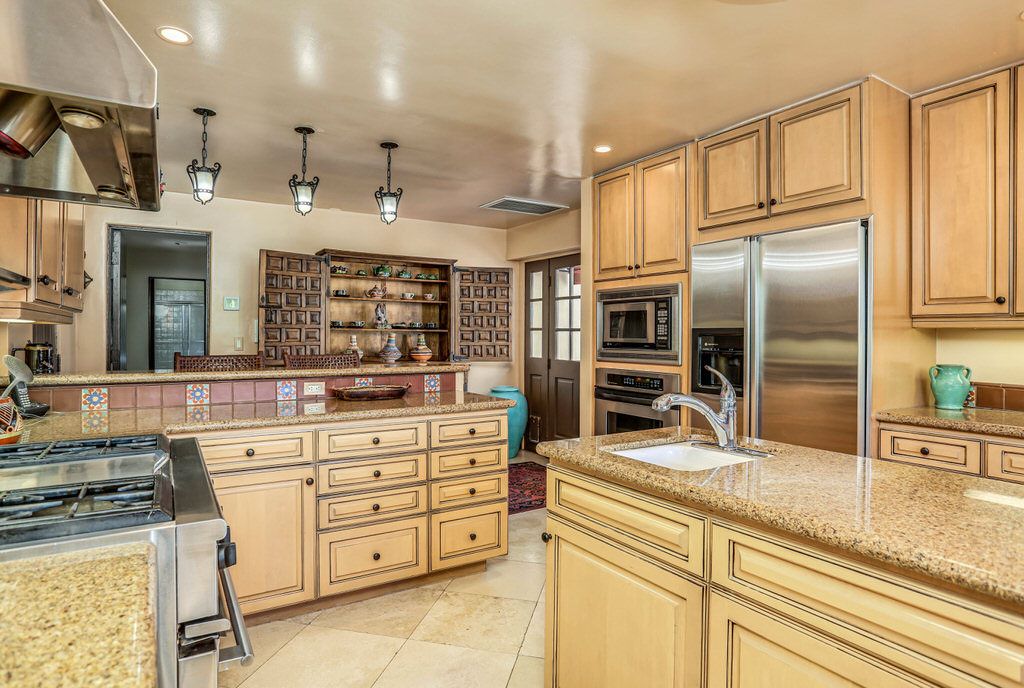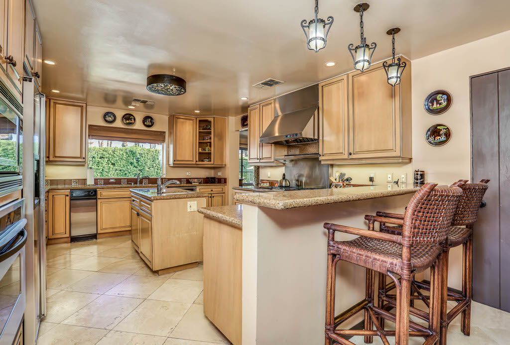The kitchen is updated to meet today's expectations, with stainless steel appliances, Monogram range/oven, granite counter-tops, a large island and bar seating for two. Keeping with the Old Spanish style the kitchen has beautiful arches and wonderful use of pleasing warm colors. The kitchen is equipped with plates, glasses, wine glasses, utensils, pots and pans, coffee maker, toaster, blender, and much more. It is fully prepared for a relaxing Palm Springs getaway.