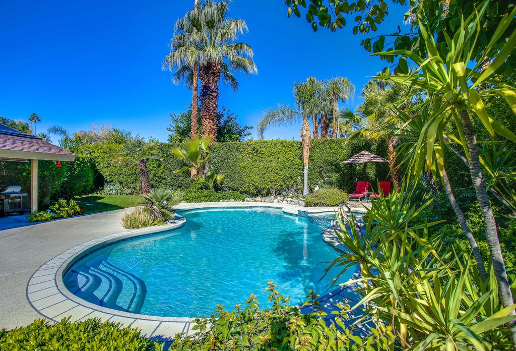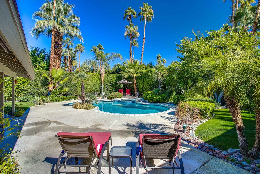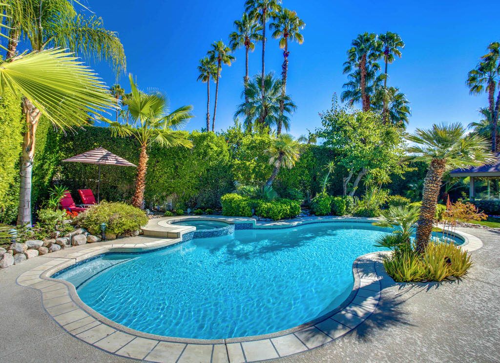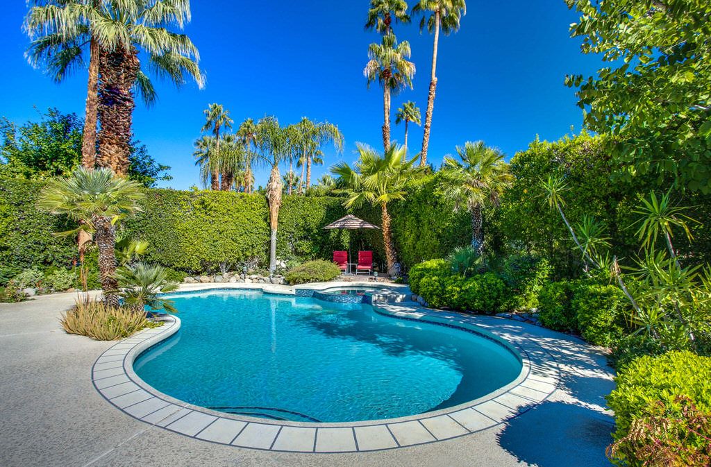 The outdoor area of this Palm Springs vacation home is really spectacular - it's beautiful both day and night. At dusk, landscape lighting spotlights the tropical-like qualities of this outdoor oasis. During daylight hours, the the sunshine and soaring palm trees provide a vacation sensation.