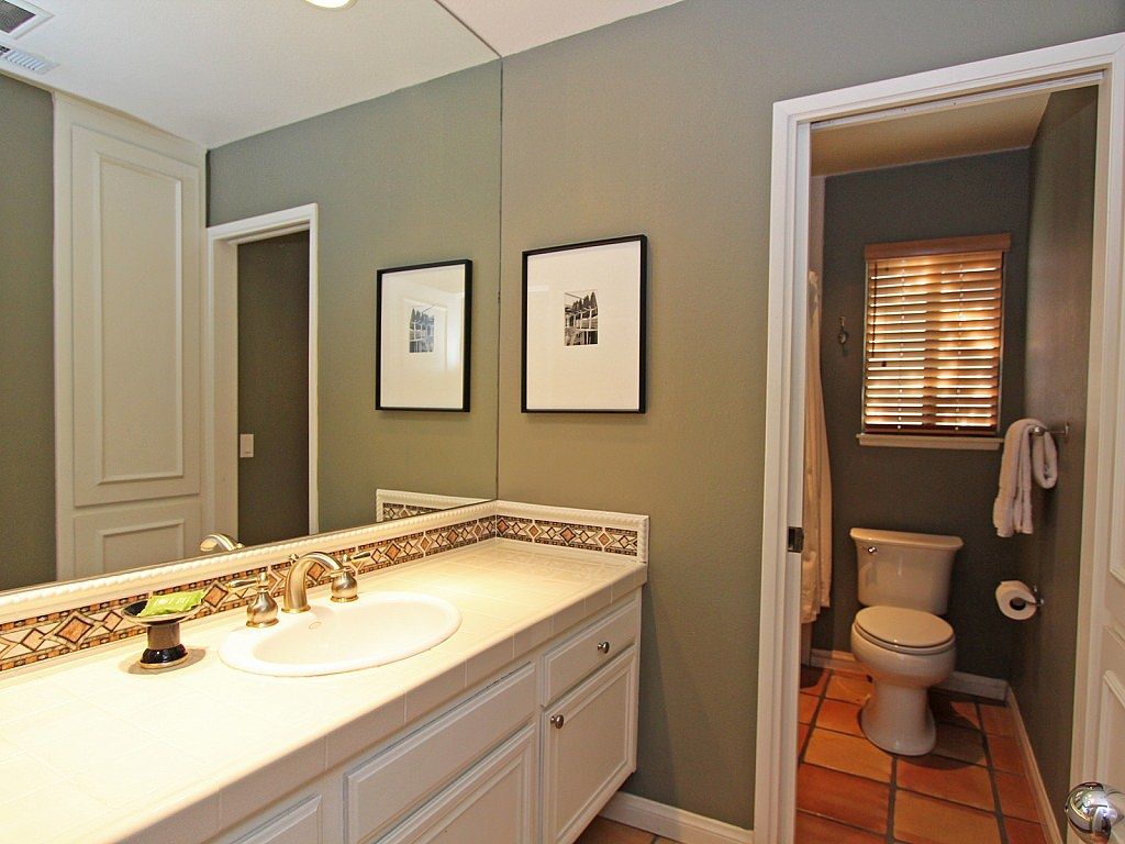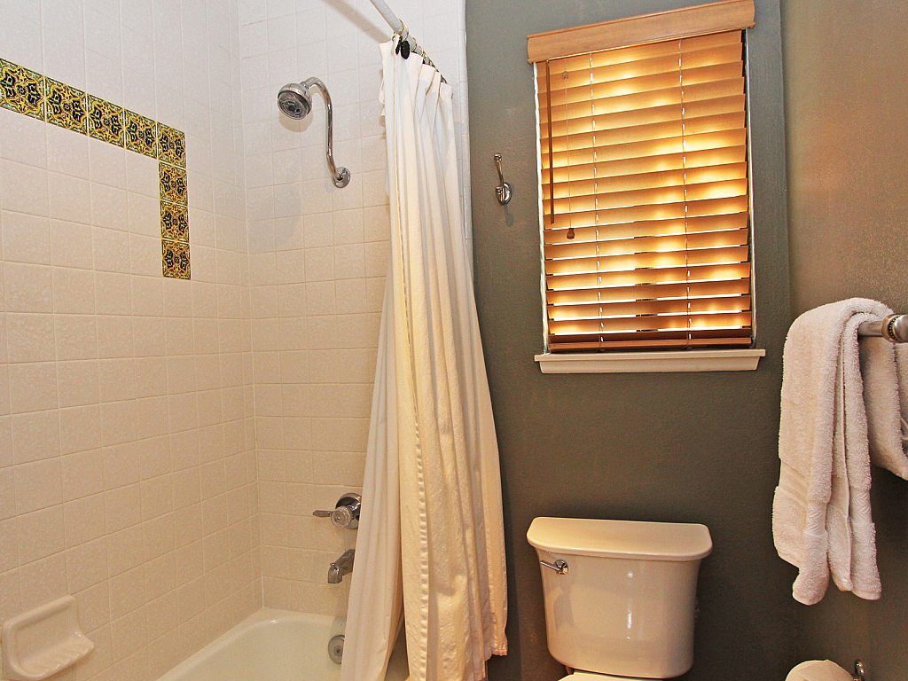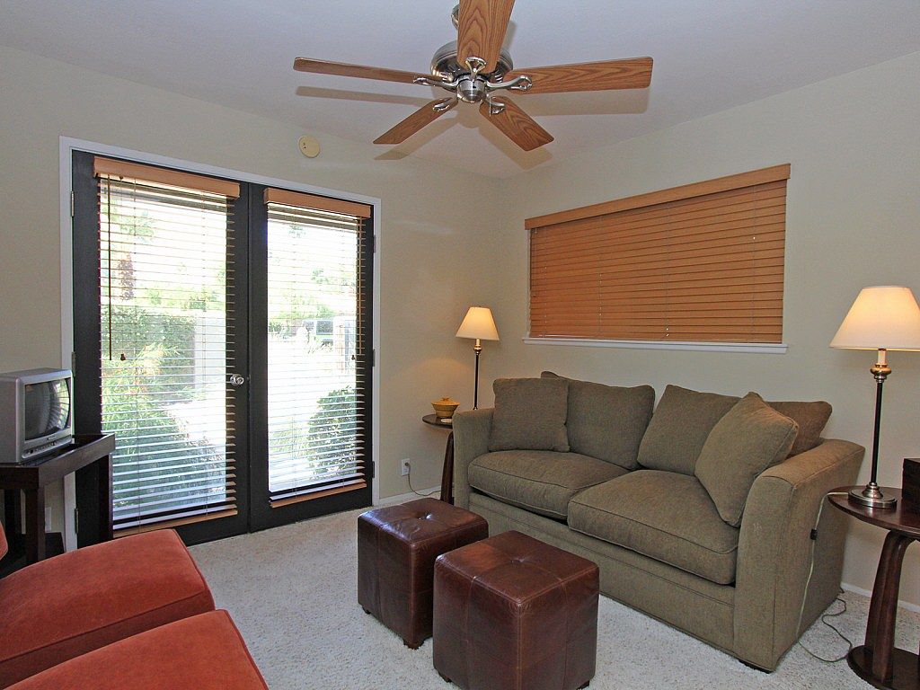 The sitting room/study has a nice full size sofa sleeper with comfortable furnishings and french doors that open to the front courtyard.