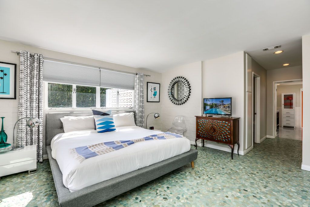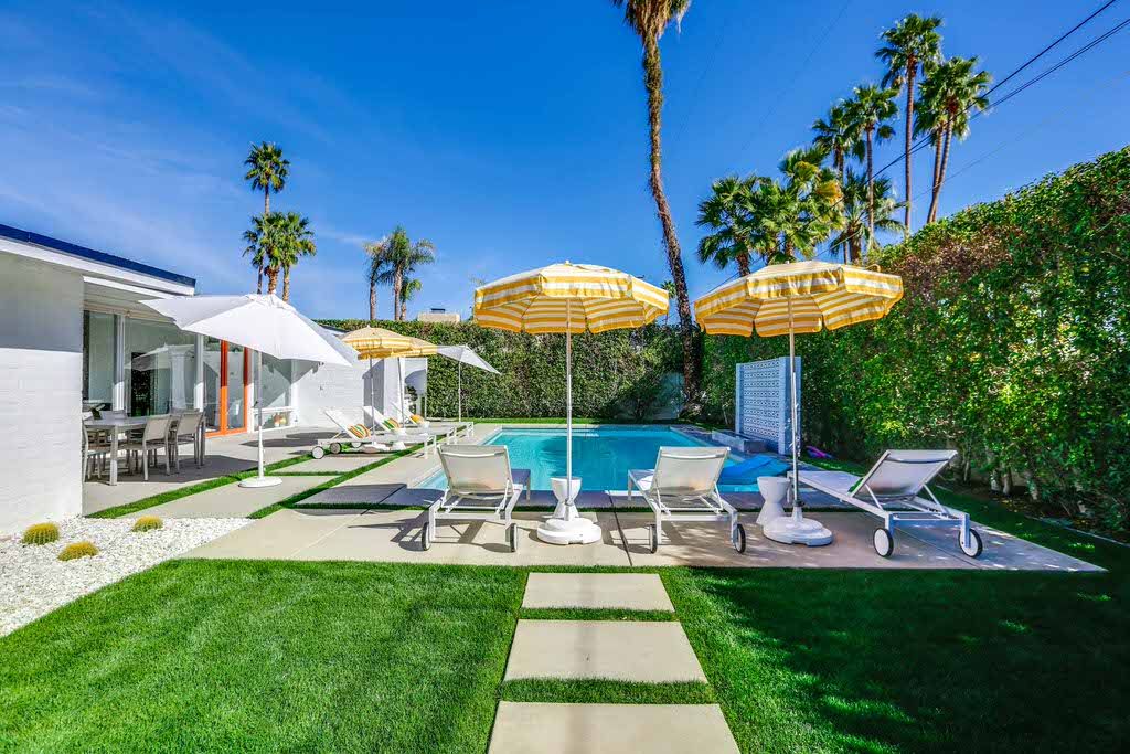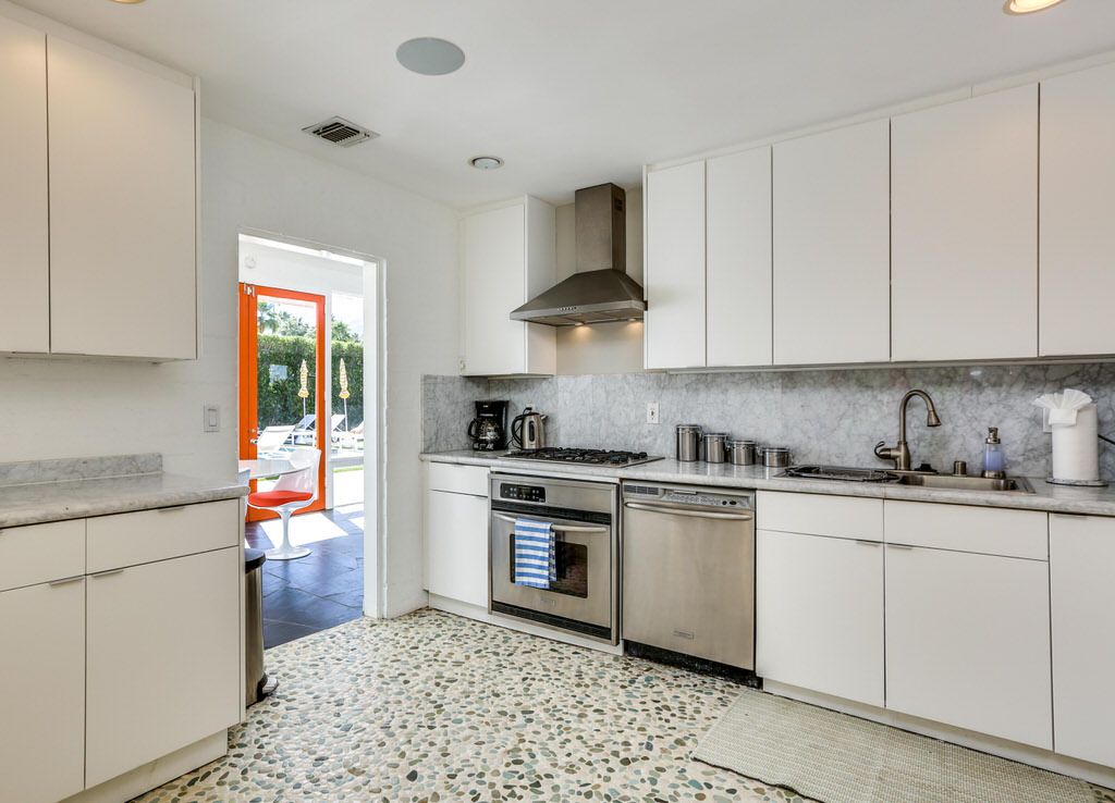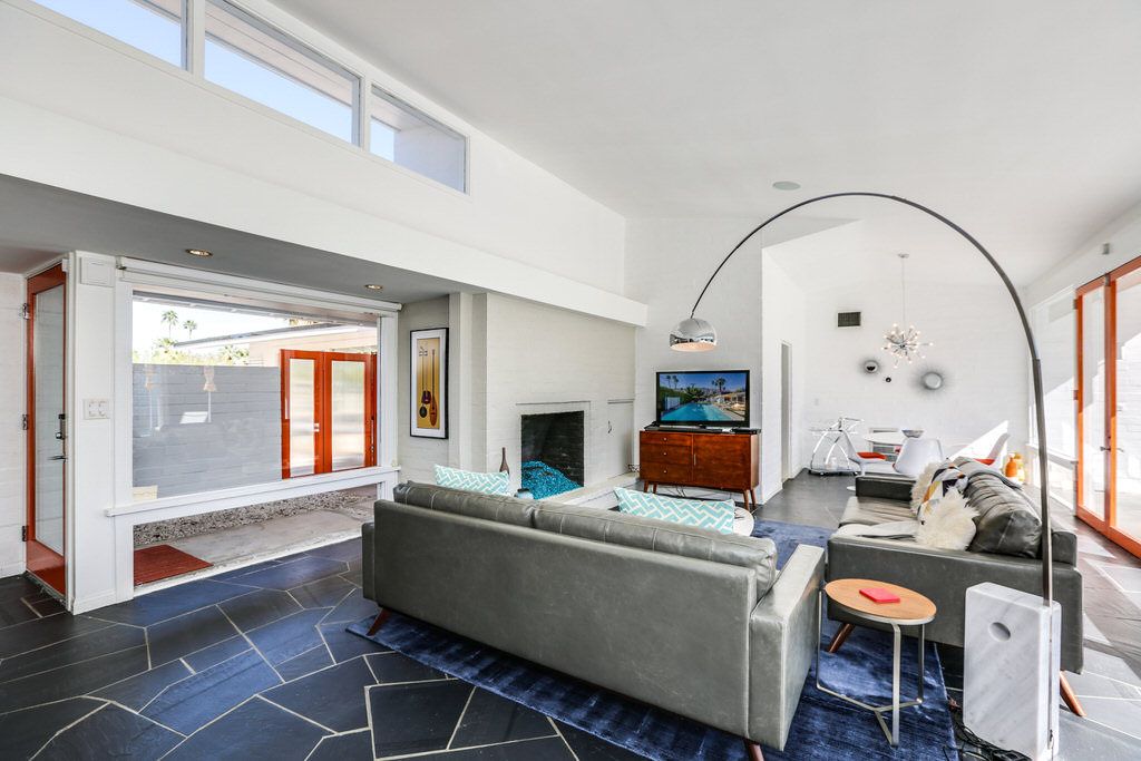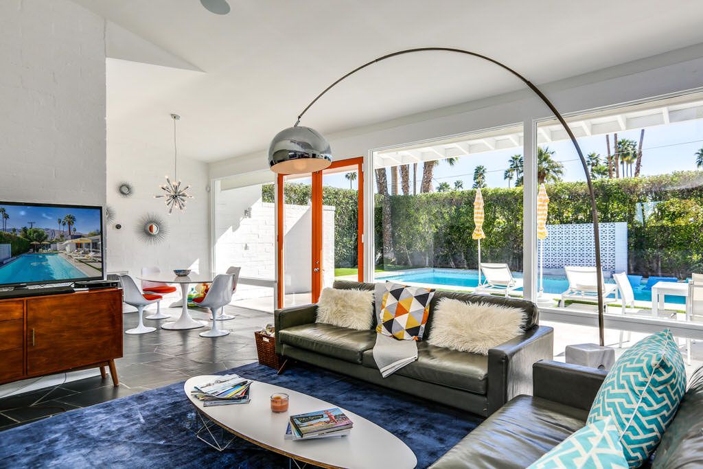 Inside, enjoy clerestory windows, expansive floor to ceiling window panels, and French doors that lead out to the sparkling deep pool. The kitchen includes everything you would find in your own home including, marble counters, modern appliances, including all the pots and pans to cook a gourmet meal. The kitchen also features direct access to the side-yard This Palm Springs vacation home offers a comfortable relaxing feel to be enjoyed by all.