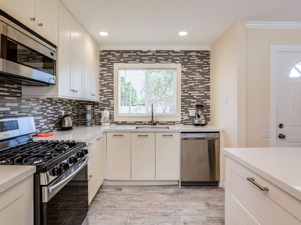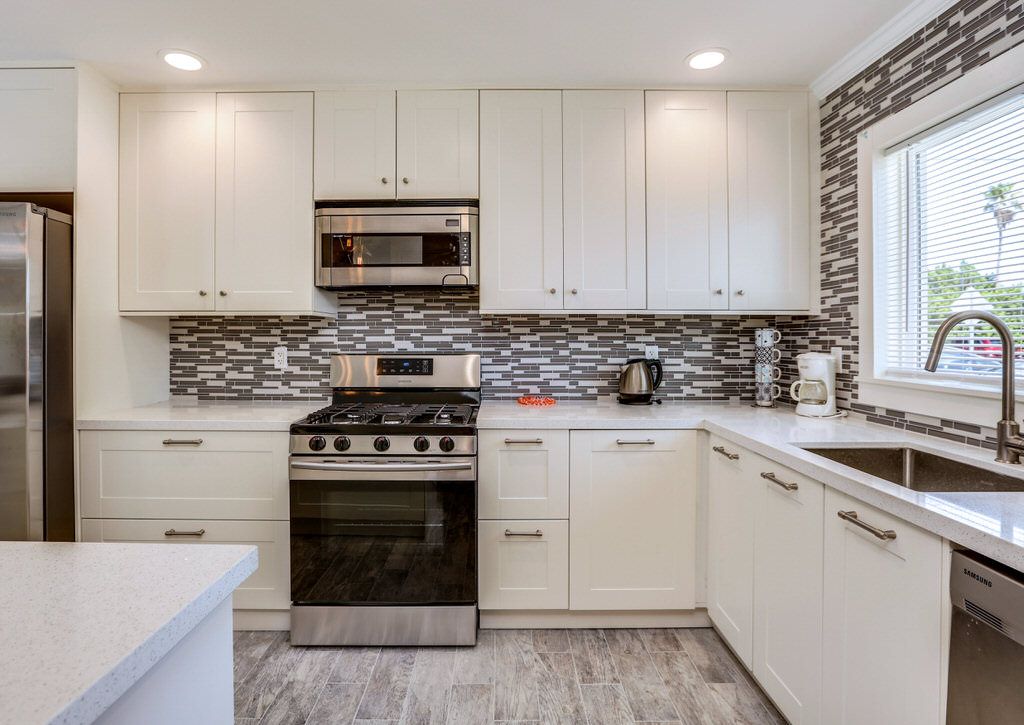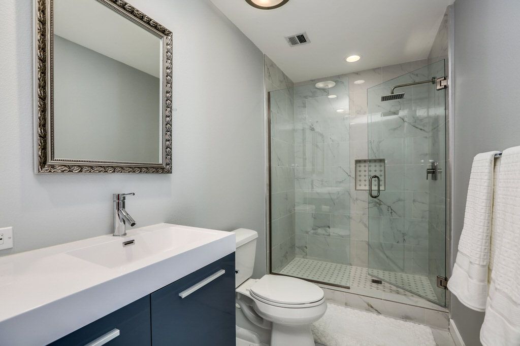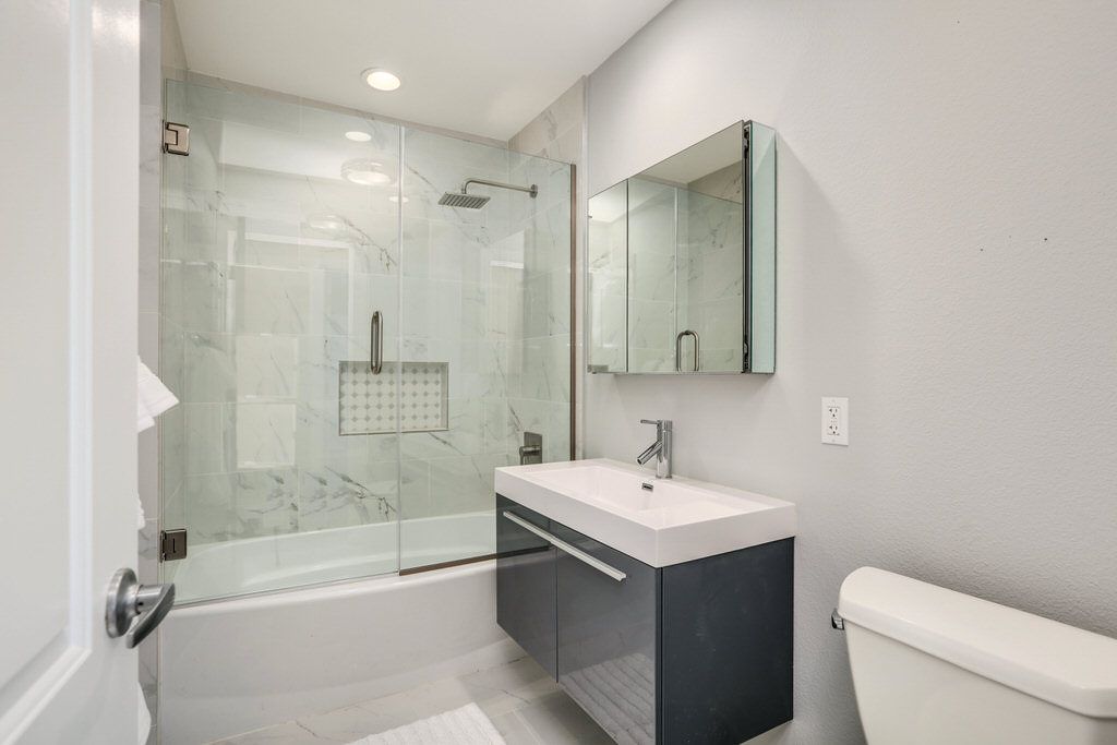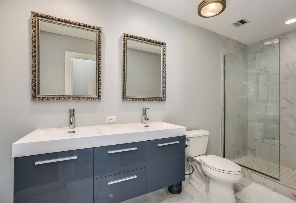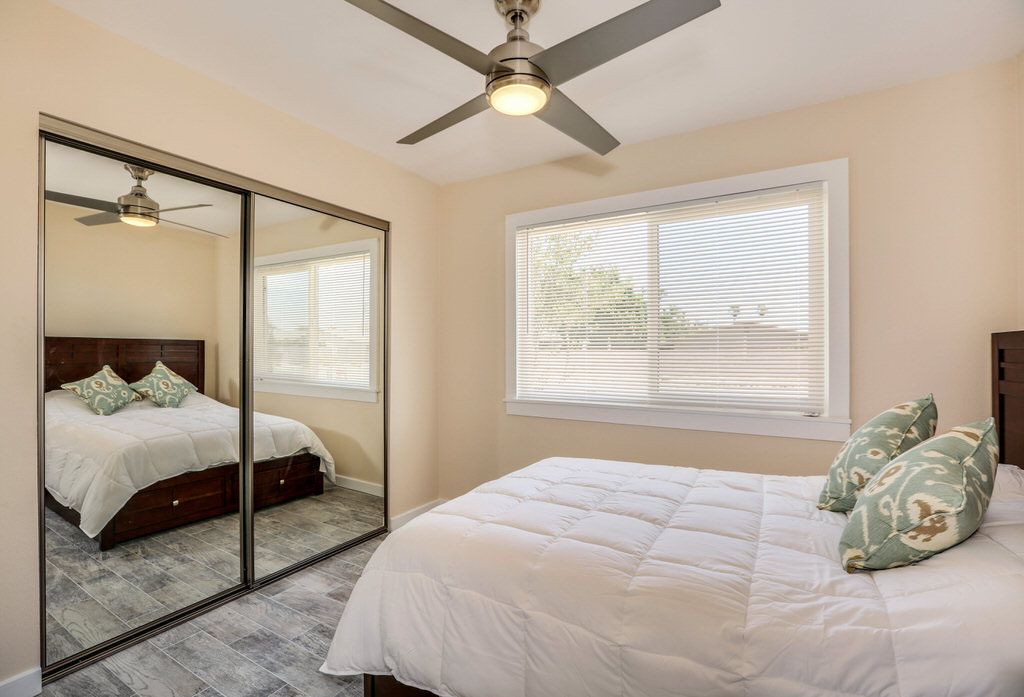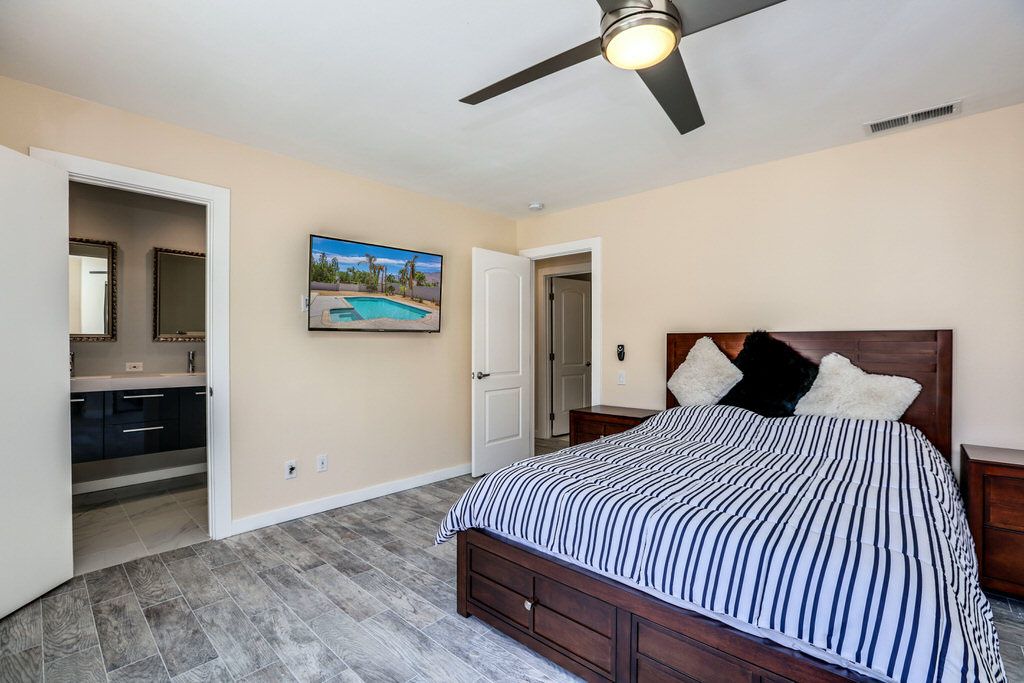 The master bedroom features a queen bed with comfortable bedding. The French glass doors offer direct access to the backyard pool area. It also includes a modern en-suite bathroom that features a floating dual vanity sink and a walk in shower. The two guest bedrooms each feature full size bed and are stylishly appointed and comfortable. These 2 guest bedrooms share a hall bath that showcases a shower/tub combo.