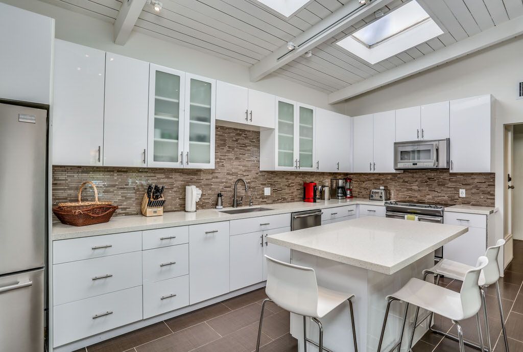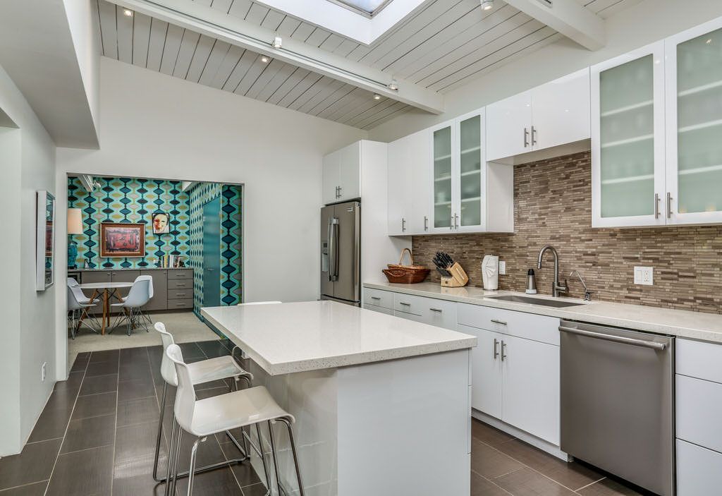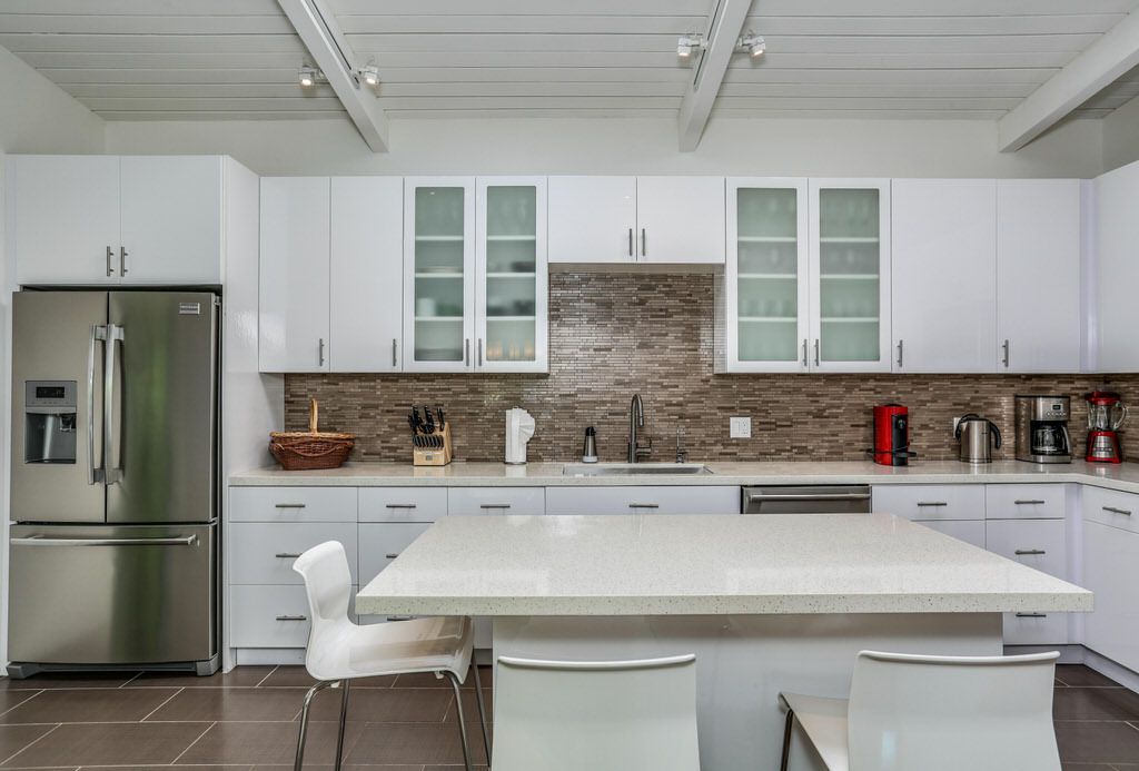 The kitchen of this Palm Springs vacation home has been fully updated with modern stainless steel appliances, custom cabinets, abundant countertop prep space, an electric range, breakfast bar seating for 3, and is equipped with everything you need to prepare meals and entertain guests.