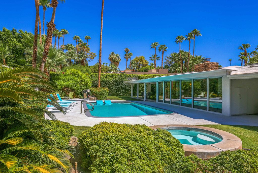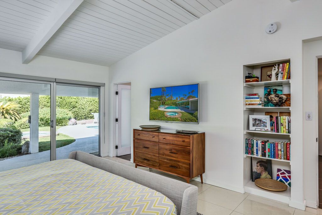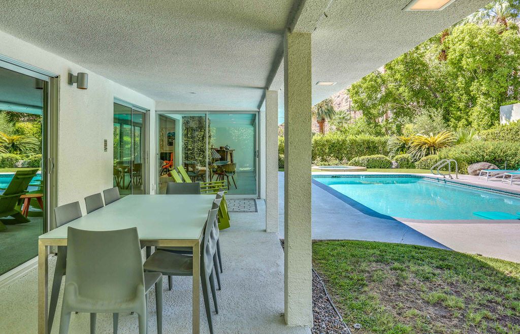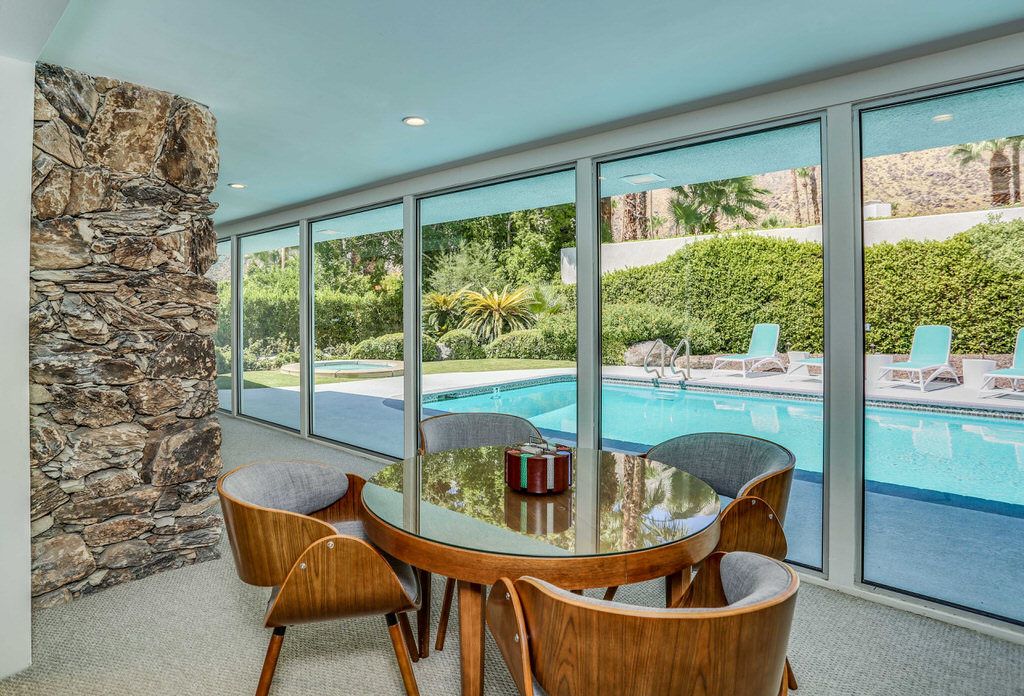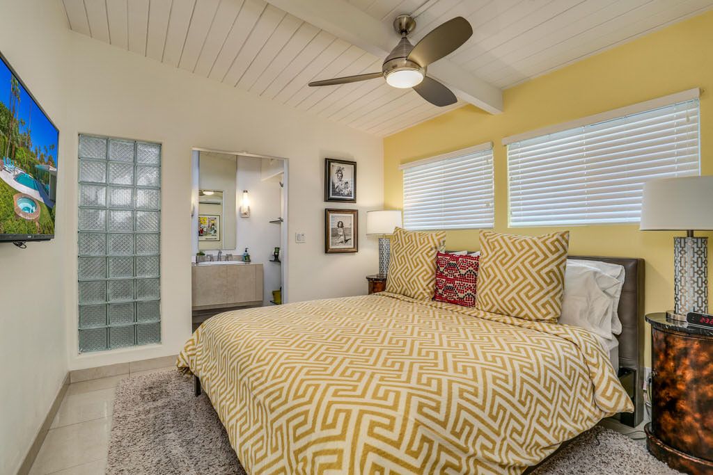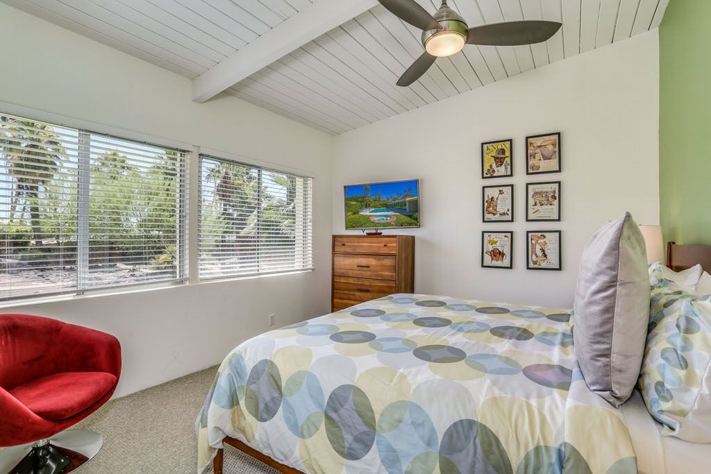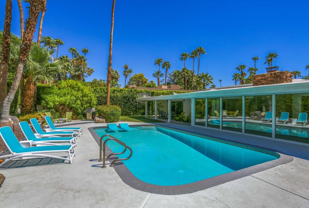 This Palm Springs vacation home was completely remodeled in 2015. The open great room is large and inviting and retains the quintessential mid-century modern design elements of the soaring post and beam ceilings, walls of glass overlooking the pool and spa, and exposed natural stone chimney.