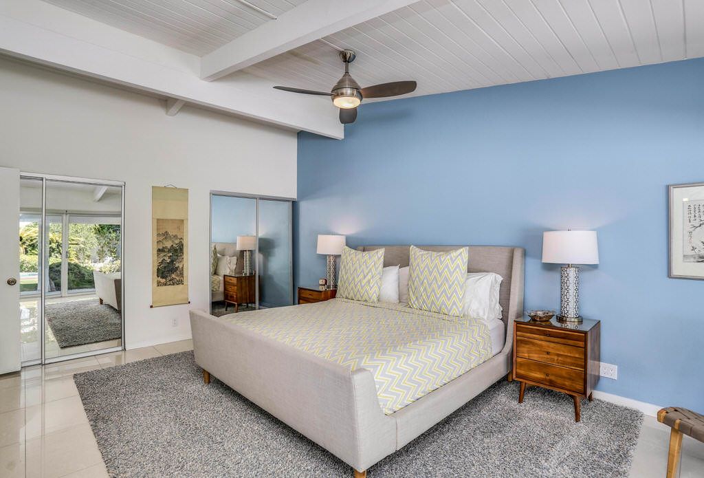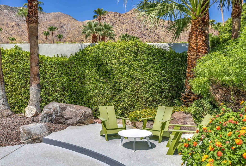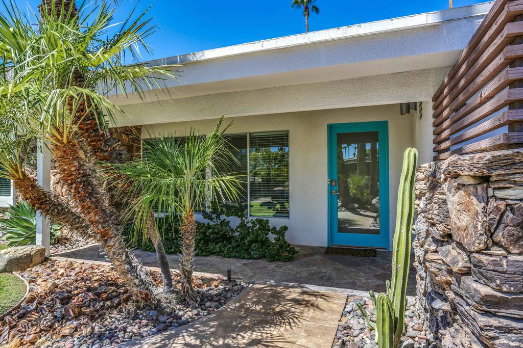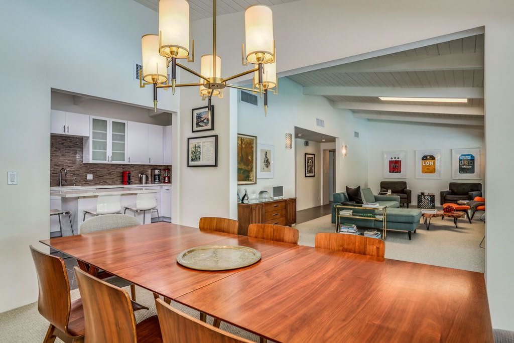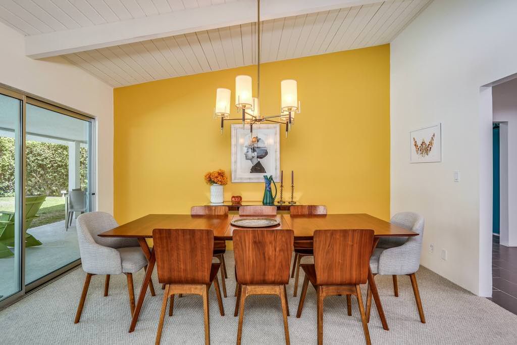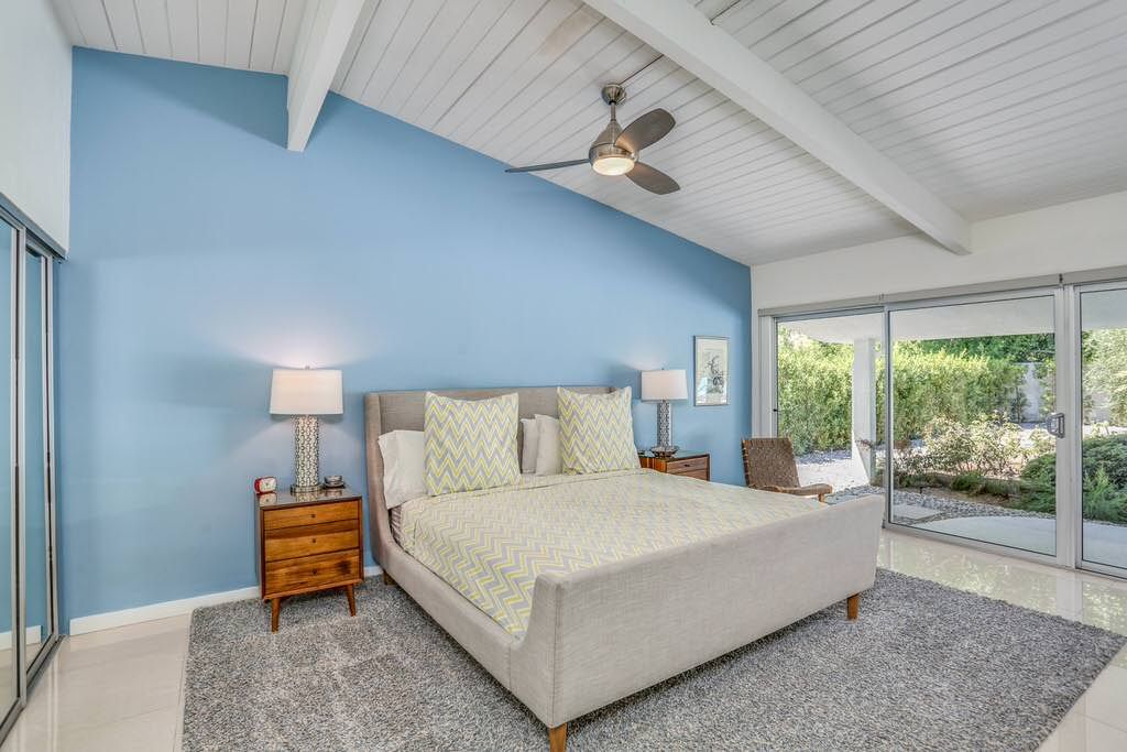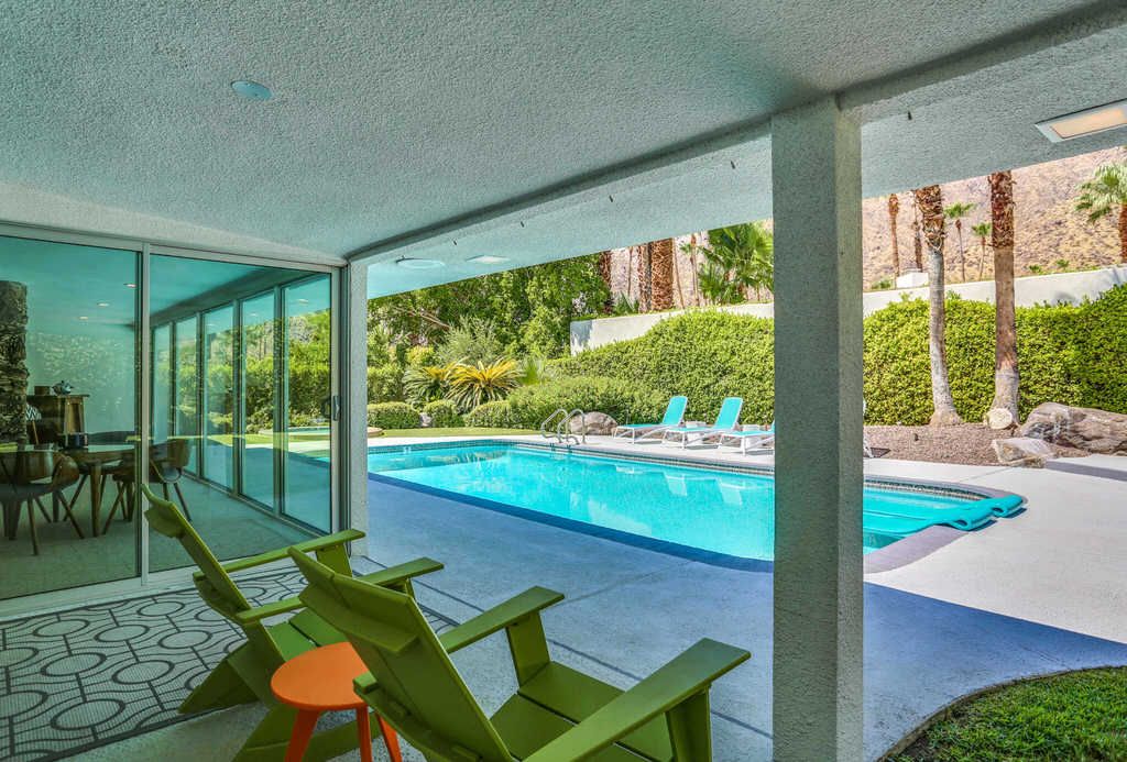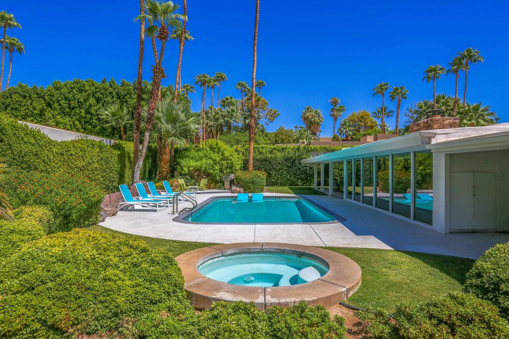This Palm Springs vacation home was completely remodeled in 2015. The open great room is large and inviting and retains the quintessential mid-century modern design elements of the soaring post and beam ceilings, walls of glass overlooking the pool and spa, and exposed natural stone chimney.