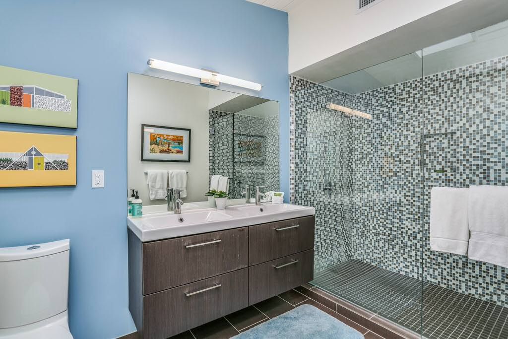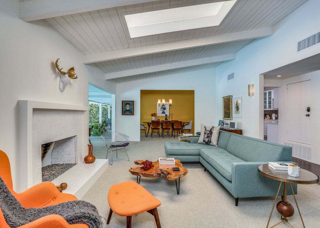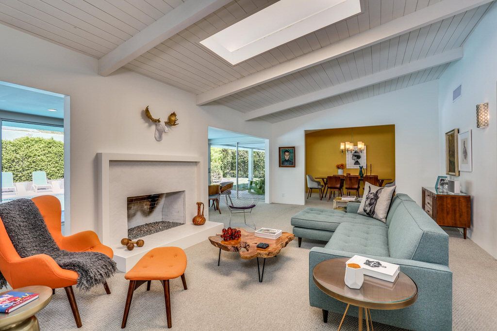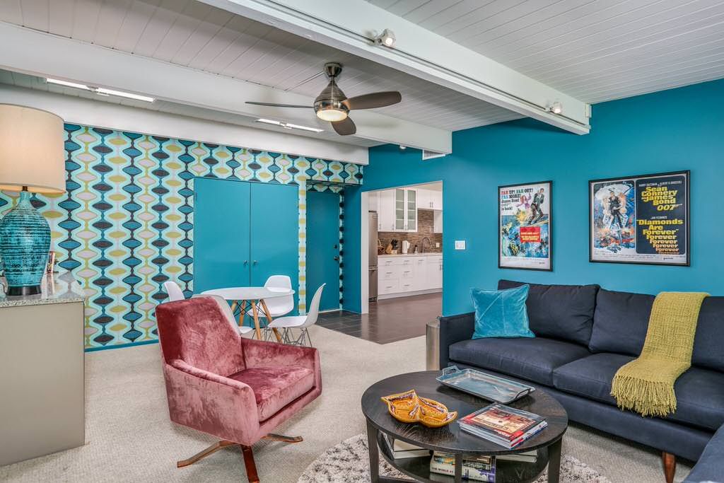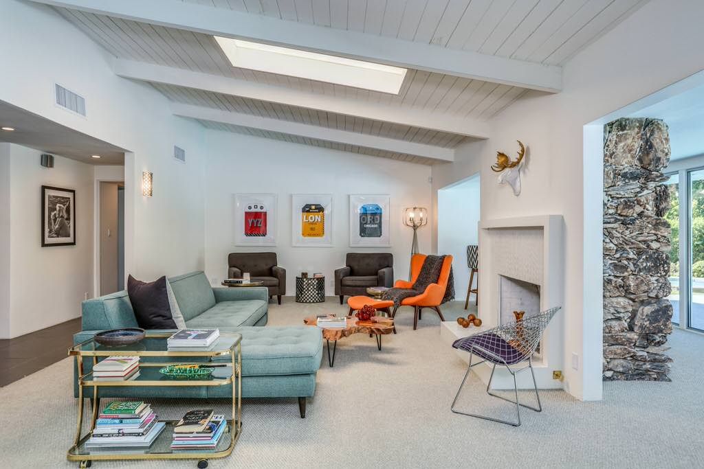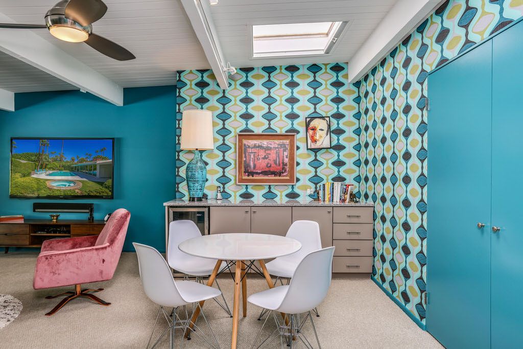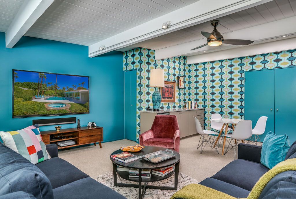 This Palm Springs vacation home was completely remodeled in 2015. The open great room is large and inviting and retains the quintessential mid-century modern design elements of the soaring post and beam ceilings, walls of glass overlooking the pool and spa, and exposed natural stone chimney.