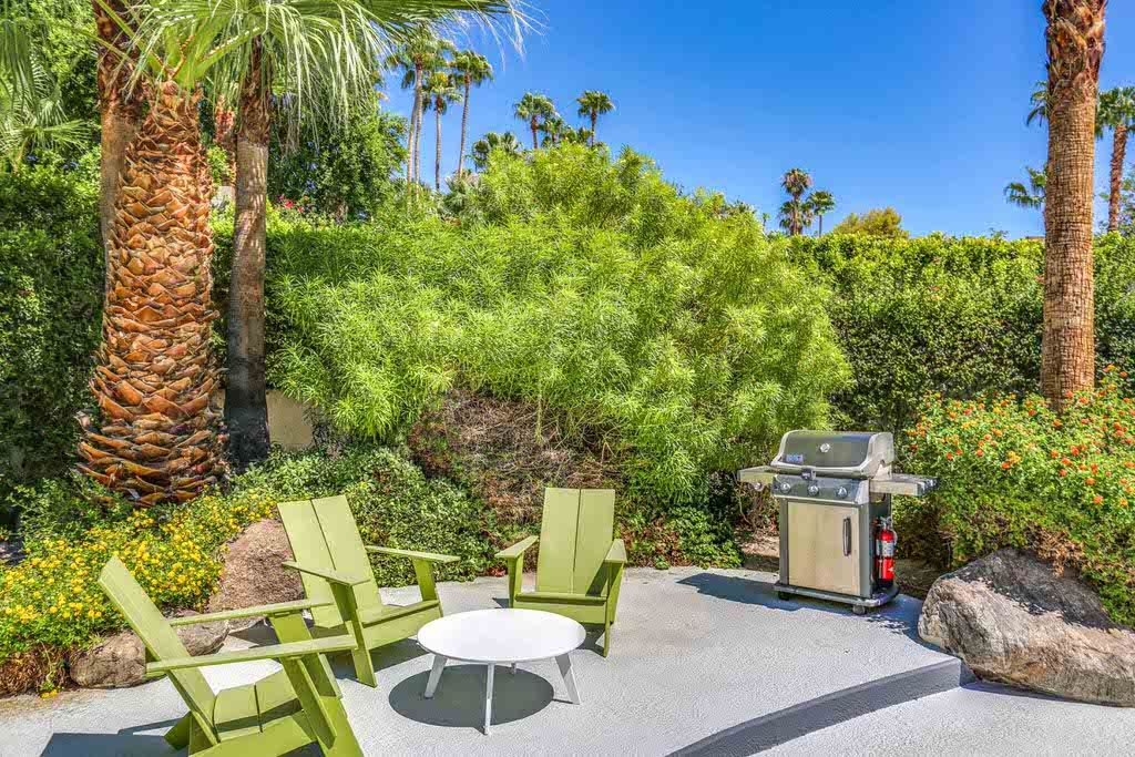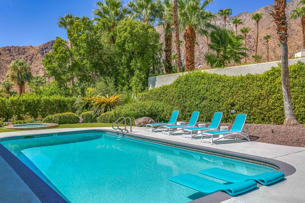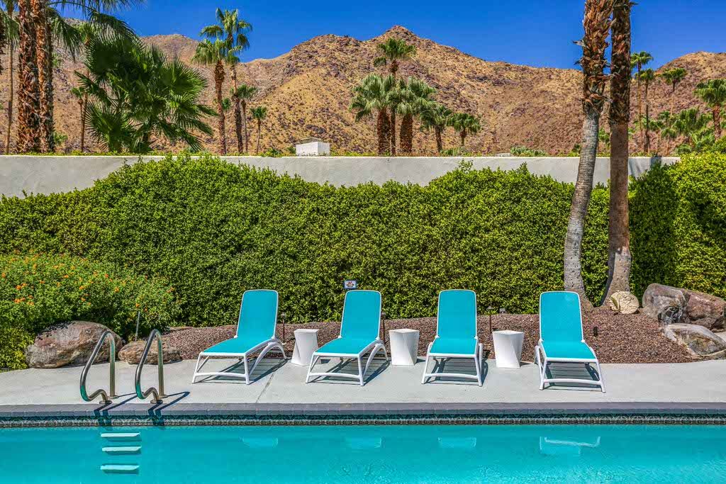 The lush backyard oasis of this stylish Palm Springs vacation home can be accessed from the great room, dining room, media room, and master bedrooms through sliding glass doors. Enjoy sunny days and warm nights lounging by the sparkling pool, soaking in the newly added in ground spa, or just admiring the gorgeous mountain views.