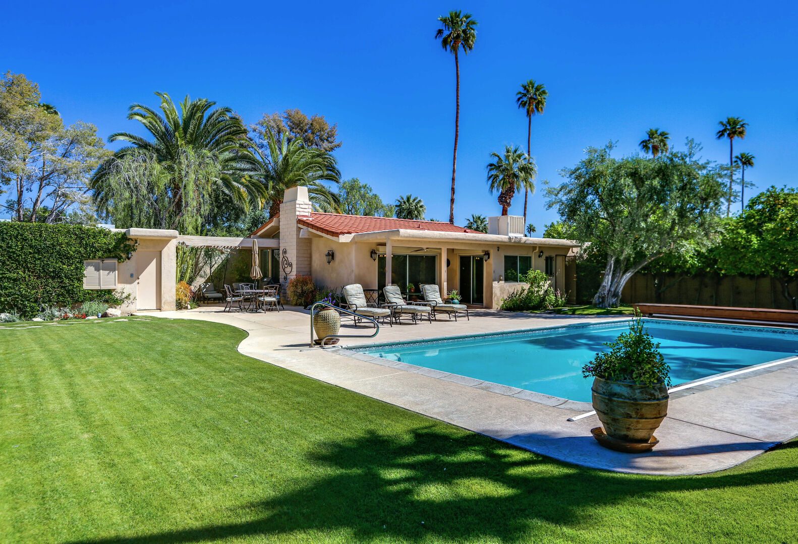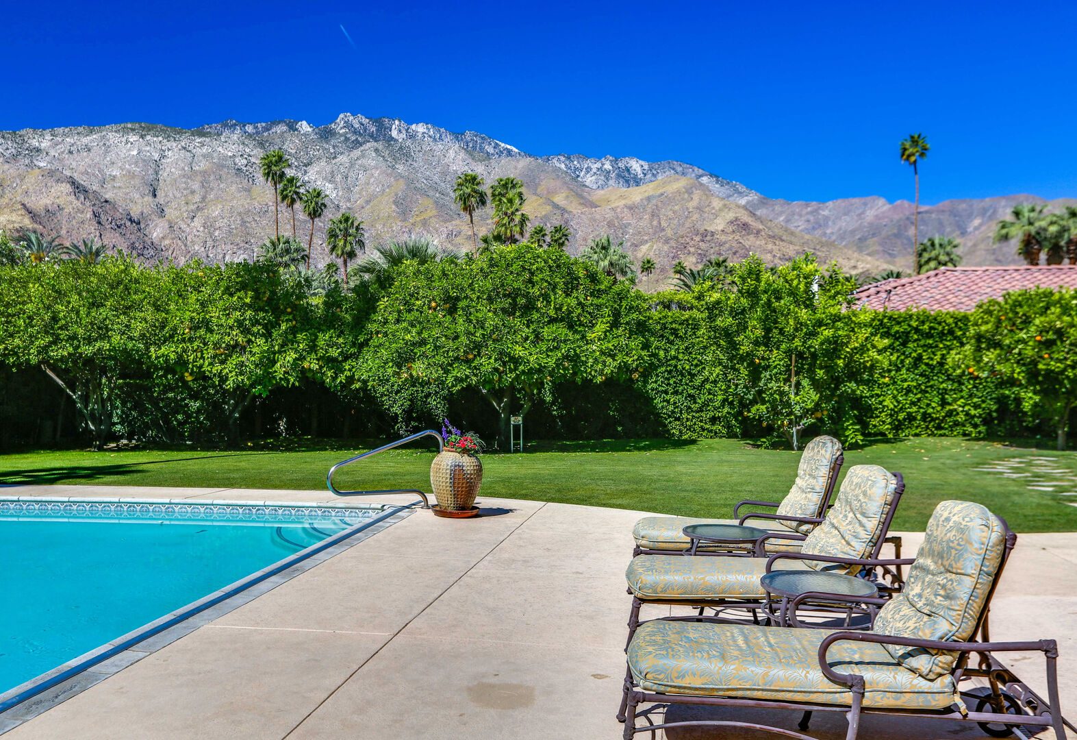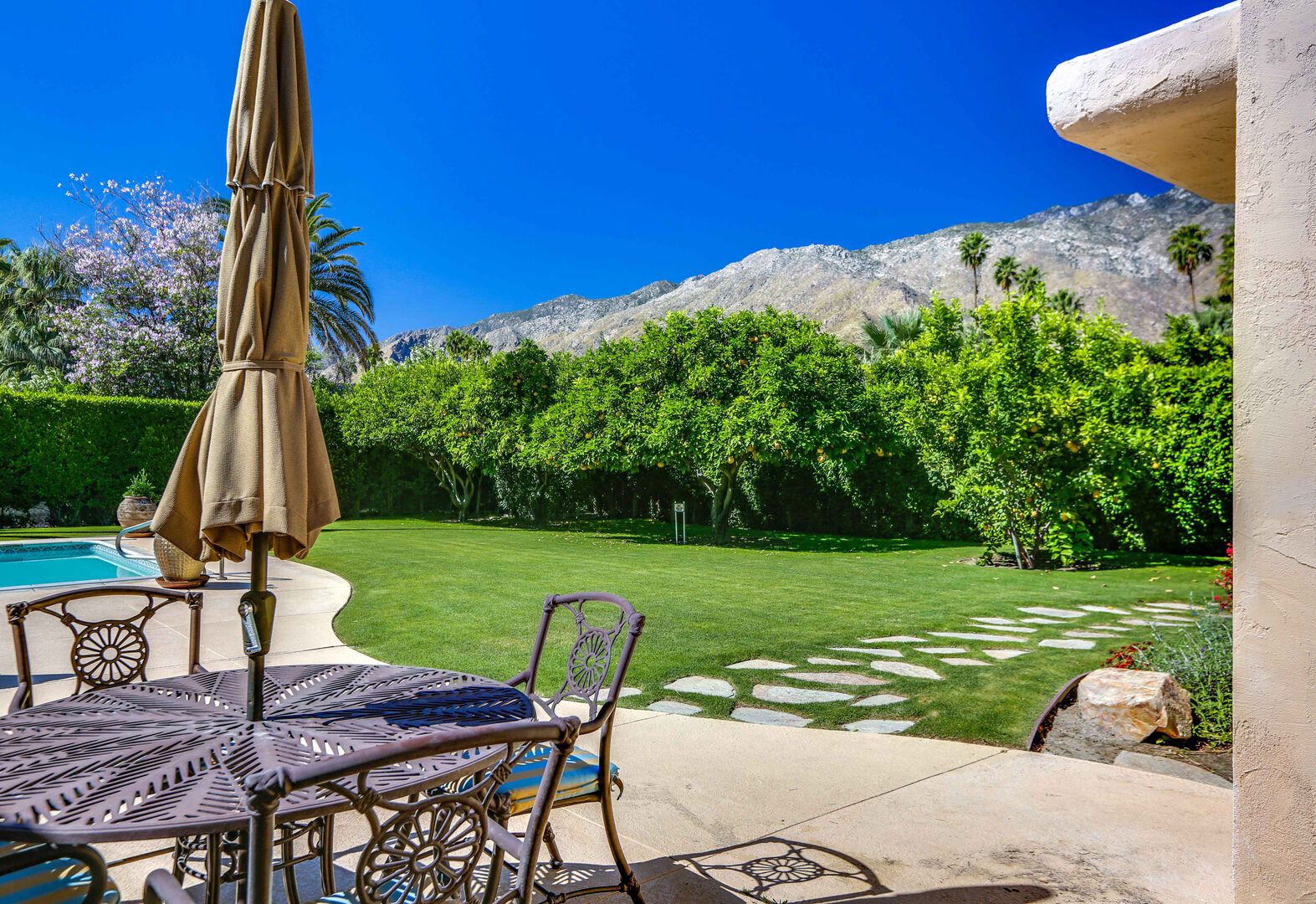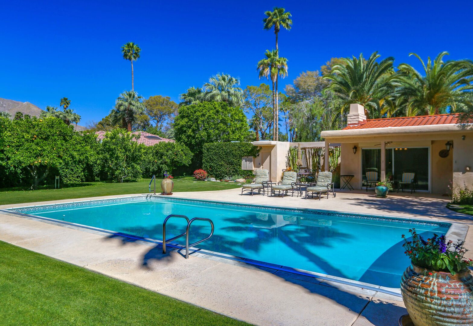 The lush, well maintained backyard has a spa-like feel to it, complete with over sized pool, lounge chairs, dining table, and propane BBQ. It is a perfect spot to relax and round out a day of golf, tennis, other outdoor activities, or even just soak up the Palm Springs sun. The backyard is also surrounded by eleven citrus trees, so feel free to pick some grapefruit and enjoy a nice, fresh grapefruit margarita - our family must have!