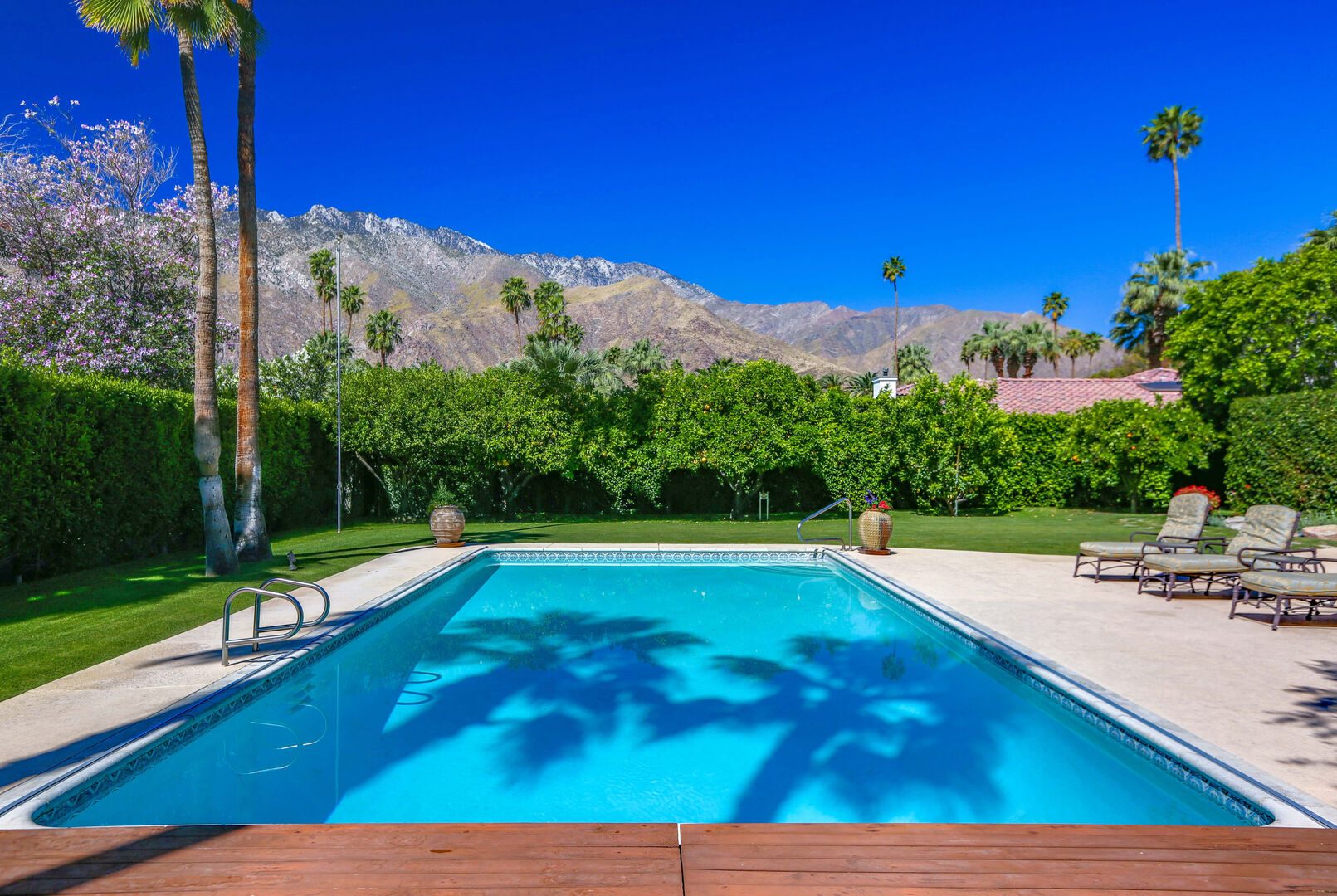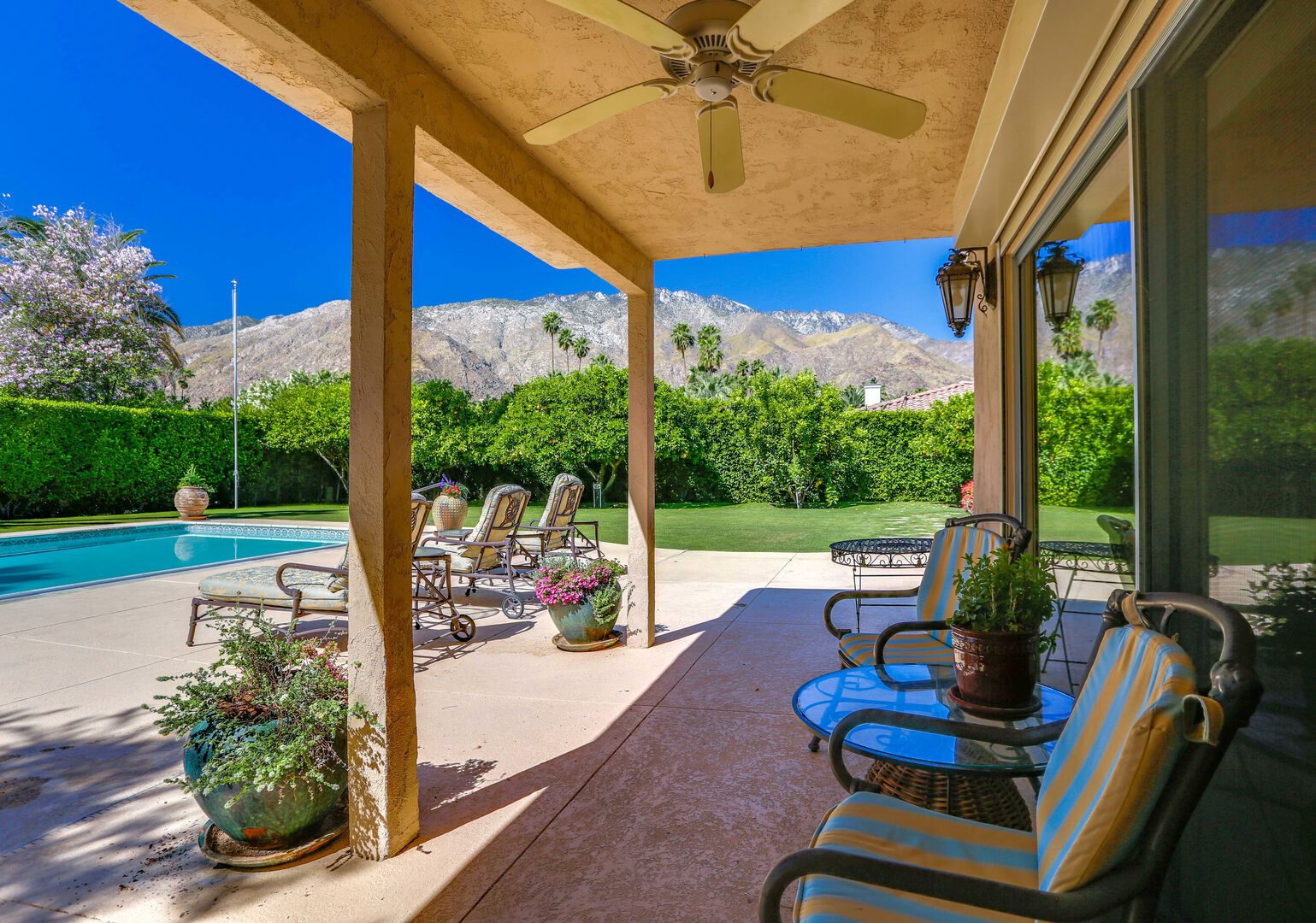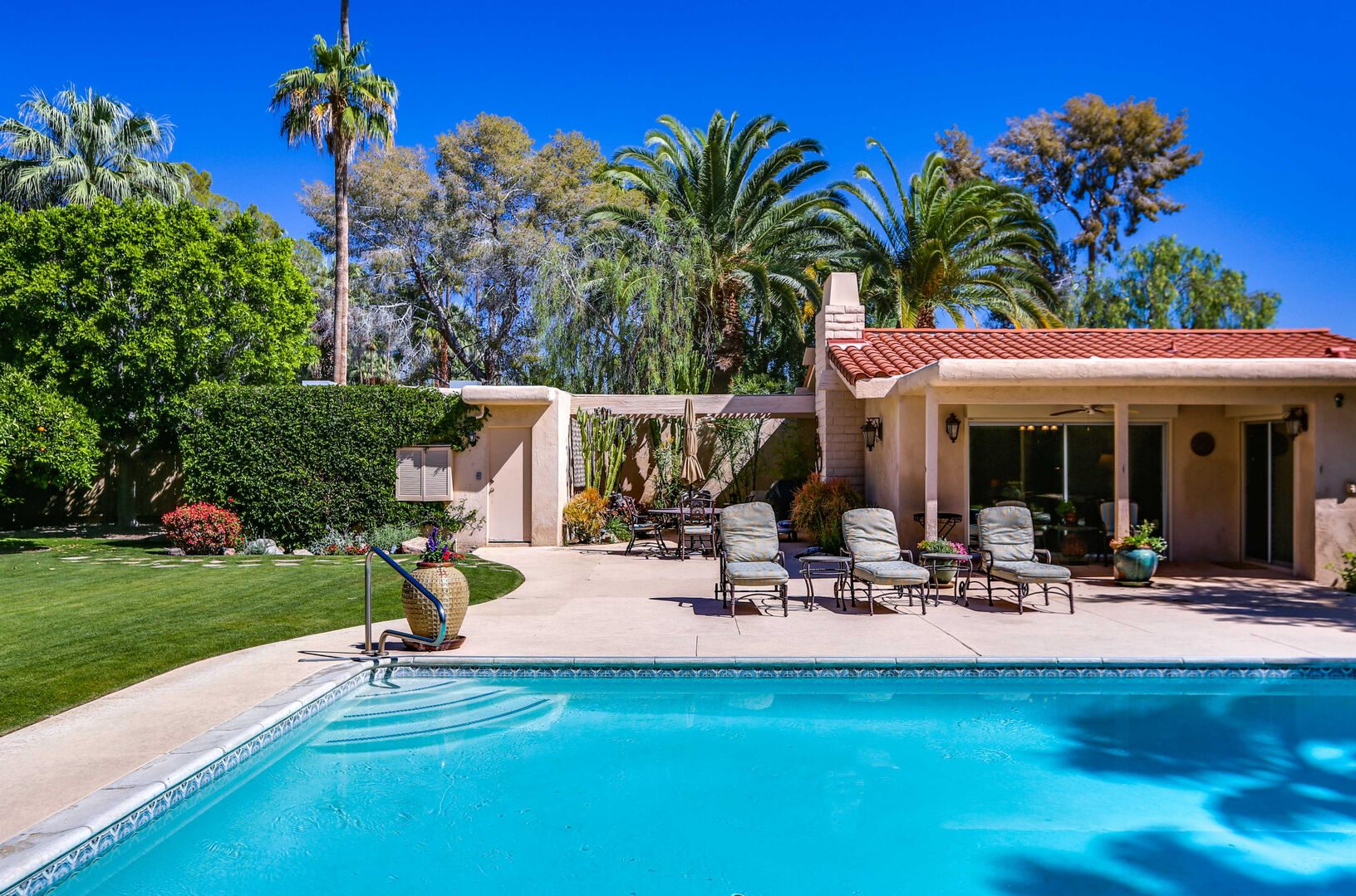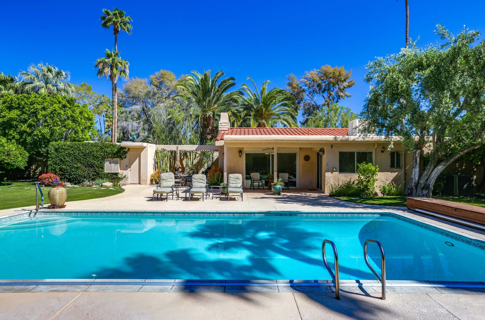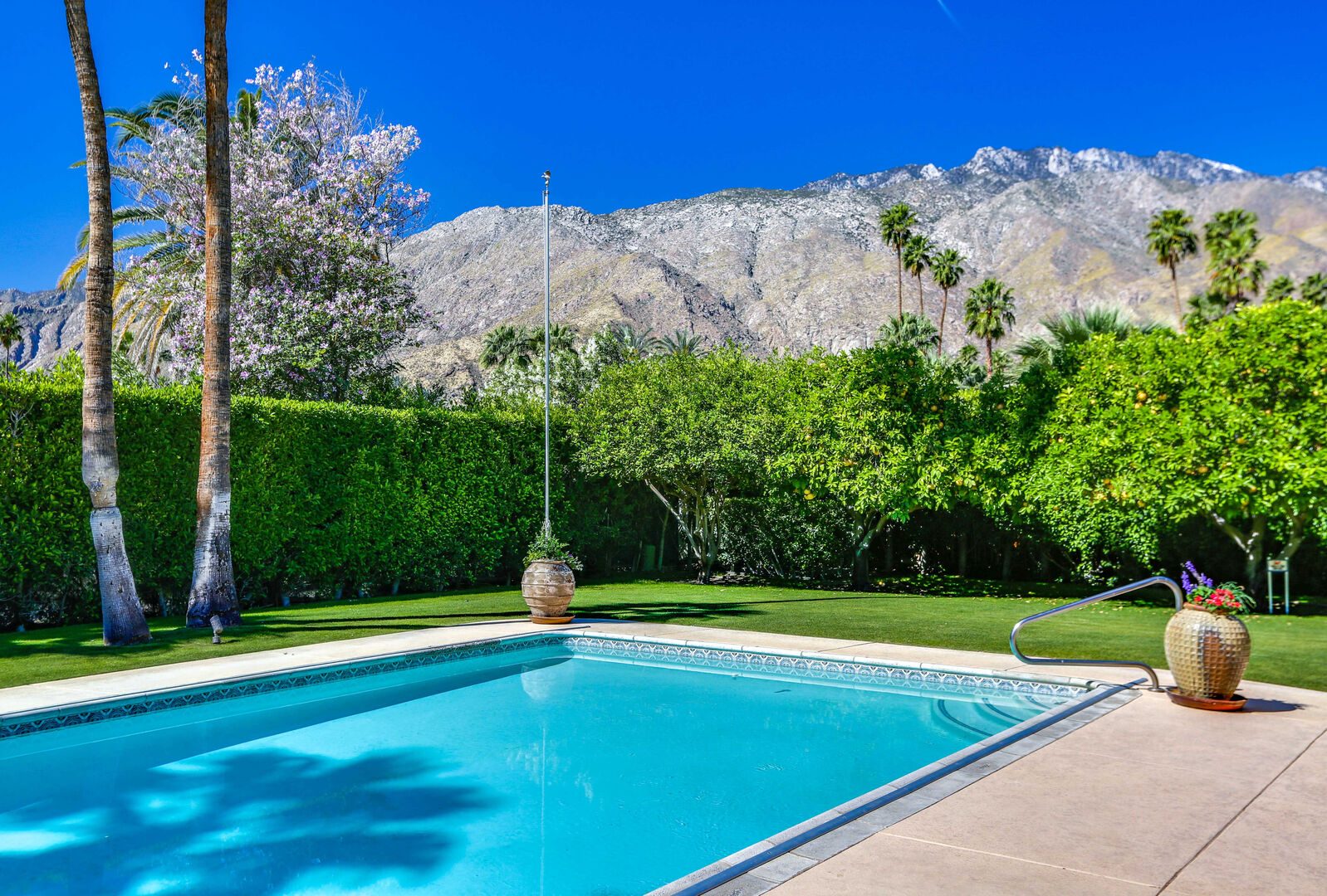 The lush, well maintained backyard has a spa-like feel to it, complete with over sized pool, lounge chairs, dining table, and propane BBQ. It is a perfect spot to relax and round out a day of golf, tennis, other outdoor activities, or even just soak up the Palm Springs sun. The backyard is also surrounded by eleven citrus trees, so feel free to pick some grapefruit and enjoy a nice, fresh grapefruit margarita - our family must have!