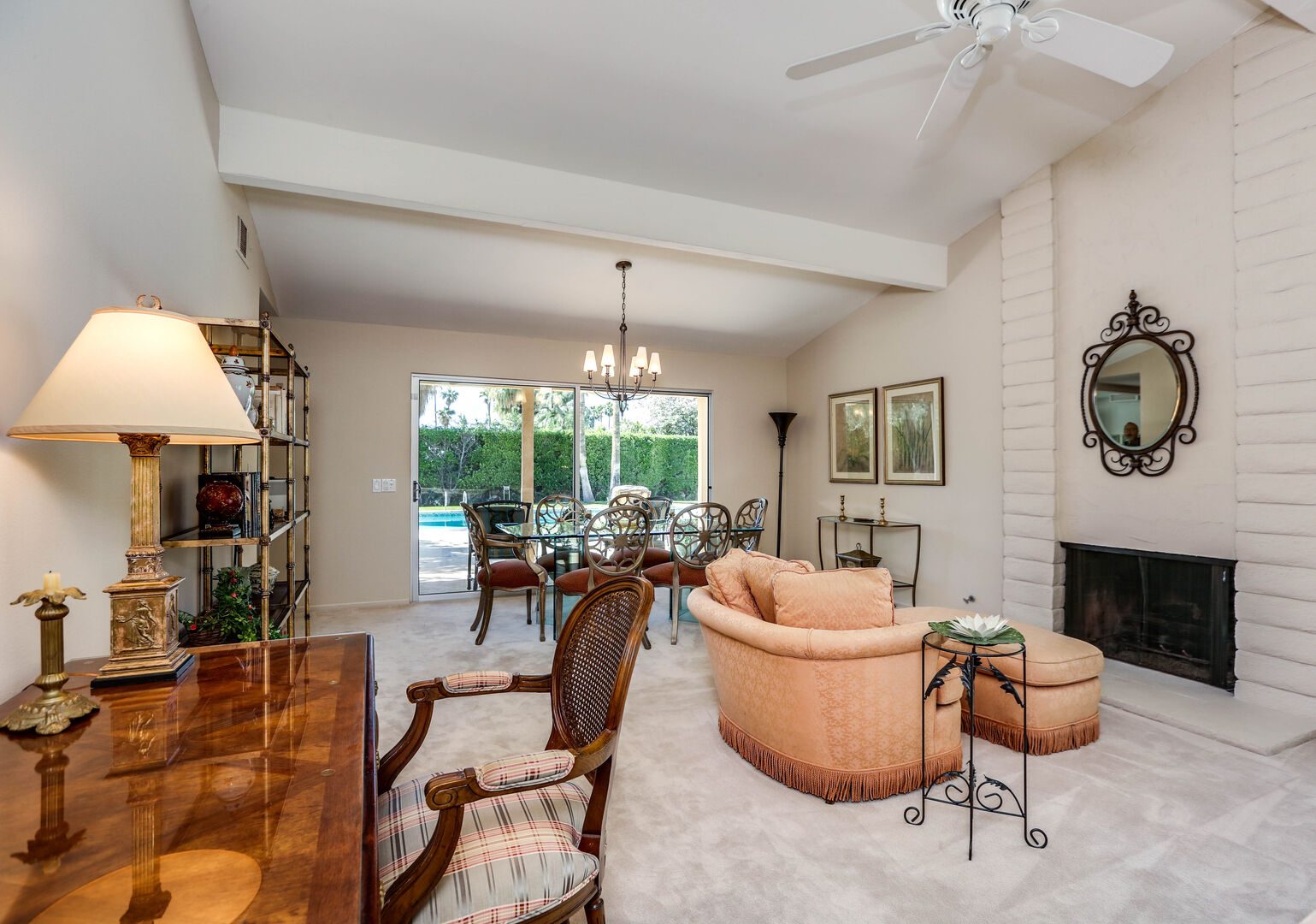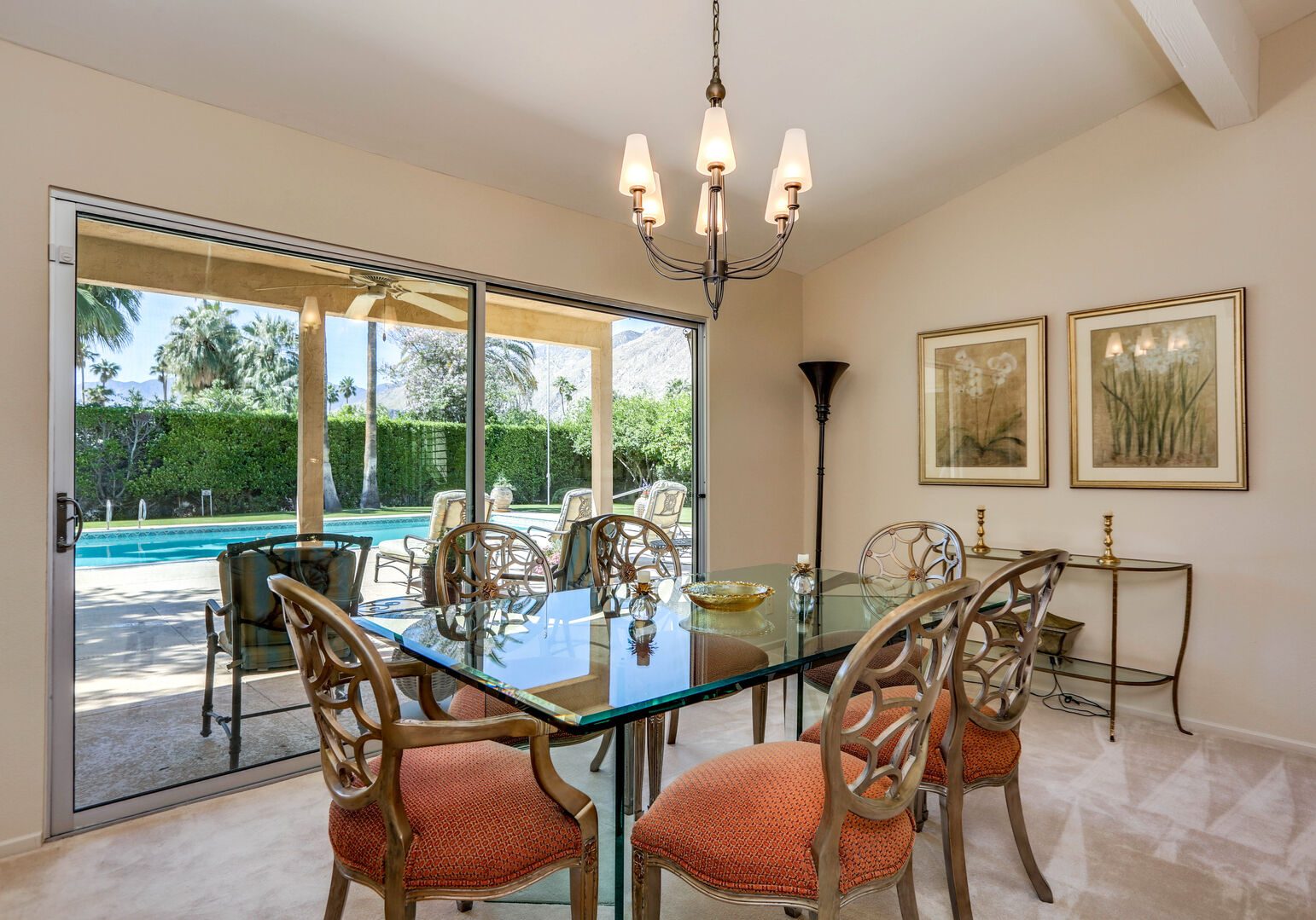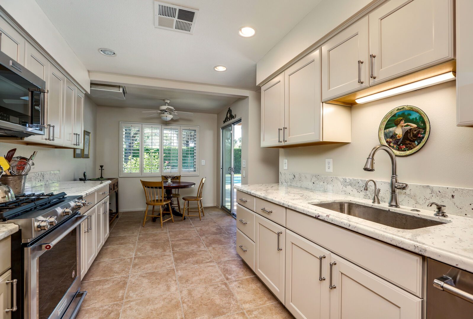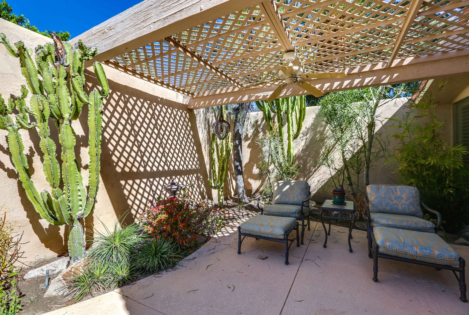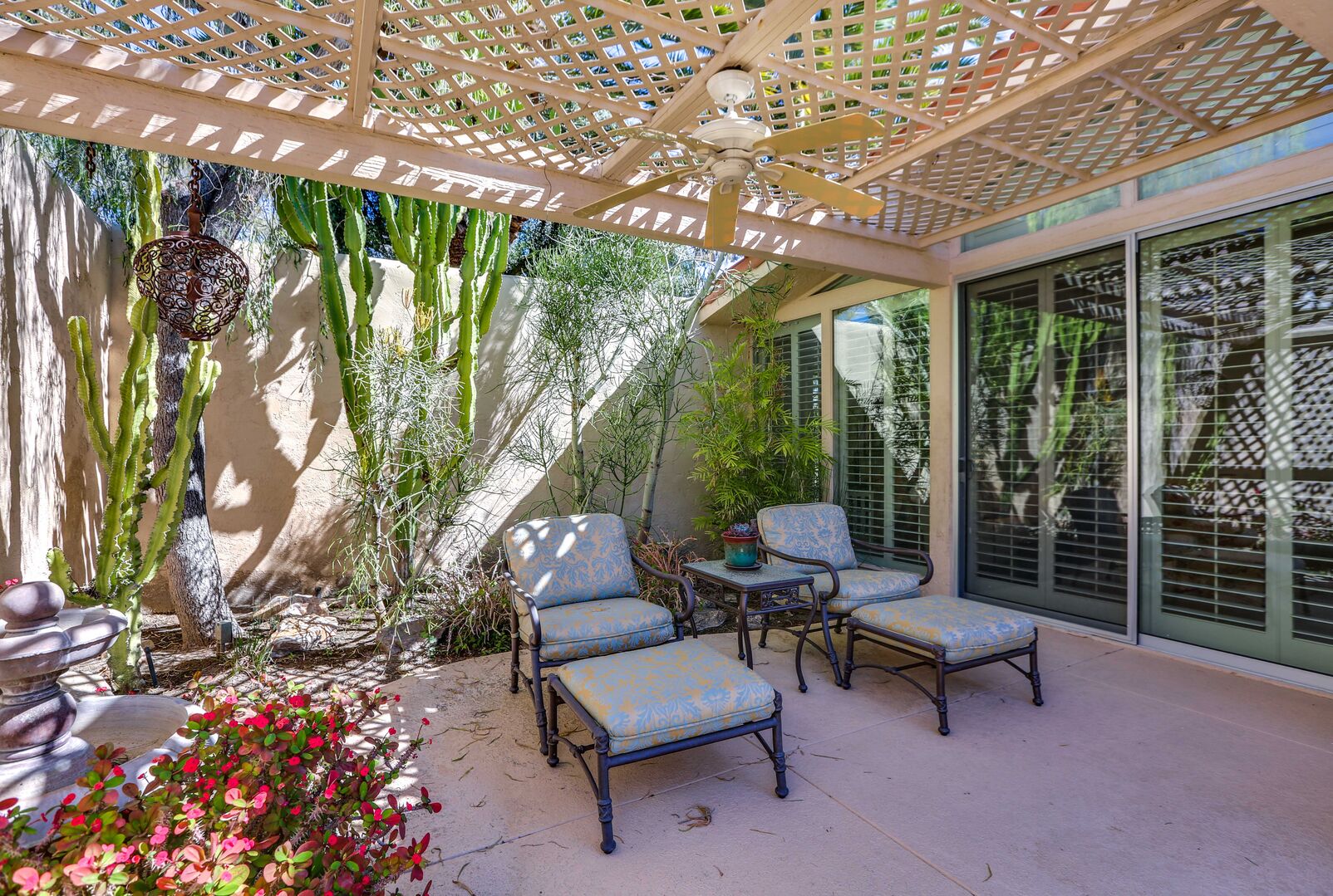 The lush, well maintained backyard has a spa-like feel to it, complete with over sized pool, lounge chairs, dining table, and propane BBQ. It is a perfect spot to relax and round out a day of golf, tennis, other outdoor activities, or even just soak up the Palm Springs sun. The backyard is also surrounded by eleven citrus trees, so feel free to pick some grapefruit and enjoy a nice, fresh grapefruit margarita - our family must have!