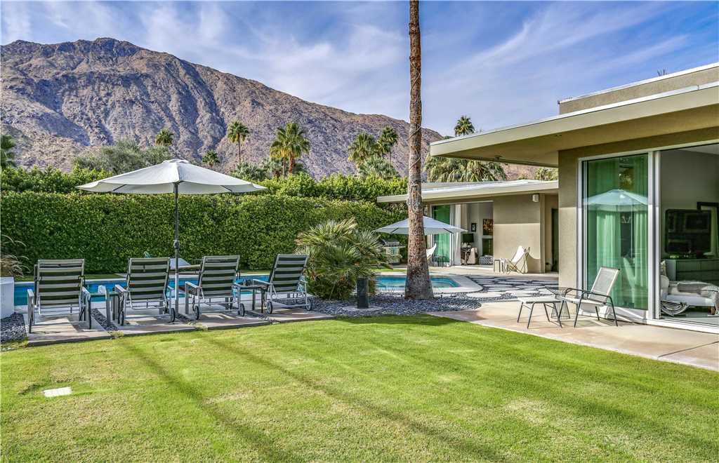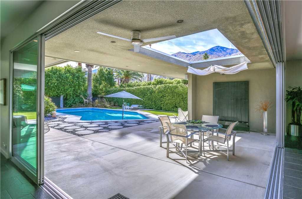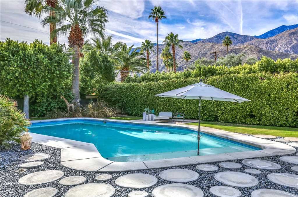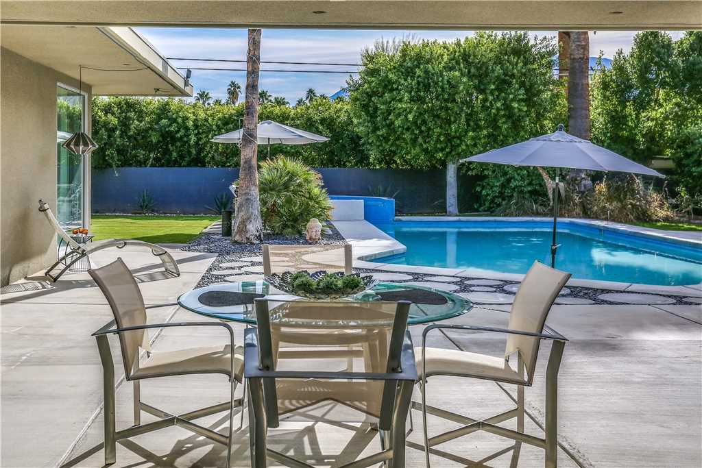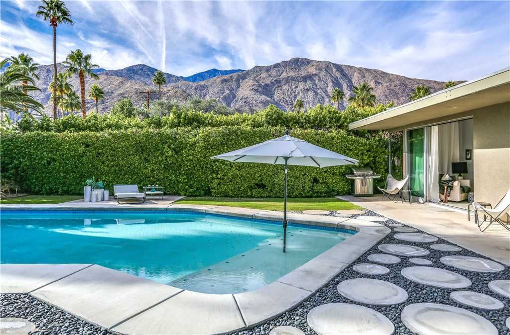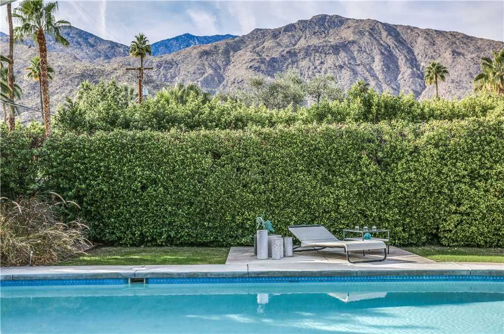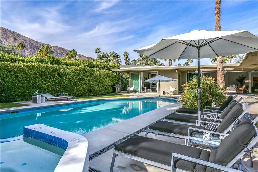 The resort-style backyard allows you to take full advantage of Palm Springs year-round sunshine, featuring a private pool and spa, outdoor lounge chairs, outdoor dining for 6, and magnificent mountain views
