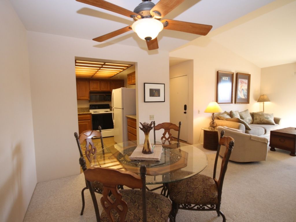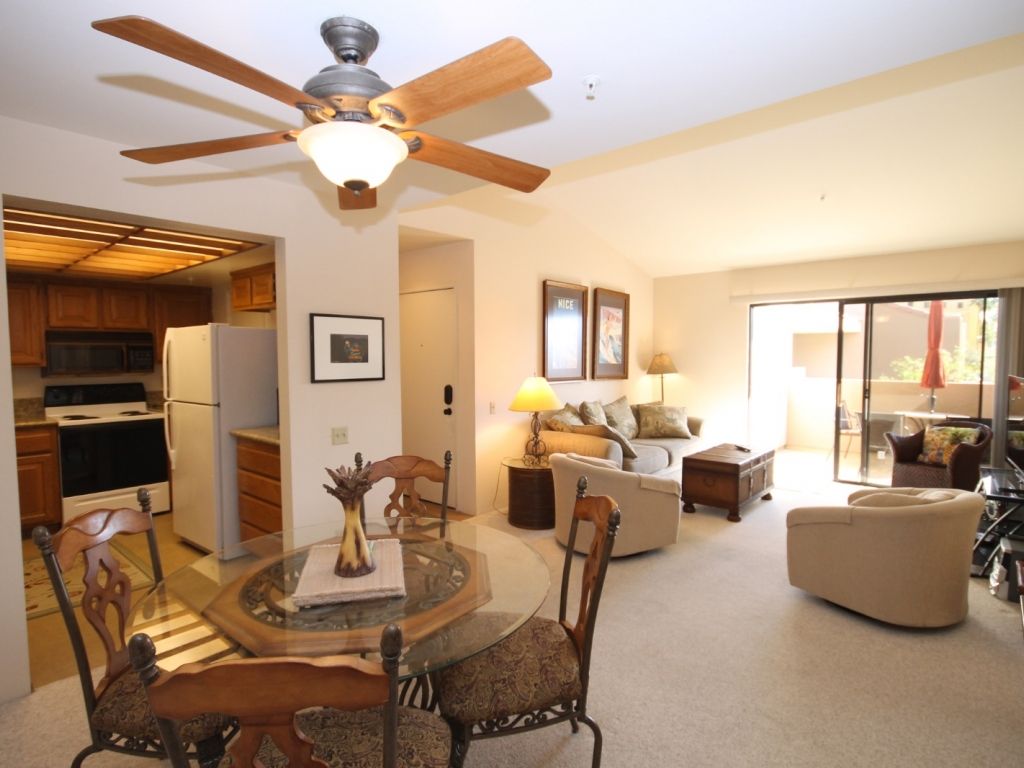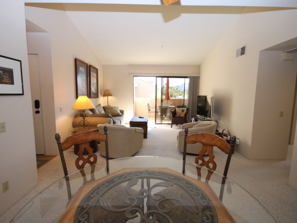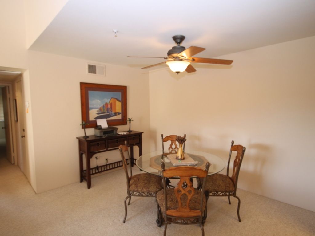 Flowing from living room is the dining room with seating for four, and then the well appointed kitchen beyond. This Palm Springs vacation condo is equipped with everything you'll need to entertain family and friends. There's ample cookware, bakeware, utensils, and small appliances to make meal preparation a snap. The kitchen also has a large pantry room which houses the front-loading washer and dryer for your convenience.