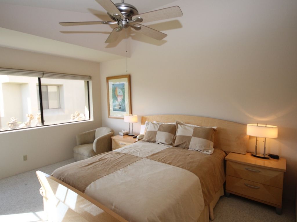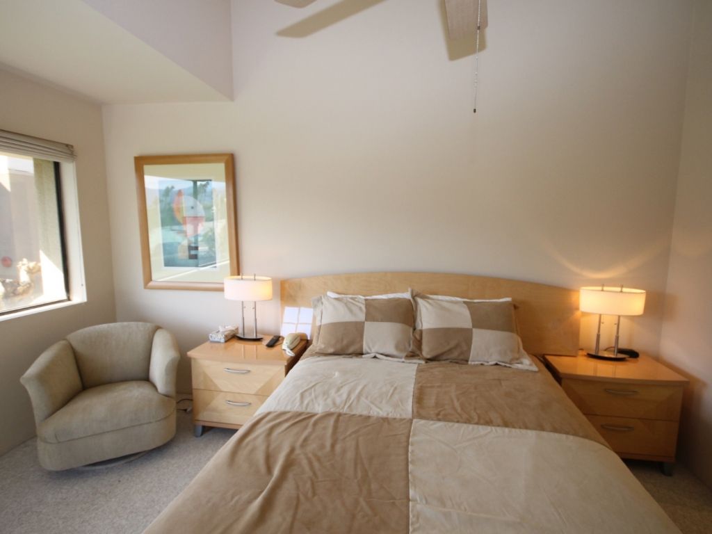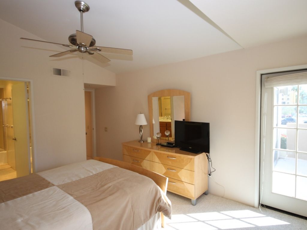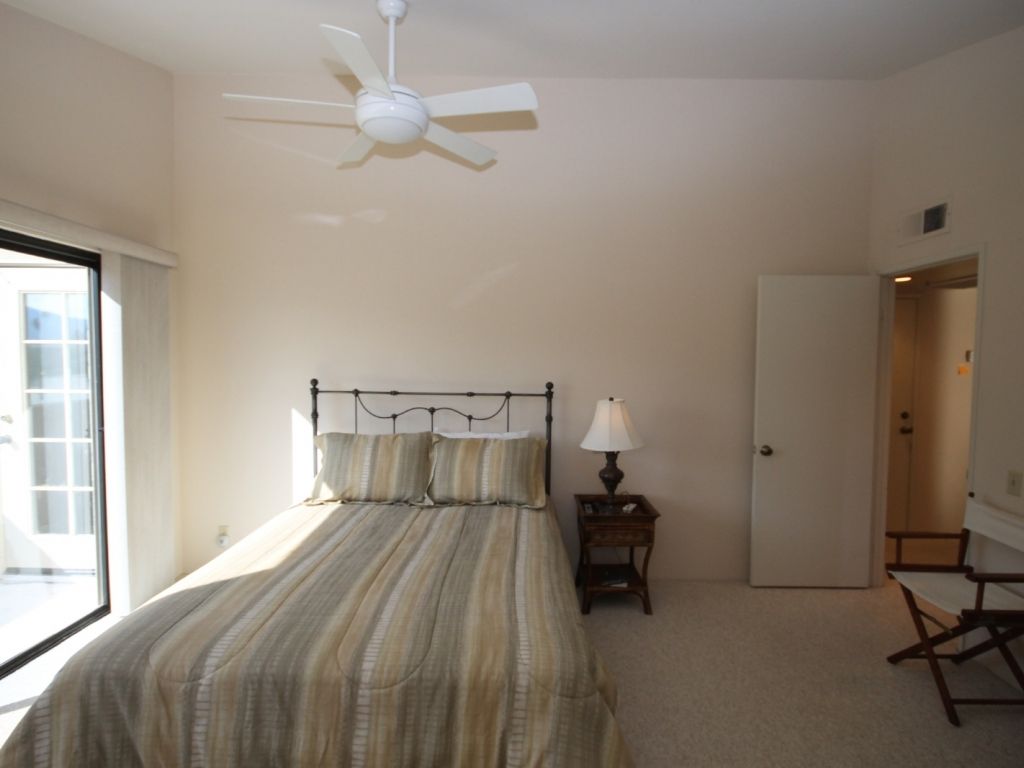 The second master suite features a plush Queen bed, 32"" TV, and door to a private balcony. This comfortable bedrooms shares a bathroom off the hallway.