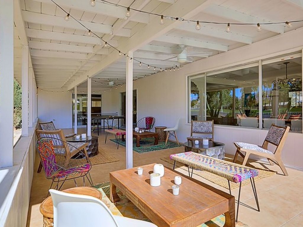 The back patio is furnished with a dining table for 6, and a nearby covered lounge area, making it an ideal place to enjoy meals with family or friends al fresco style. Once you've enjoyed watching the sunset behind the mountain ridge as the brilliant mixture of colors dissolve in the dark desert sky, cuddle up around the outdoor fire pit with a cup of hot cocoa or a glass of wine and share stories as the stars above come to life.