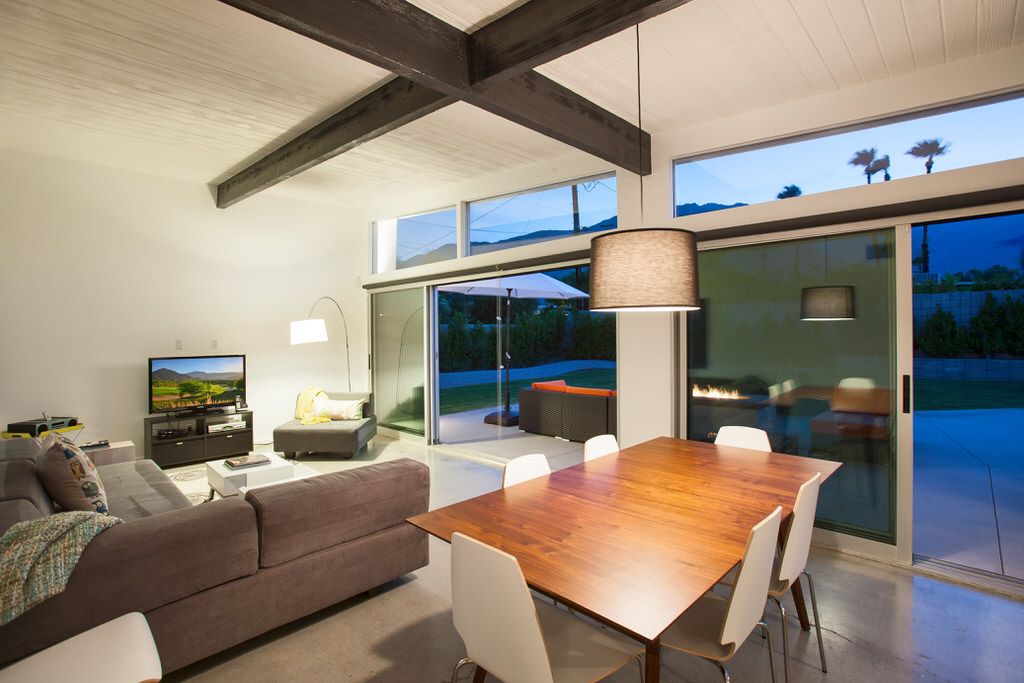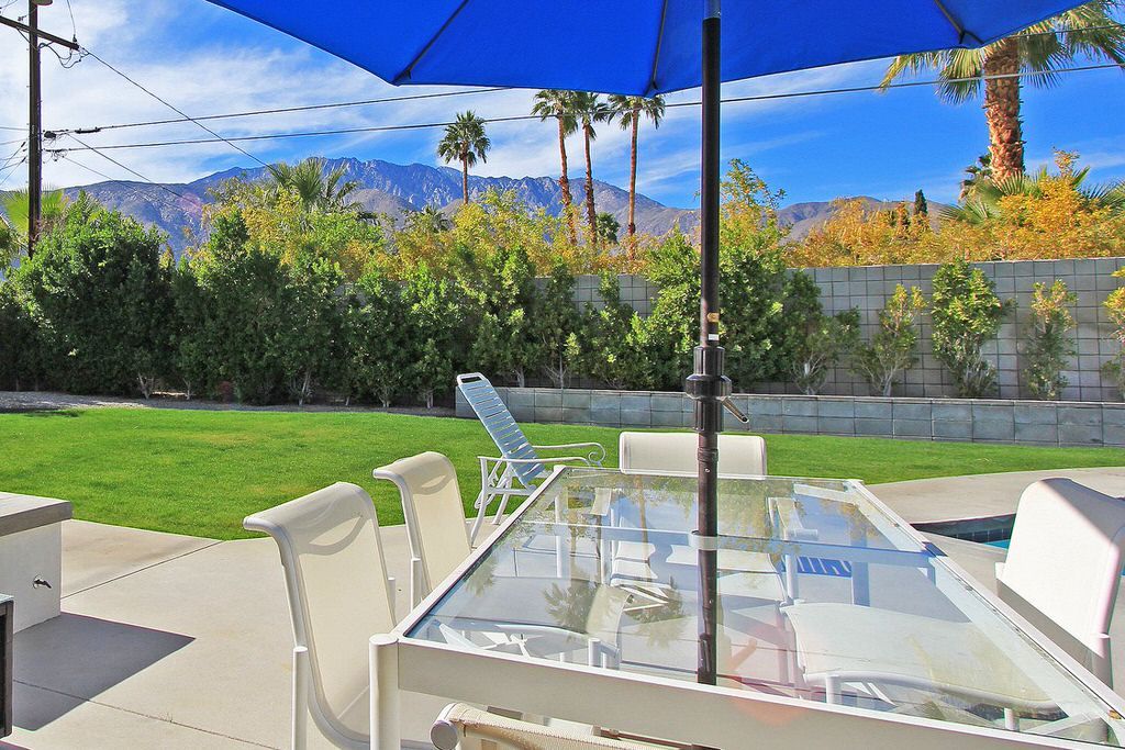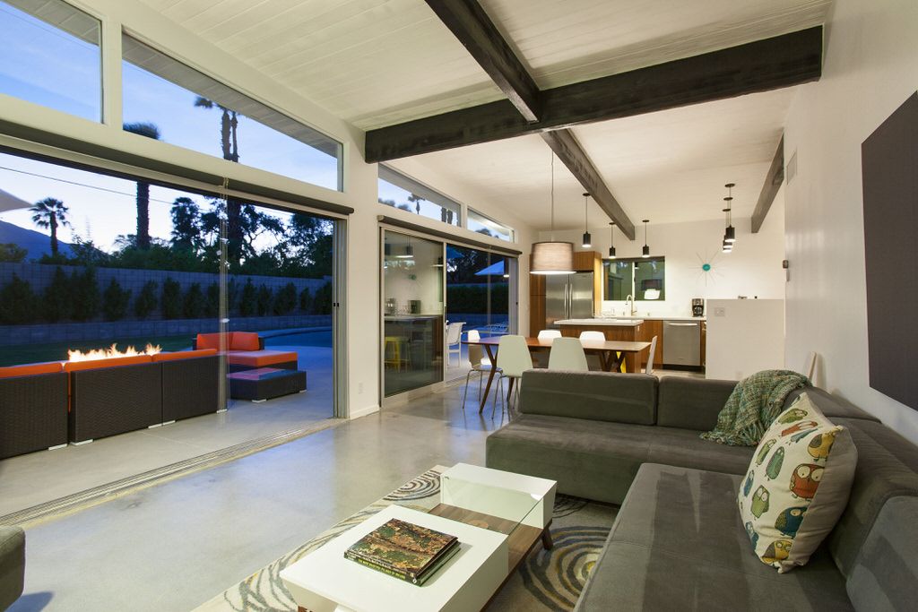 The great room is open and bright with clean sleek design, offering clerestory windows and walls of glass looking out over the private pool and remarkable mountain backdrop. The simple sliding glass doors of the 50's have been replaced with top-of-the-line expansive Fleetwood pocket doors that brings together the indoor and outdoor living that makes Palm Springs such a special vacation home destination. Seamless transition from inside to outdoors makes this an ideal midcentury modern vacation home.