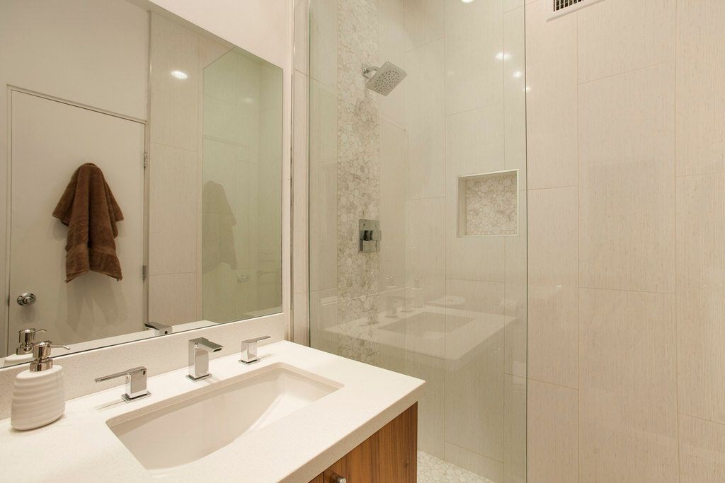 You'll find the kitchen in this midcentury modern vacation home is a chef's delight, featuring stainless steel appliances, abundant quartz countertop prep space, gas range, and all of the small appliances you'll need to prepare delicious meals for friends and family.