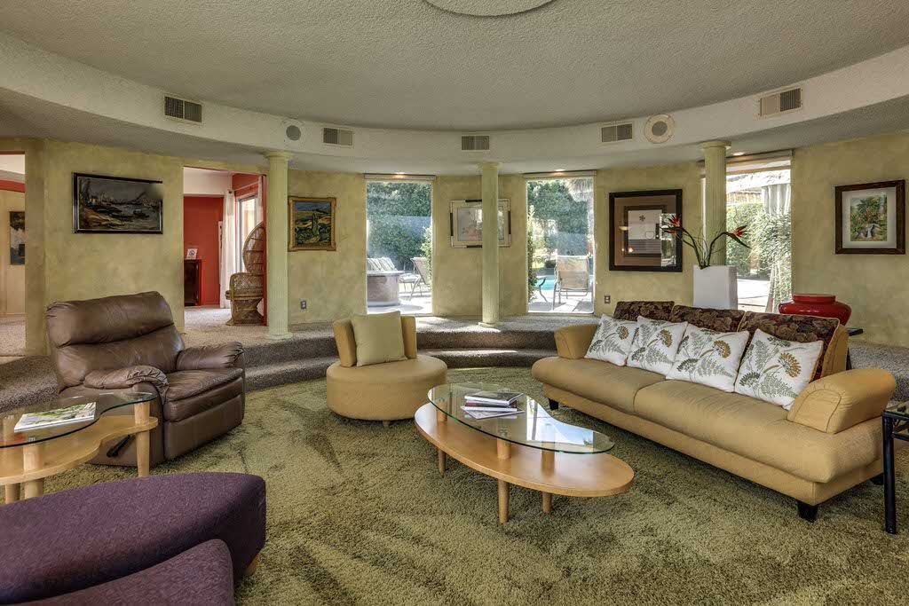 The unique living room is a step-down area that mirrors the shape of the pool - a circular living room with fireplace and floor-to-ceiling glass windows with excellent views.