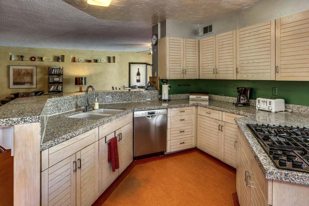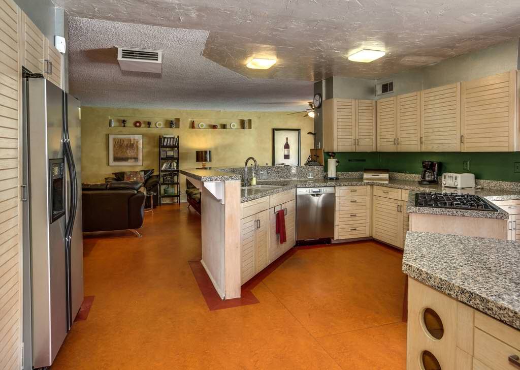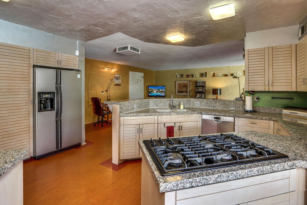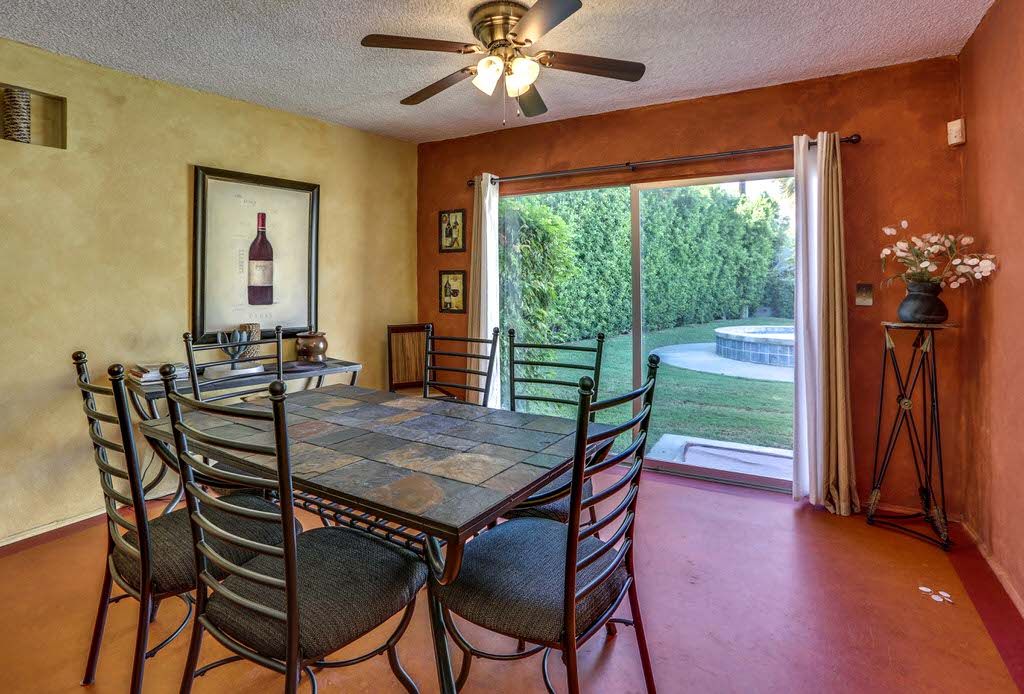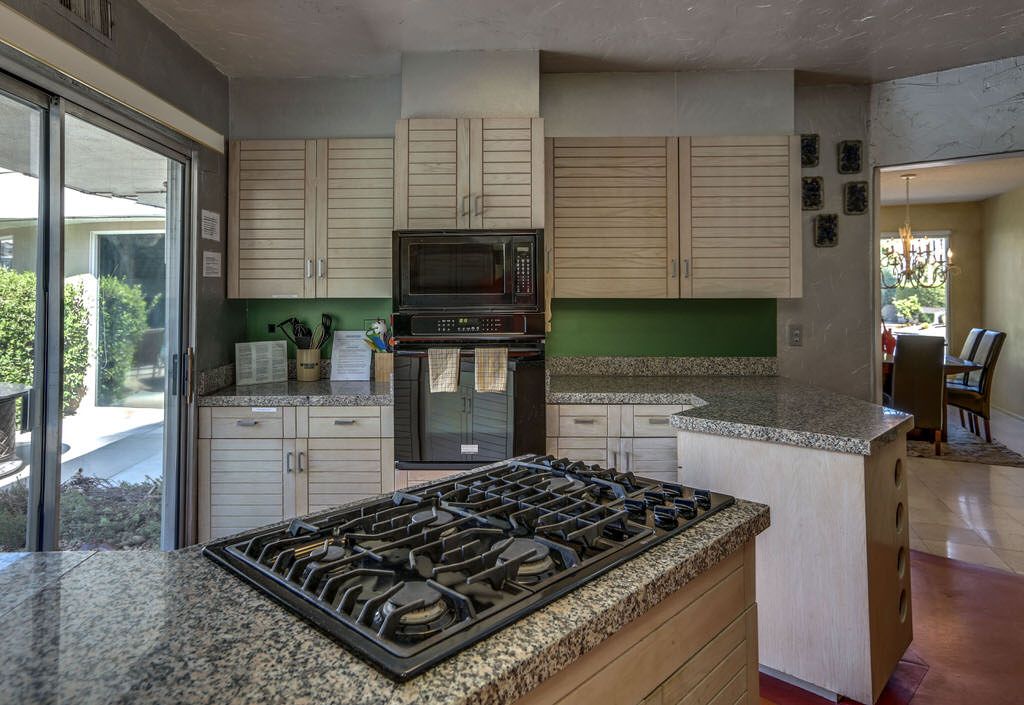 This Palm Springs vacation home features Midcentury furnishings and style with a modern and well-equipped kitchen, as well as a gas grill barbecue on the adjacent patio area. The house has two indoor dining areas, one in the family room and the other a more formal dining area.