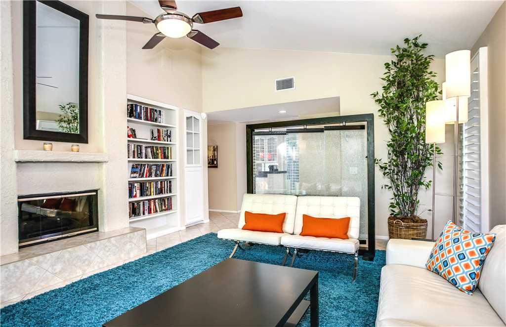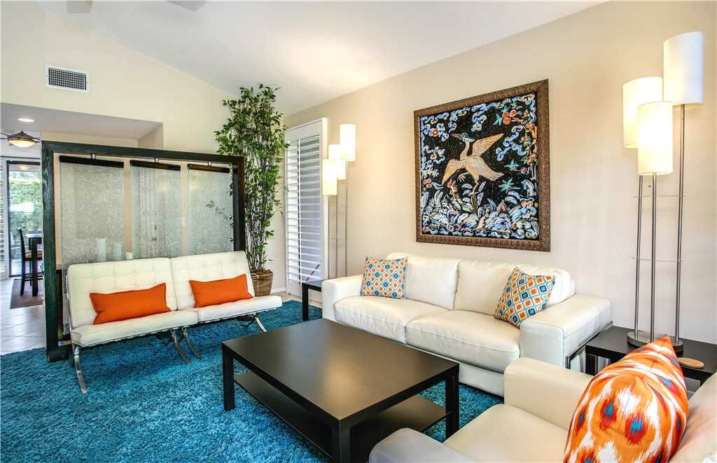 This Palm Springs vacation condo is nicely appointed with new furnishings and modern decor. The light and neutral walls are accented with bright and colorful touches throughout. The living room has a large comfortable couch and chair with additional seating for entertaining. A HDTV and fireplace finish off this welcoming space.