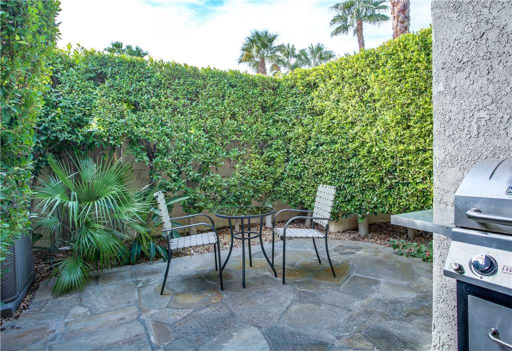 The private enclosed east facing backyard of this Palm Springs vacation rental condo has beautiful mountain views for you and your guests to enjoy. Three chaise lounge chairs can be used to soak in the sun or relax in the shade of the mature trees.
