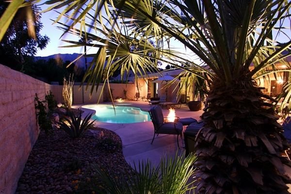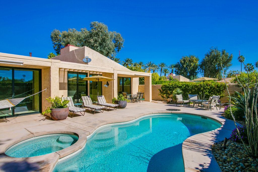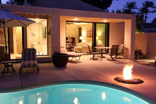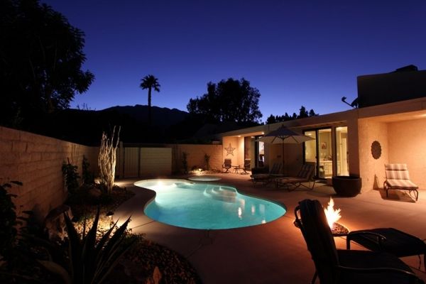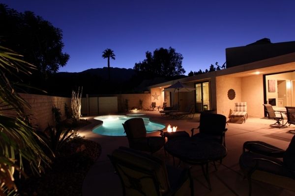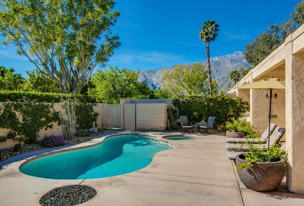 Take full advantage of the Palm Springs year round sunshine in this light and bright vacation rental with a large private walled front and rear courtyards complete with a pebbletec private saline pool and spa and an outdoor gas fire-pit.