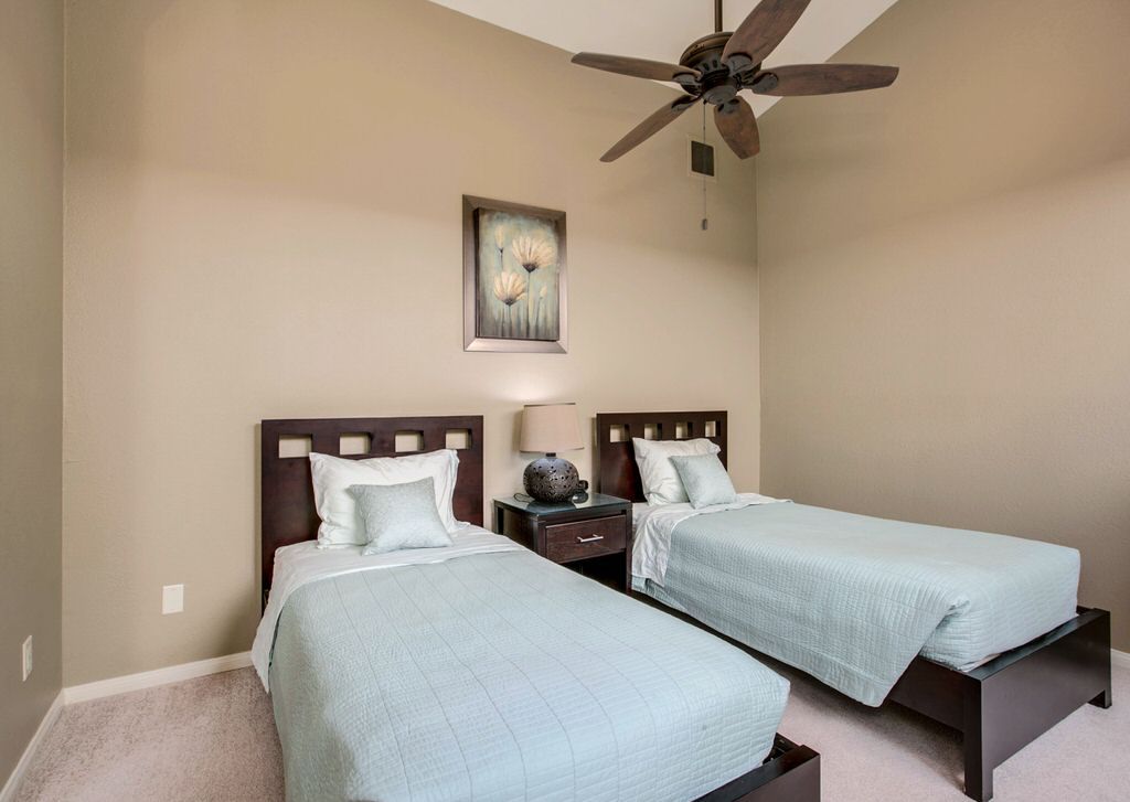 The third bedroom is across the hall and features two twin beds and also overlooks the private central courtyard via glass sliders.