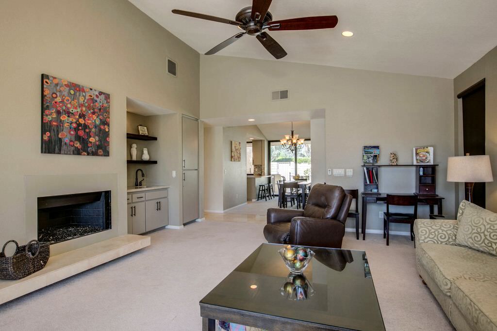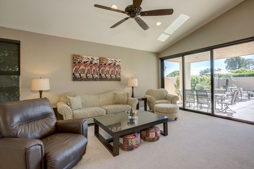 The living room has vaulted ceilings and overlooks the pool deck. Enjoy a large comfortable couch and chairs with additional seating for entertaining. A 40"" TV, fireplace and wet bar finish off this welcoming space.