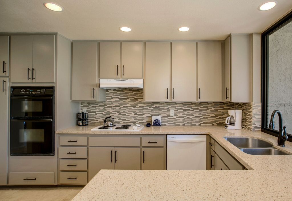 The main living area of this 3 bedroom vacation villa is open to the kitchen and dining room. The upgraded kitchen, with granite counters, is fully equipped with a gas range, numerous small appliances, utensils, and service ware.