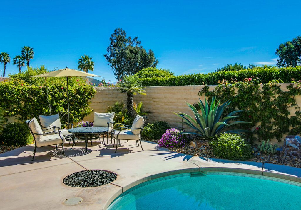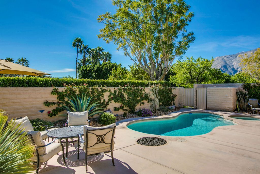 The private enclosed south facing rear yard of this Palm Springs vacation rental villa has beautiful mountain views for you and your guests to enjoy. Three chaise lounge chairs can be used to soak in the sun or relax in the shade of the covered patios. The private saline pool and spa this makes for the perfect getaway.