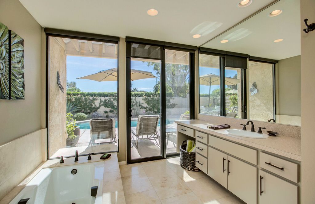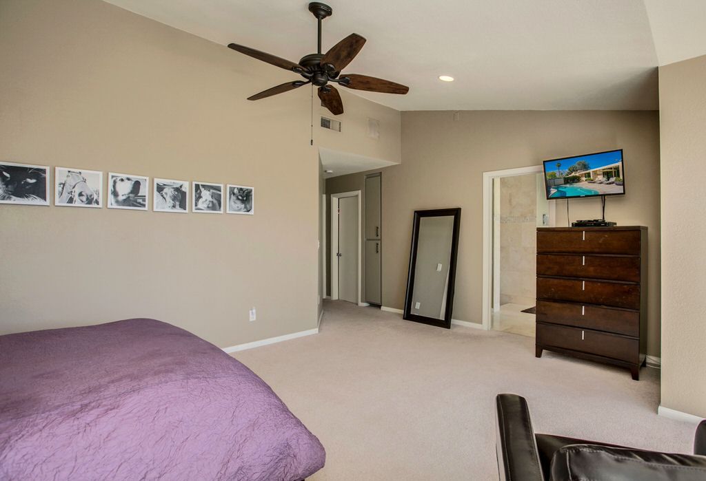 The bedrooms of this Palm Springs vacation home are spacious, clean and comfortable. All bedrooms are equipped with satellite television. The master has a queen bed, a travertine tile en-suite bath and direct access to the private rear courtyard/pool deck. Enjoy a walk in shower, large bathtub, and double vanities all overlooking the rear yard and pool deck.