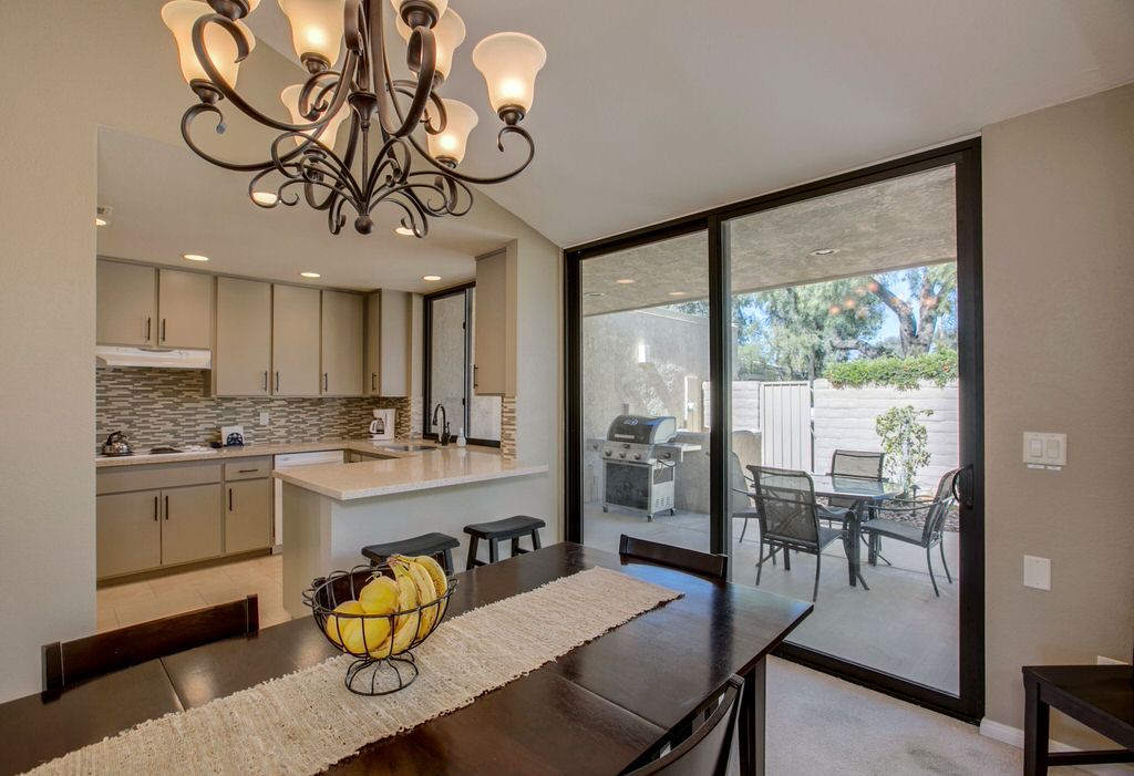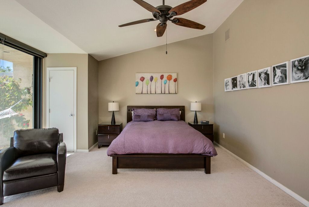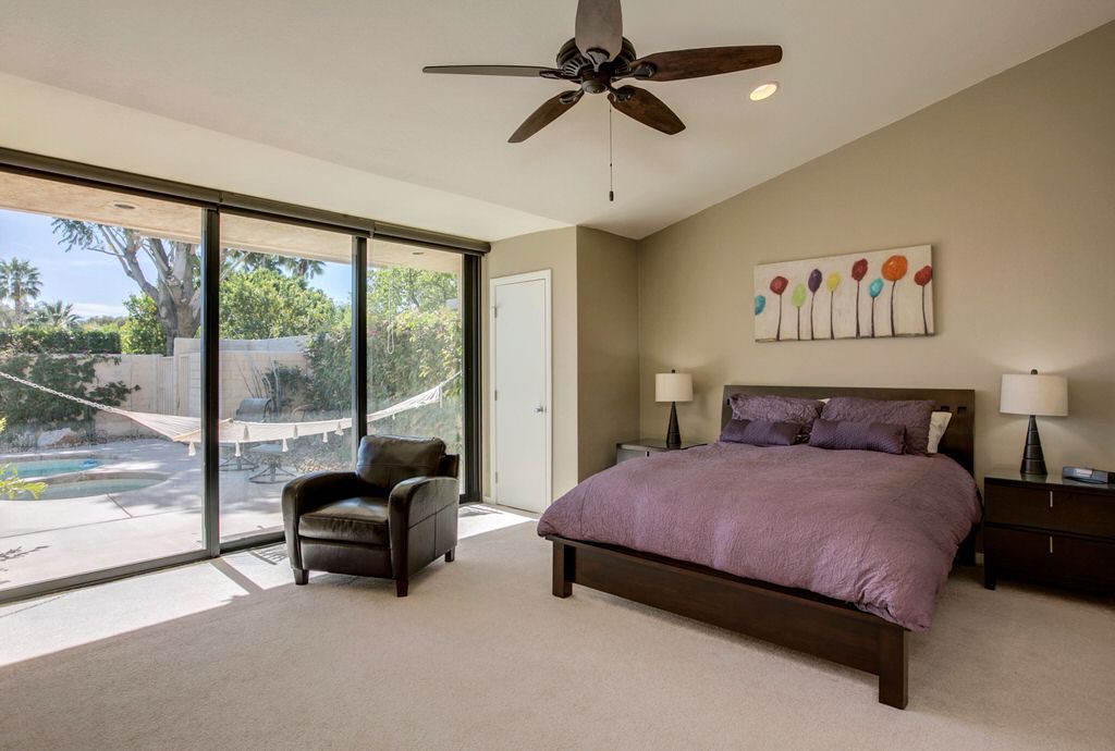 This Palm Springs vacation home is nicely appointed with modern furnishings and decor. The light neutral walls and high ceilings are accented with bright and colorful touches throughout.