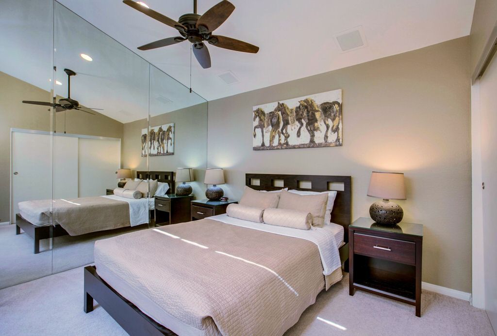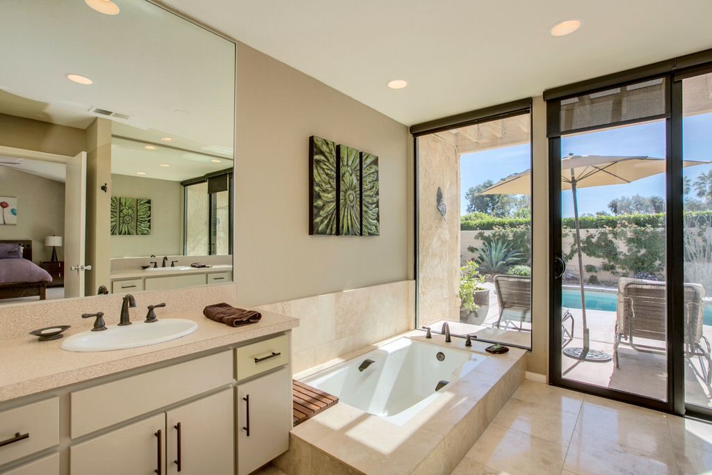The bedrooms of this Palm Springs vacation home are spacious, clean and comfortable. All bedrooms are equipped with satellite television. The master has a queen bed, a travertine tile en-suite bath and direct access to the private rear courtyard/pool deck. Enjoy a walk in shower, large bathtub, and double vanities all overlooking the rear yard and pool deck.