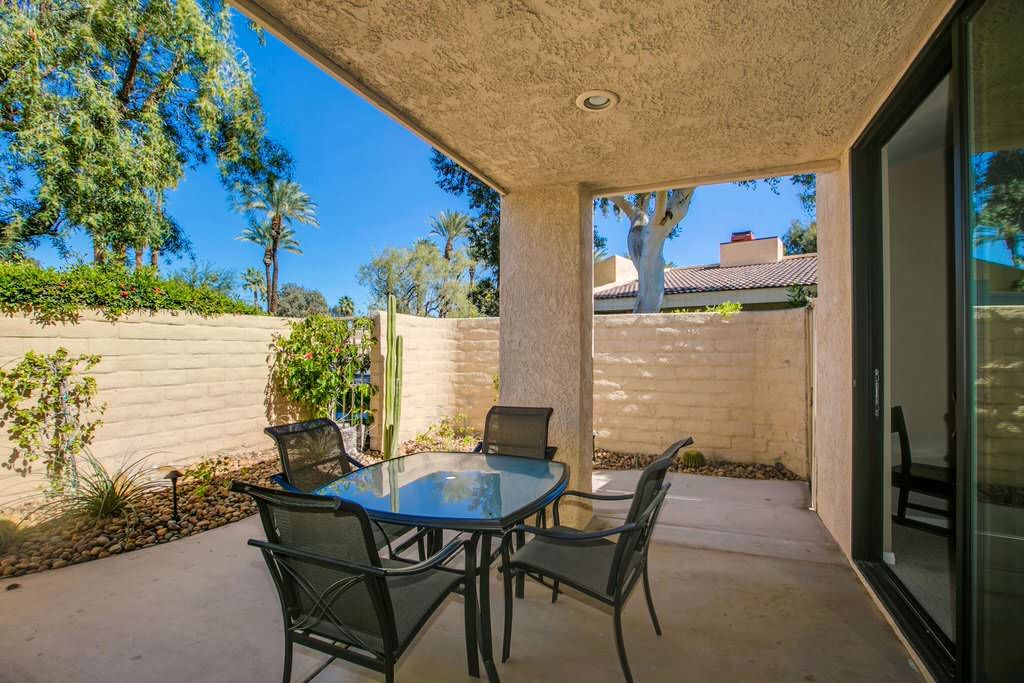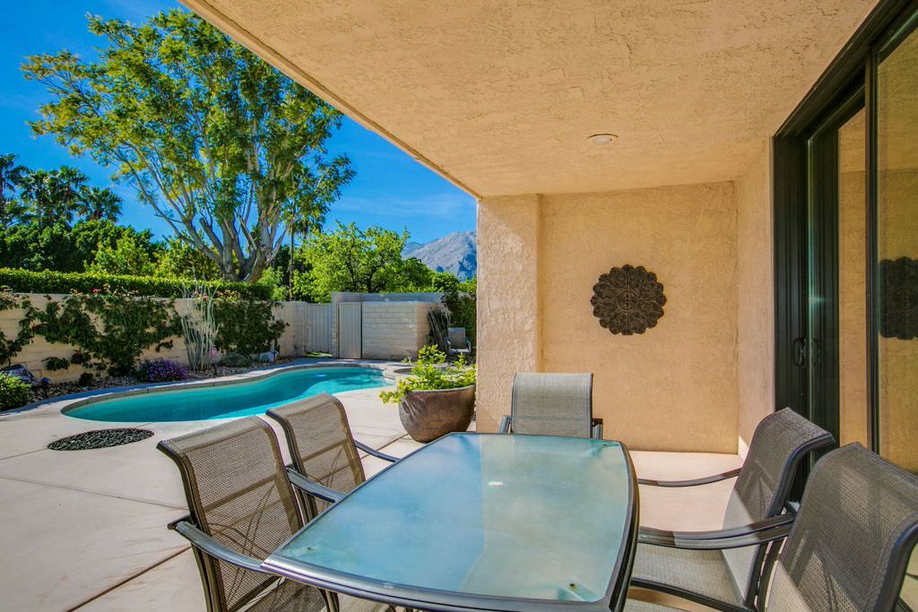 The private enclosed south facing rear yard of this Palm Springs vacation rental villa has beautiful mountain views for you and your guests to enjoy. Three chaise lounge chairs can be used to soak in the sun or relax in the shade of the covered patios. The private saline pool and spa this makes for the perfect getaway.