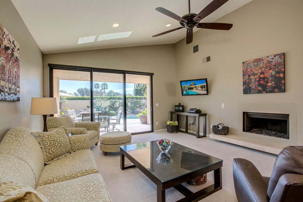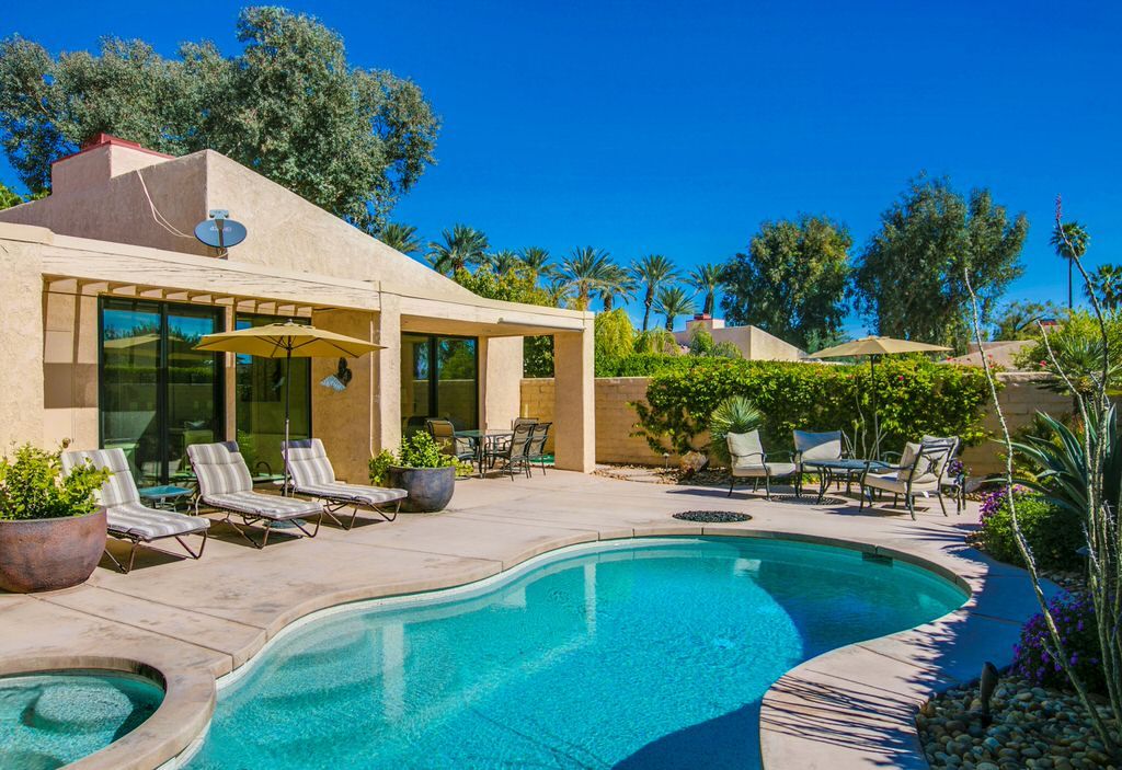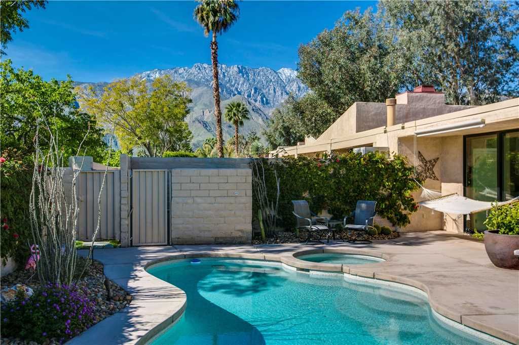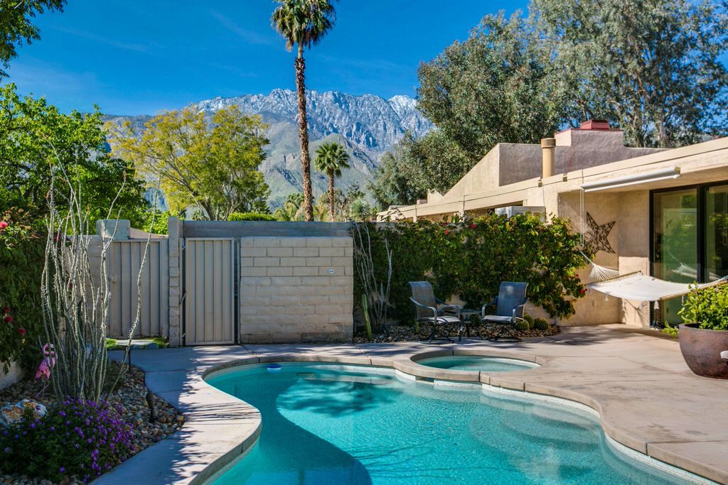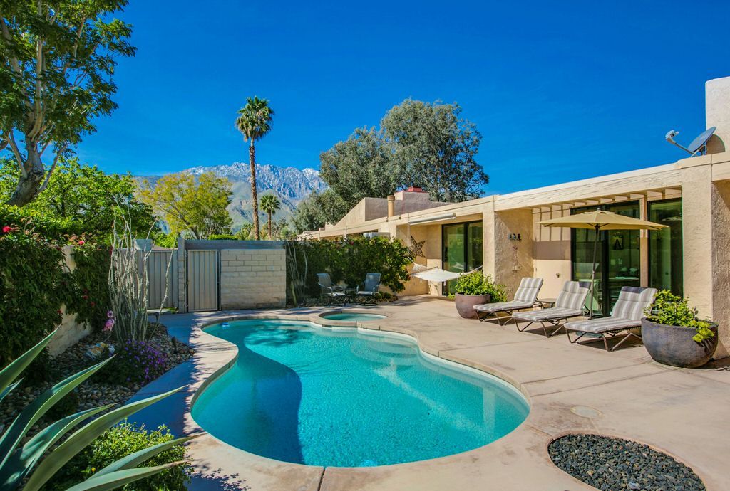 Take full advantage of the Palm Springs year round sunshine in this light and bright vacation rental with a large private walled front and rear courtyards complete with a pebbletec private saline pool and spa and an outdoor gas fire-pit.