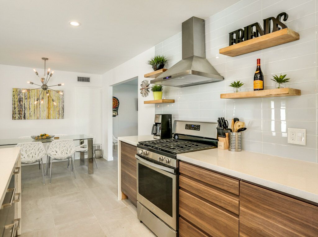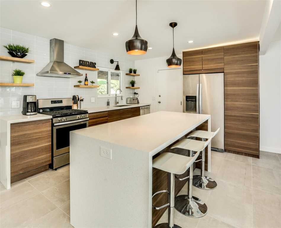 An updated, chef's kitchen is equipped with brand new high end cabinets, sleek waterfall counter-tops, maple floating shelves, stainless steel appliances and a huge island. This kitchen is fully equipped with everything you will need to prepare your favorite recipes from the comfort of your vacation home.