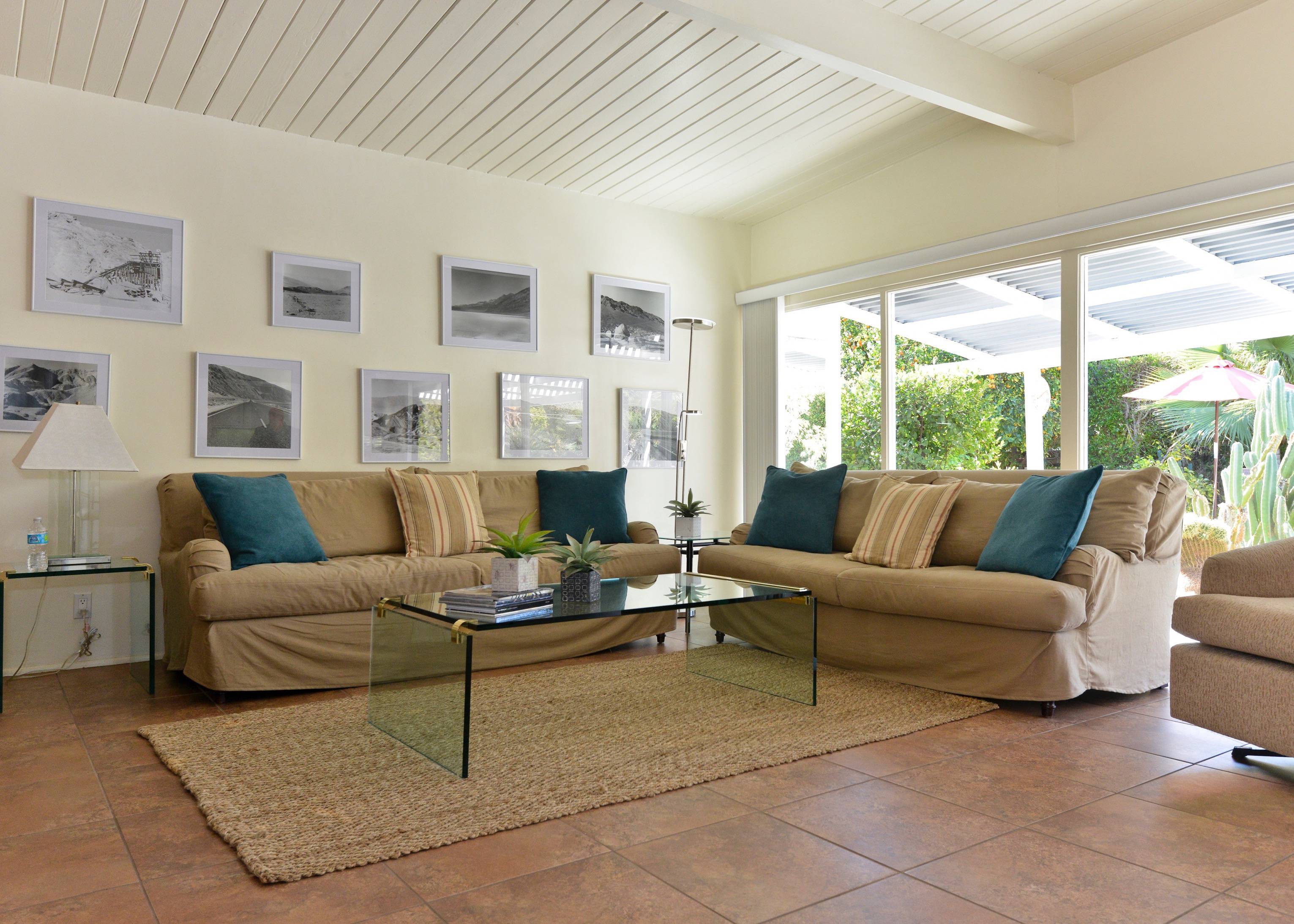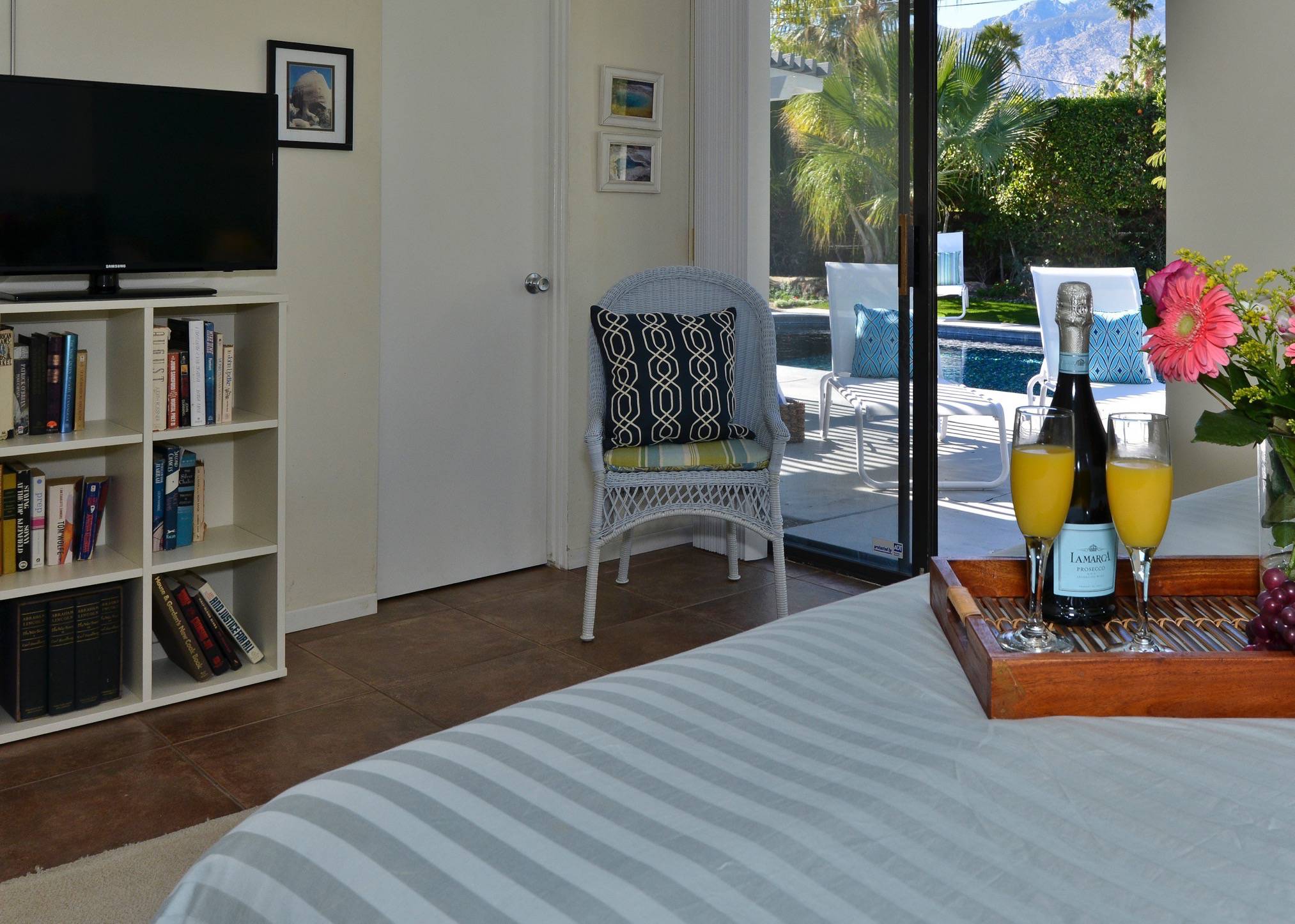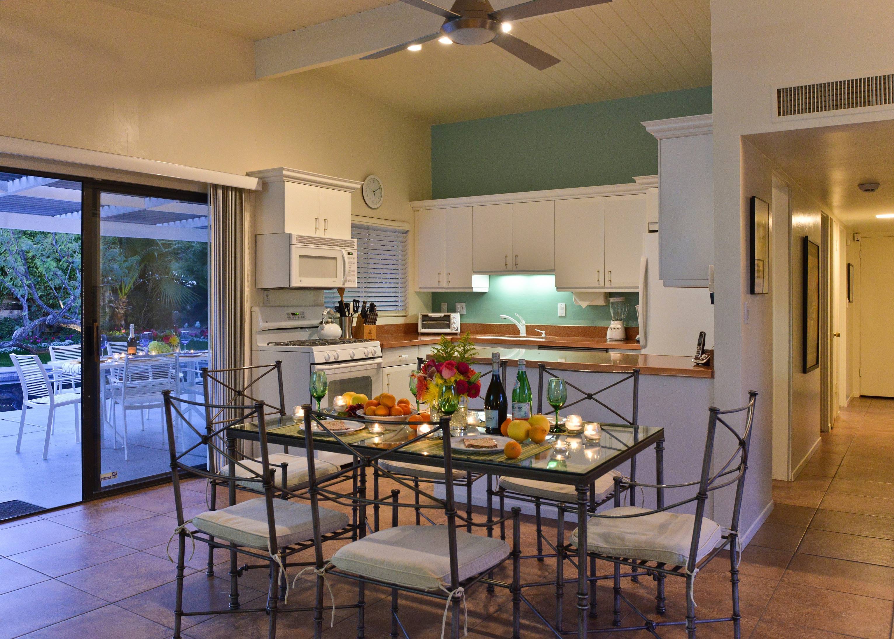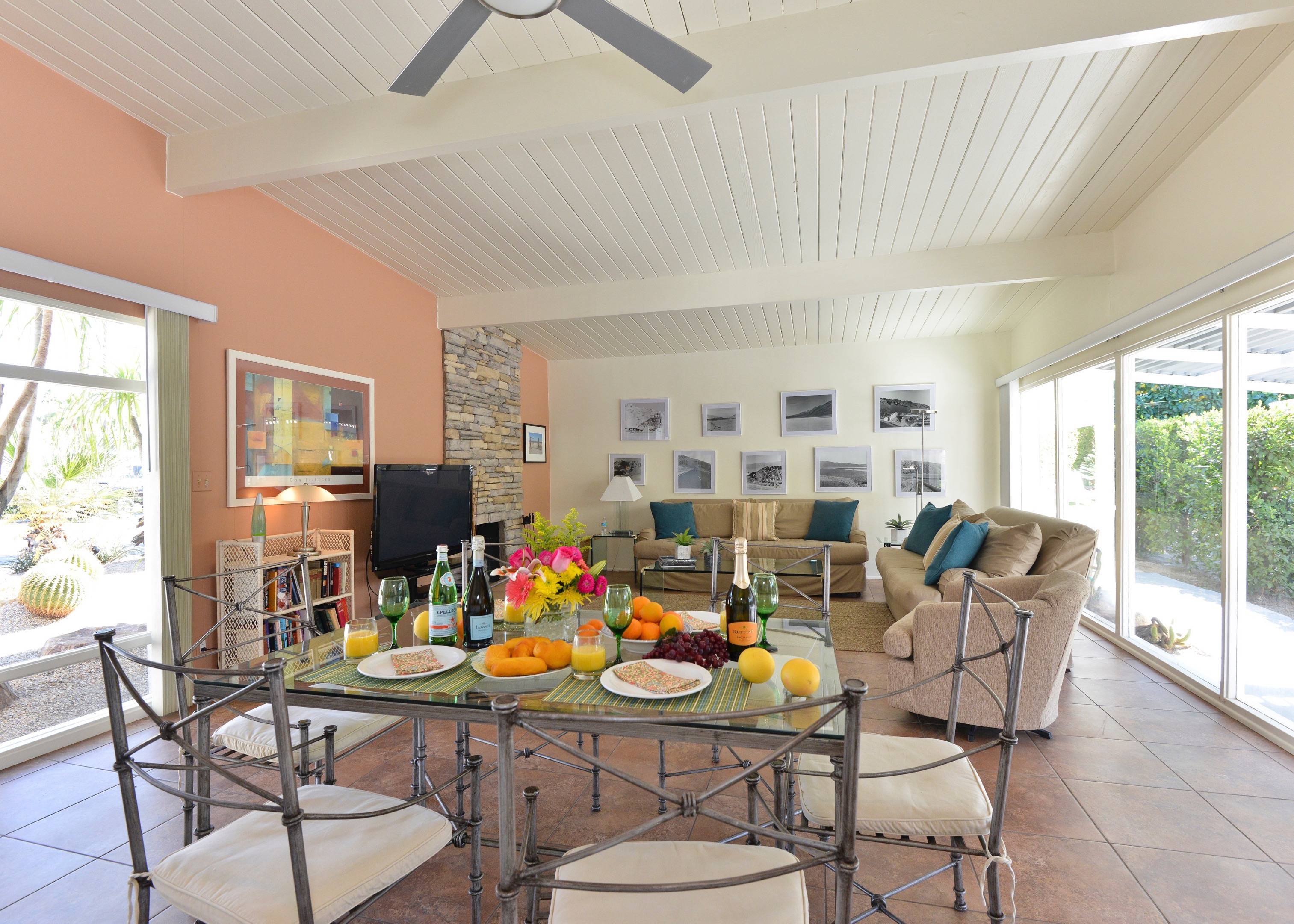 Alexander in the Sun has everything you need for a complete Palm Springs vacation. Whether you dive into the private pool or relax in the private spa, the house will be your perfect retreat and it's only 1.8 miles from the heart of Downtown! P.S. City ID #433 Primary renter must be at least 25 years of age Located on a quiet residential street in Sunrise Park, this mid-century pool home has been beautifully remodeled. New kitchen! New baths! Open floor plan! The large paradise pool yard is enclosed by mature plantings to create the perfect, very private, vacation escape. Heated saltwater pool with sapphire-blue mosaic tile, in-ground spa, fire pit, citrus trees, gas barbecue, covered outdoor dining. The living areas are all open to each other, providing enough space for your entire group to gather, relax and enjoy. But there are also some quiet, tucked away areas that are perfect for curling up with a good book or spending some time alone. During the recent remodel, the homeowners respected the 1958 pedigree of this architecturally significant Alexander home, while modernizing it for today. You’ll find vaulted ceilings, walls of glass, quartz counter tops and beautiful porcelain tile floors. The living room features a gas fireplace, plenty of comfortable seating for your entire group, a 50-inch plasma flat-screen TV, a DVD-Blu Ray player and premium satellite service with HBO and Showtime. The interior dining area is perfect for six guests and the kitchen has been fully stocked for individual or team meal prep. In true Palm Springs style, the entire back of the house features walls of glass, blurring the lines between indoor and outdoor living - and revealing the sunny pool and patio area. SLEEPING QUARTERS The bedrooms of this wonderful vacation home are flexible to accommodate your group’s needs. The master bedroom offers a king-sized bed, an ensuite bath, a flat screen TV and direct pool access. The two guest rooms share a bath and each has a king bed that can be converted to twin beds upon request - making this vacation home a great option for singles, a few couples, families, golf outings, multi-generational groups, and extended weekends for old friends. LOCATION This property is centrally located in the quiet residential Sunrise Park neighborhood just minutes from the Uptown Design District, Downtown, and the South Palm Springs Business District. Restaurants, night spots, burger joints, sandwich shops, and grocery stores are just a short drive away. Ruth Hardy Park, The Palm Springs Dog Park, two multiplex movie theaters, the casino, and the convention center are all close by. The vibe of this home is very California… very Palm Springs. The owners have created a comfortable, relaxing getaway space that honors the mid-century pedigree of the home but meets the needs of how we live today. Guests often comment that this home is warm, inviting, well laid out and very comfortable. Suitable for extended long weekends, weekly stays, month-long visits and as a seasonal rental. Advanced bookings strongly advised. Optional concierge services including daily maid service, poolside massage, pre-arrival grocery stocking, and private chef can be arranged with three-week prior notice. Certain dog breeds under 65 lbs are allowed at this home, the dog fee is $195 (2 dogs maximum).Amenities