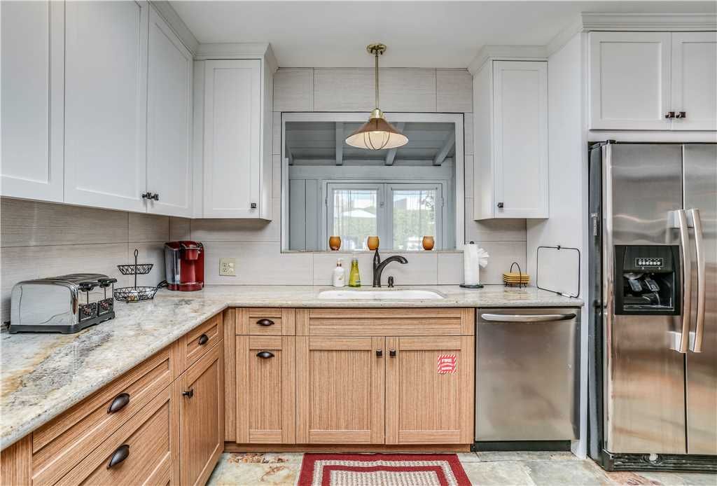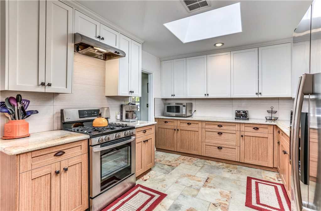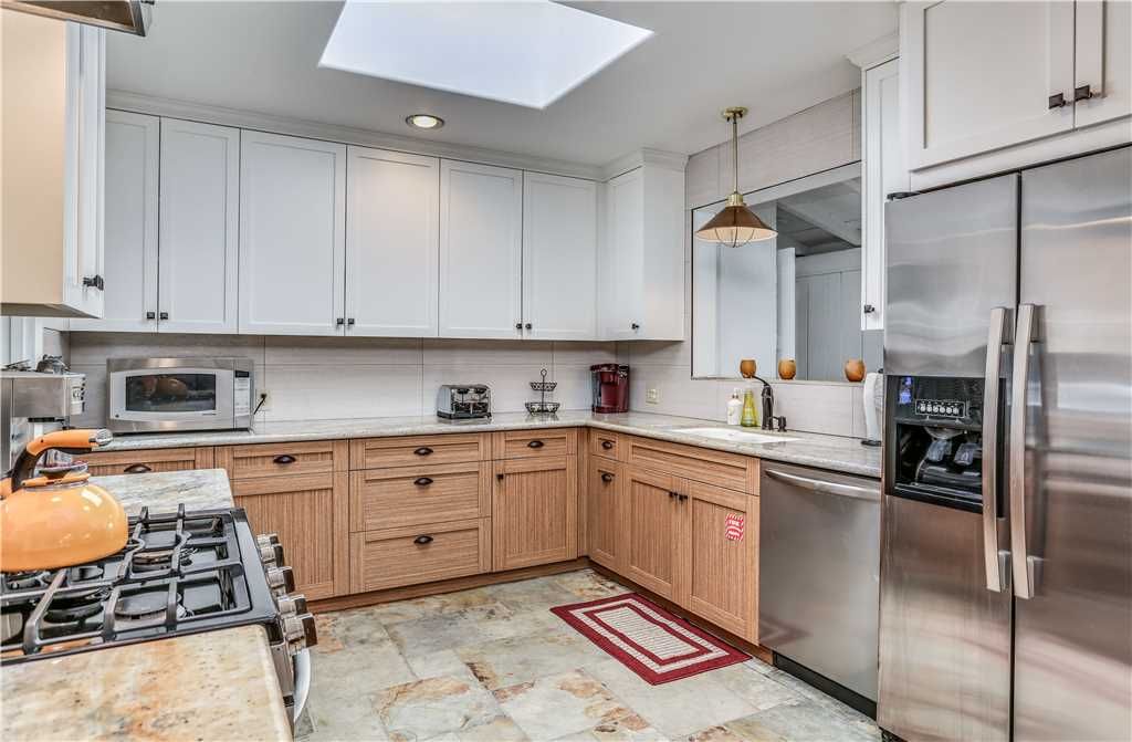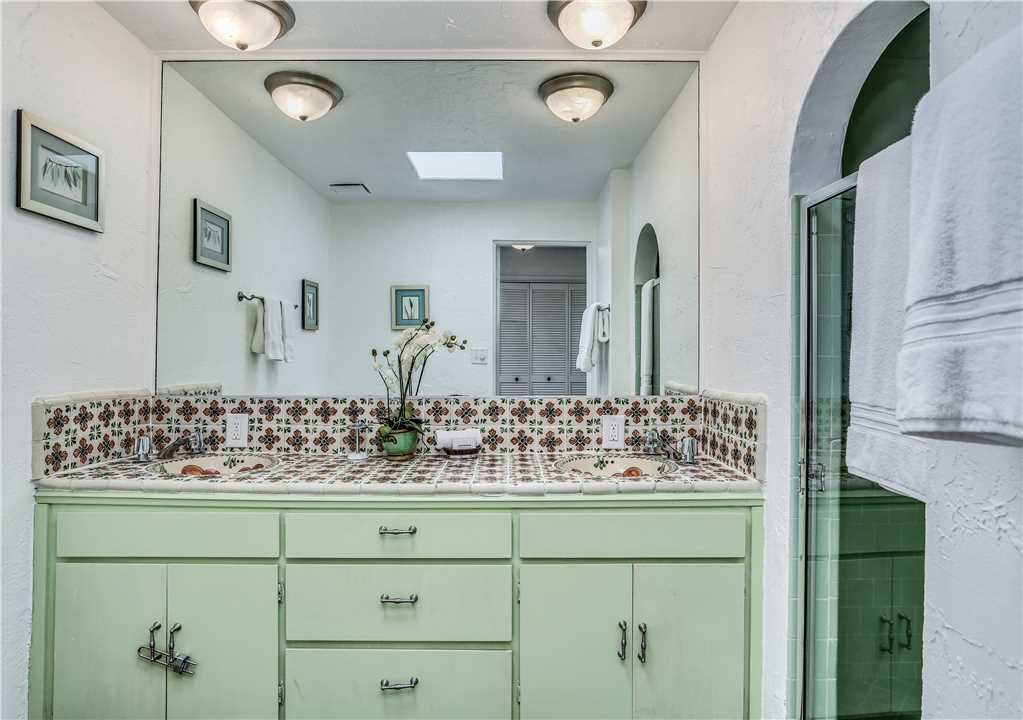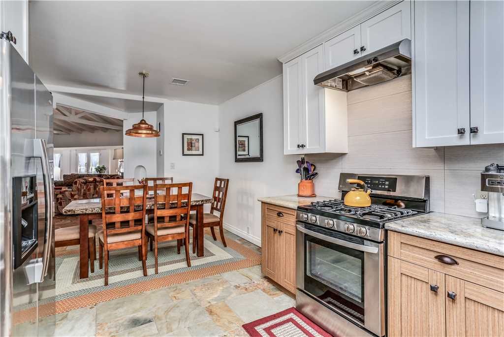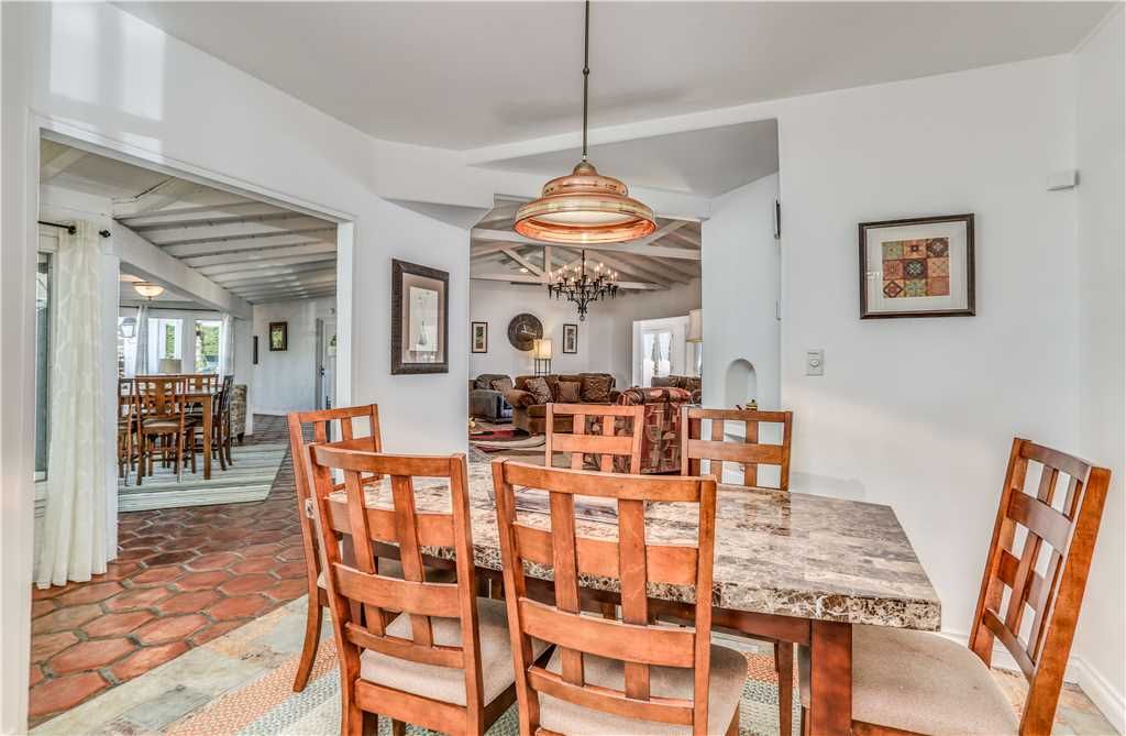 The spacious kitchen features old world tile counter tops and has bar seating for conversation while preparing your favorite meals. All of the space and utensils needed to entertain small groups or large parties with ease.