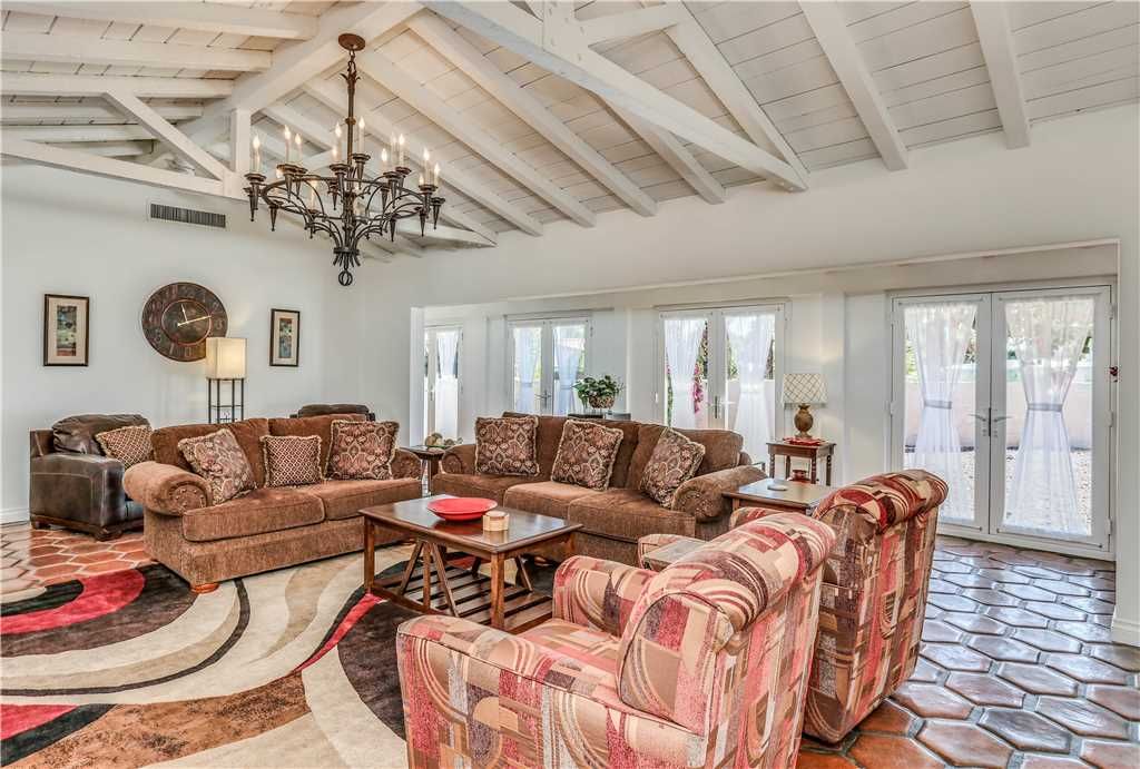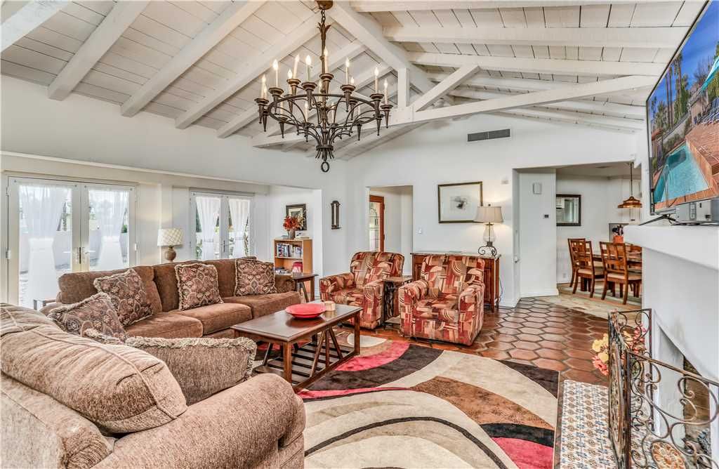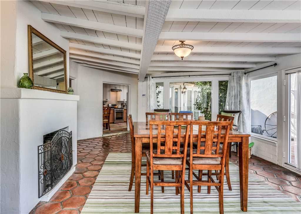 This exceptional house was built in 1937 in the Spanish hacienda style with all the rooms opening up onto the deck celebrating the original pool and dramatic mountain views. The living room/dining room with a grand two sided fireplace, French doors leading out to the deck offering excellent natural light and pool views.