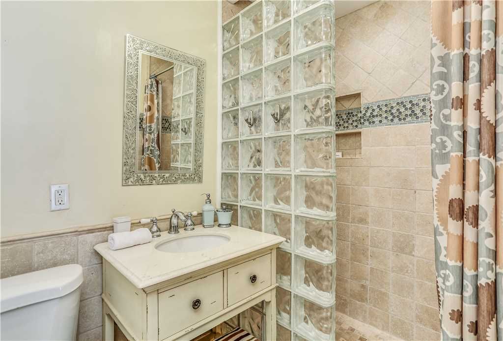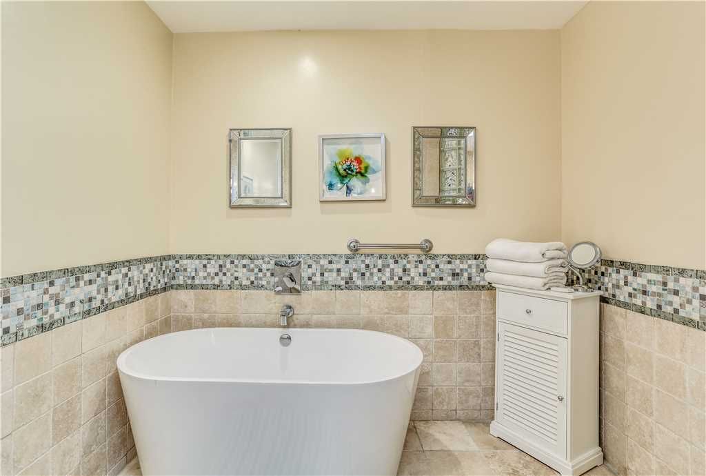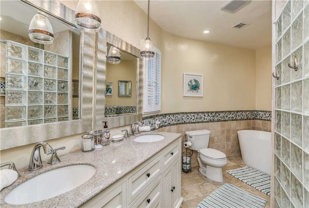 The second private bedroom's en-suite bath has glass enclosed shower, freestanding tub, vanity sink with charming details.
