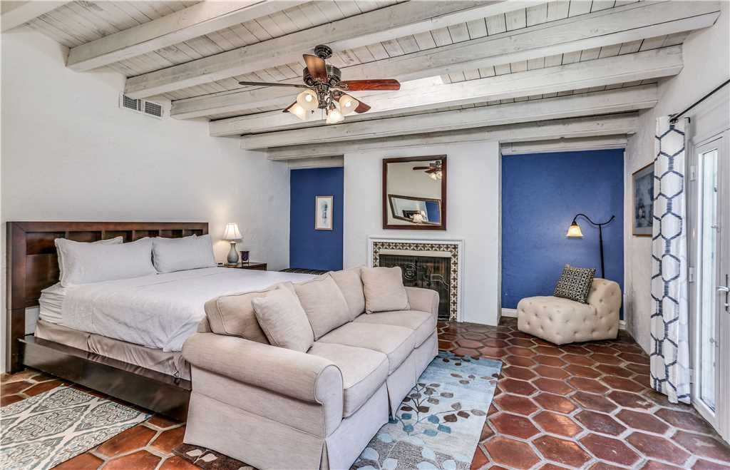 The master retreat of this Palm Springs historic home has a private patio, 42"" TV, fireplace, sitting area, ensuite bathroom glass walled shower, and double vanity.
