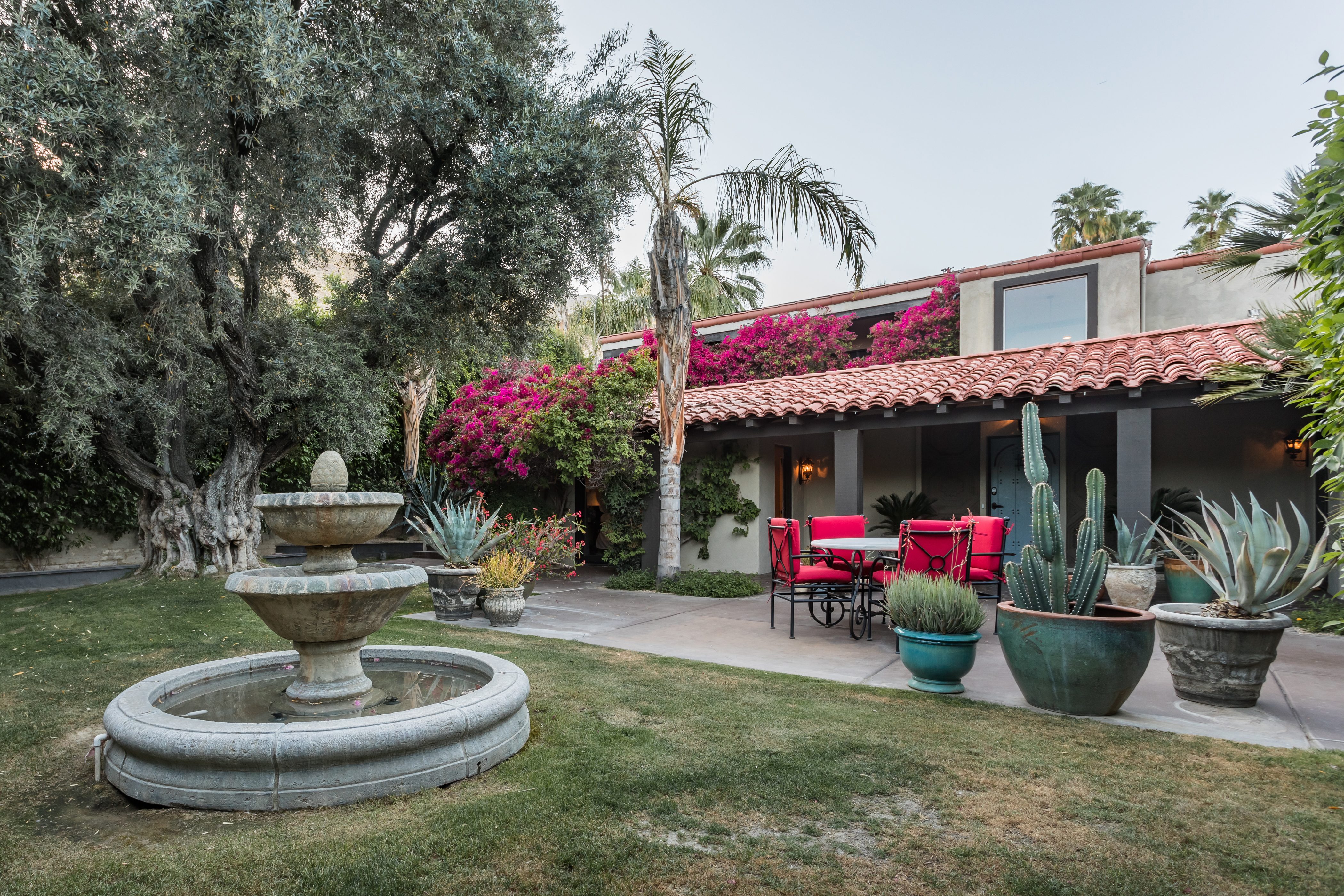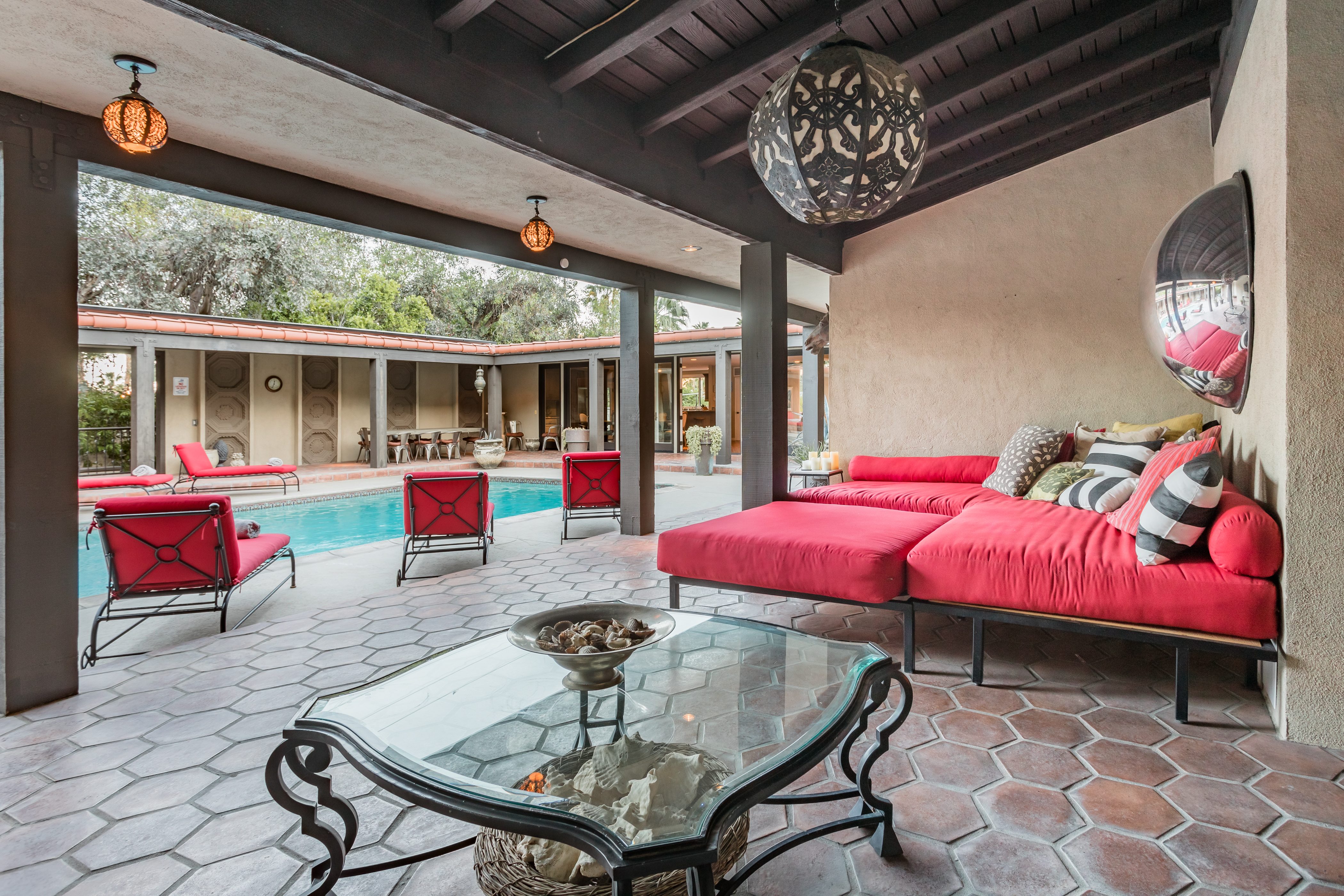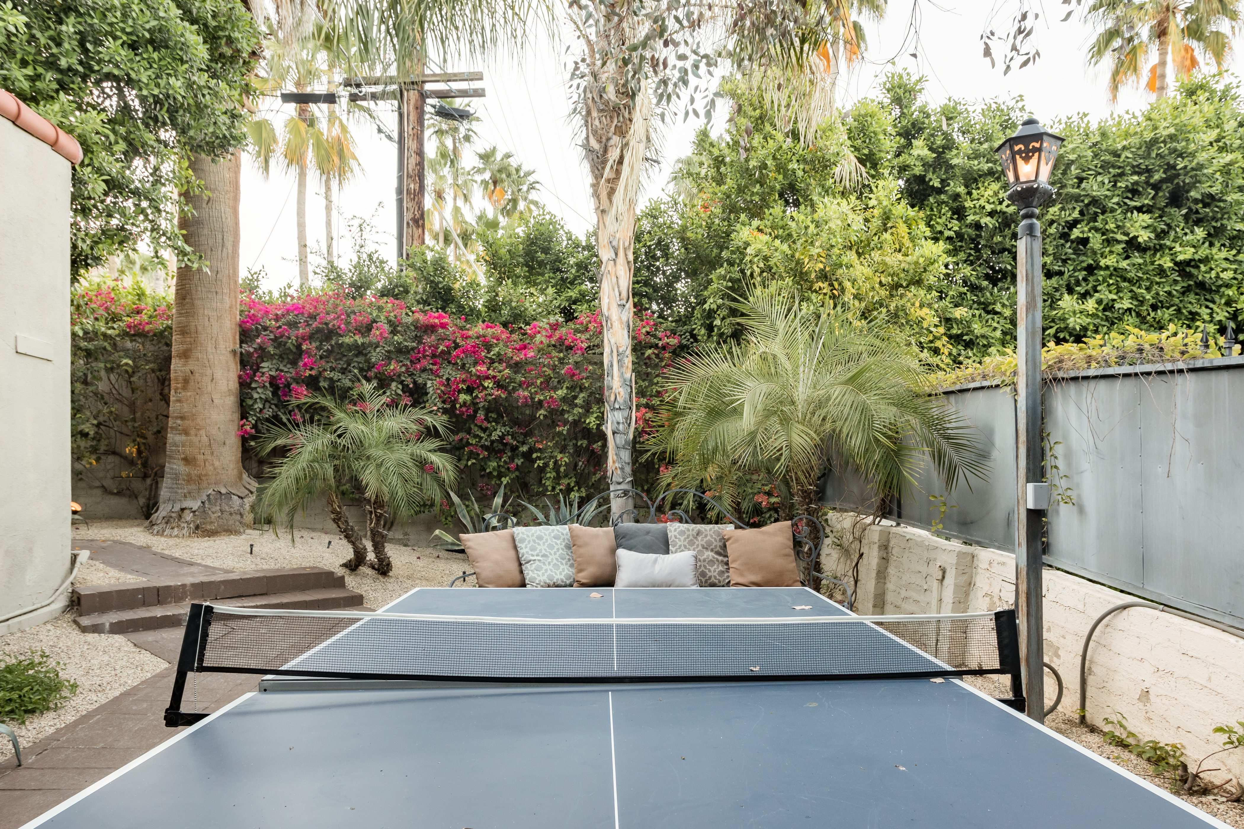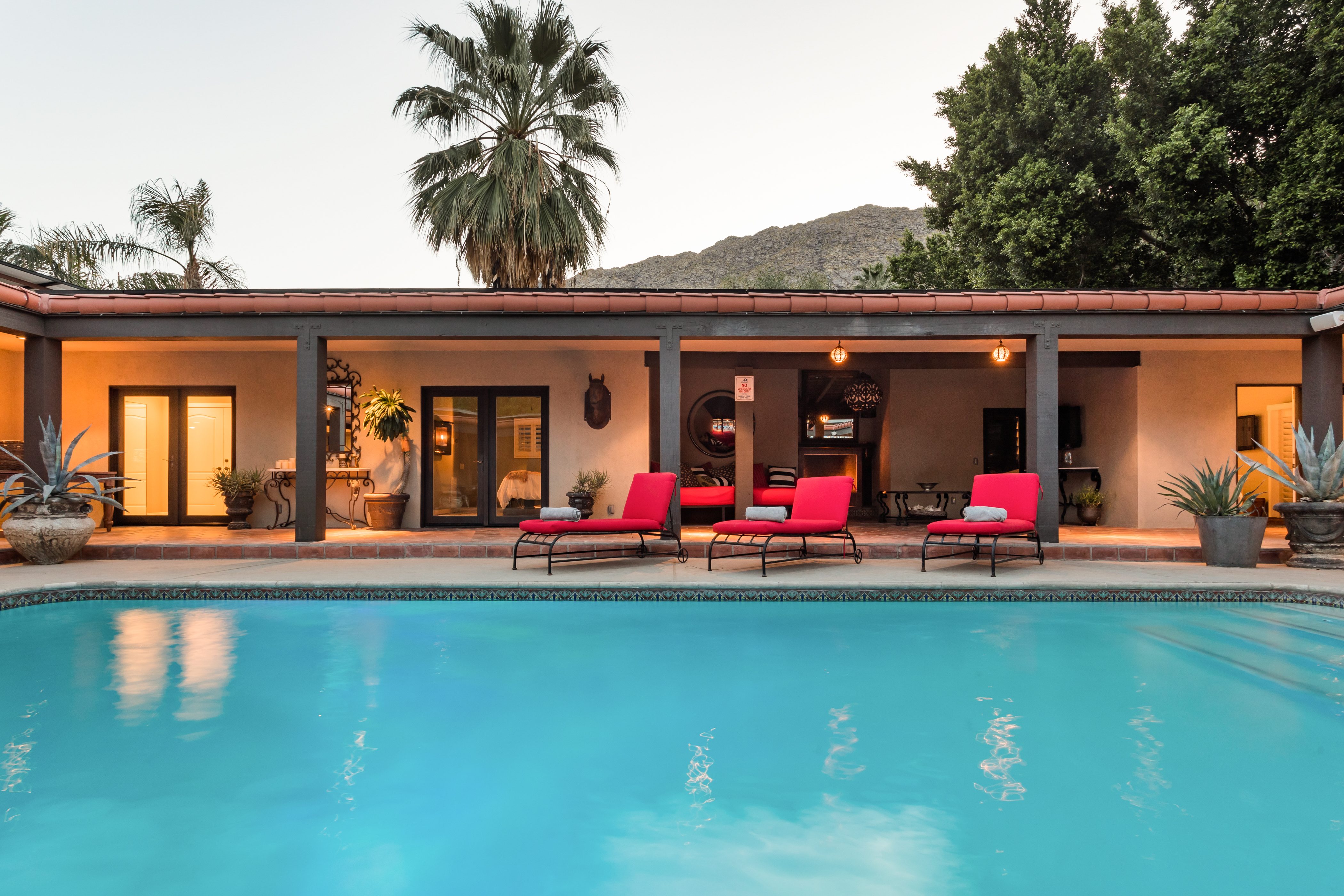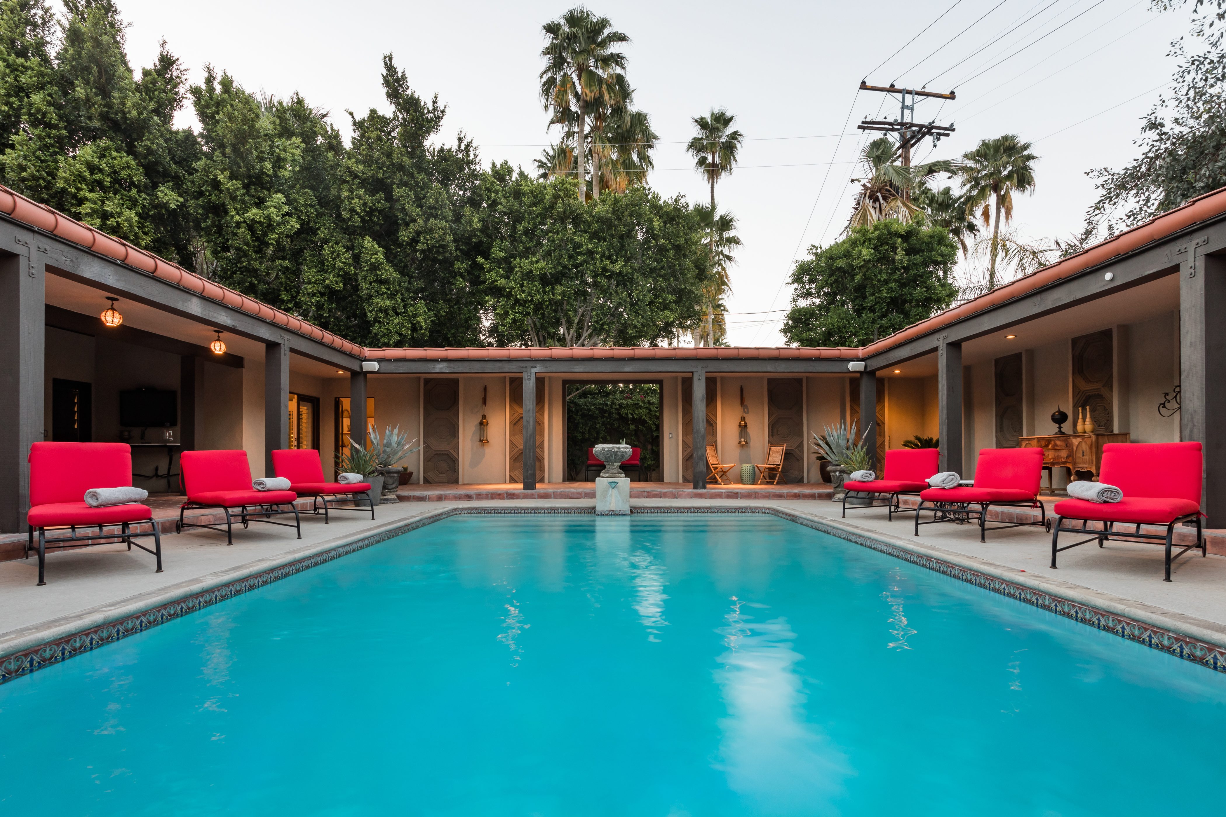 P.S. City ID #1256 **Primary Renter must be at Least 25 Years of Age** Updated luxury meets old-fashioned glamour, with a tropical outdoor oasis in the middle of the desert. This home has it all! A U-shaped courtyard with pool and spa and a private outdoor lounge complete with fireplace. Outdoor kitchen, alfresco dining, ping pong and a grand outdoor shower. Impeccable interior features floor-to-ceiling windows, large gathering spaces with top-of-the-line furnishings, large gourmet kitchen and hotel-quality bedrooms. Perfect for a large group, 4 queen beds + bunk room, all w/pool access. P.S. City ID #1256 **Primary Renter must be at Least 25 Years of Age** Glamorous Palm Springs Villa with strong ties to Old Hollywood. Very private walled and gated estate in the The Mesa. 4 Deluxe sleeping quarters + bunk room. Center courtyard pool area. Spa. Outdoor shower. Ping Pong. Walk to Palm Canyon Drive. Outdoor fireplace. Beds: Q, Q, Q, Q, Bunk = F, T This home in the Old Mesa neighborhood was owned by film star Joseph Cotton, and has hosted countless Hollywood luminaries. Follow in their footsteps in walking past stars' homes to Palm Canyon Drive to discover a wealth of boutiques and restaurants. Certain dog breeds under 65 lbs are allowed at this home, the dog fee is $195 (2 dogs maximum).Amenities