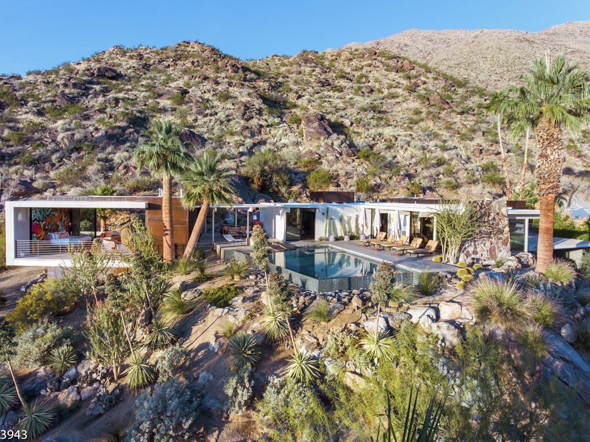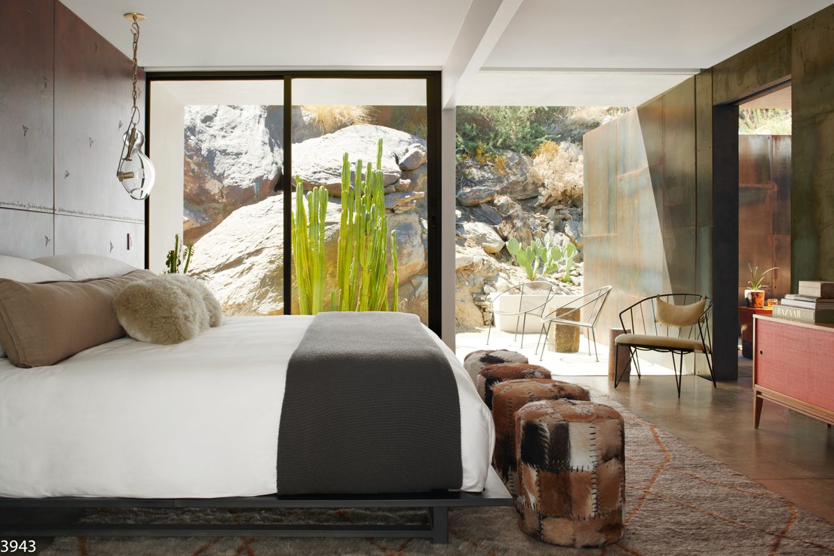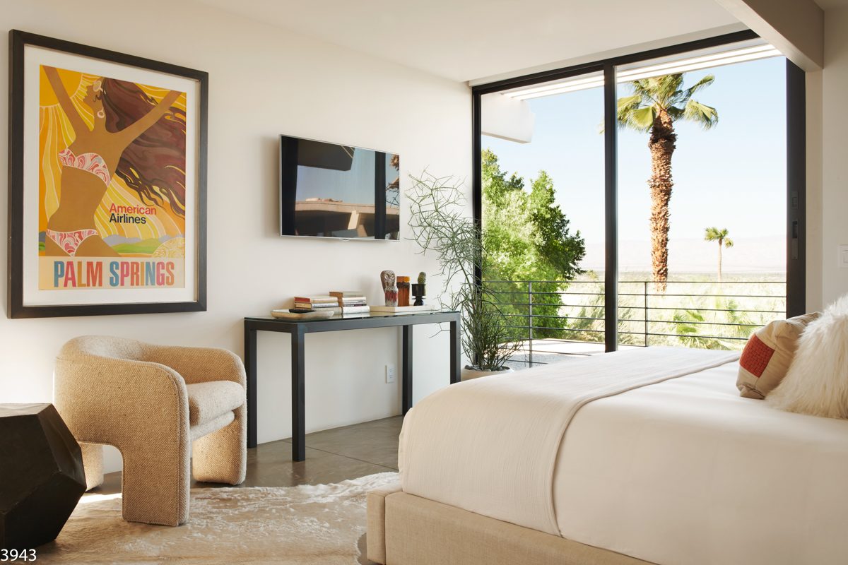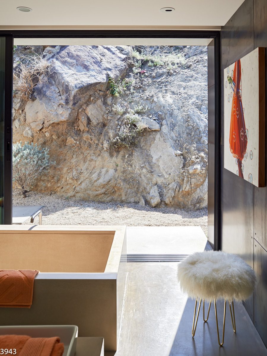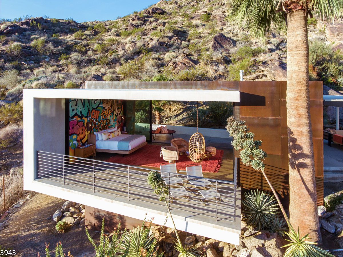 Situated high in the hills of the historic and eclectic Mesa neighborhood, On The Rocks is an original 1959 Hugh Kaptur, AIA, design, and has been often noted as “one of the finest examples of modern hillside architecture in Palm Springs”. Featuring 200-degree views of three mountain ranges, the cityscape of Palm Springs and the valley floor, On The Rocks enjoys a stunning vantage point.On The Rocks features three master suites. The first features a Four Seasons king sized bed and a daybed located on the adjacent private patio. The second bedroom also features a Four Seasons King sized bed. The “Love Shack” (so named for its decorative lyrics), which is the third bedroom in the detached casita, features a Four Seasons king sized bed and dual walls of sliding glass doors on both the east and west side of the Casita, resulting in a total indoor/outdoor living space.
