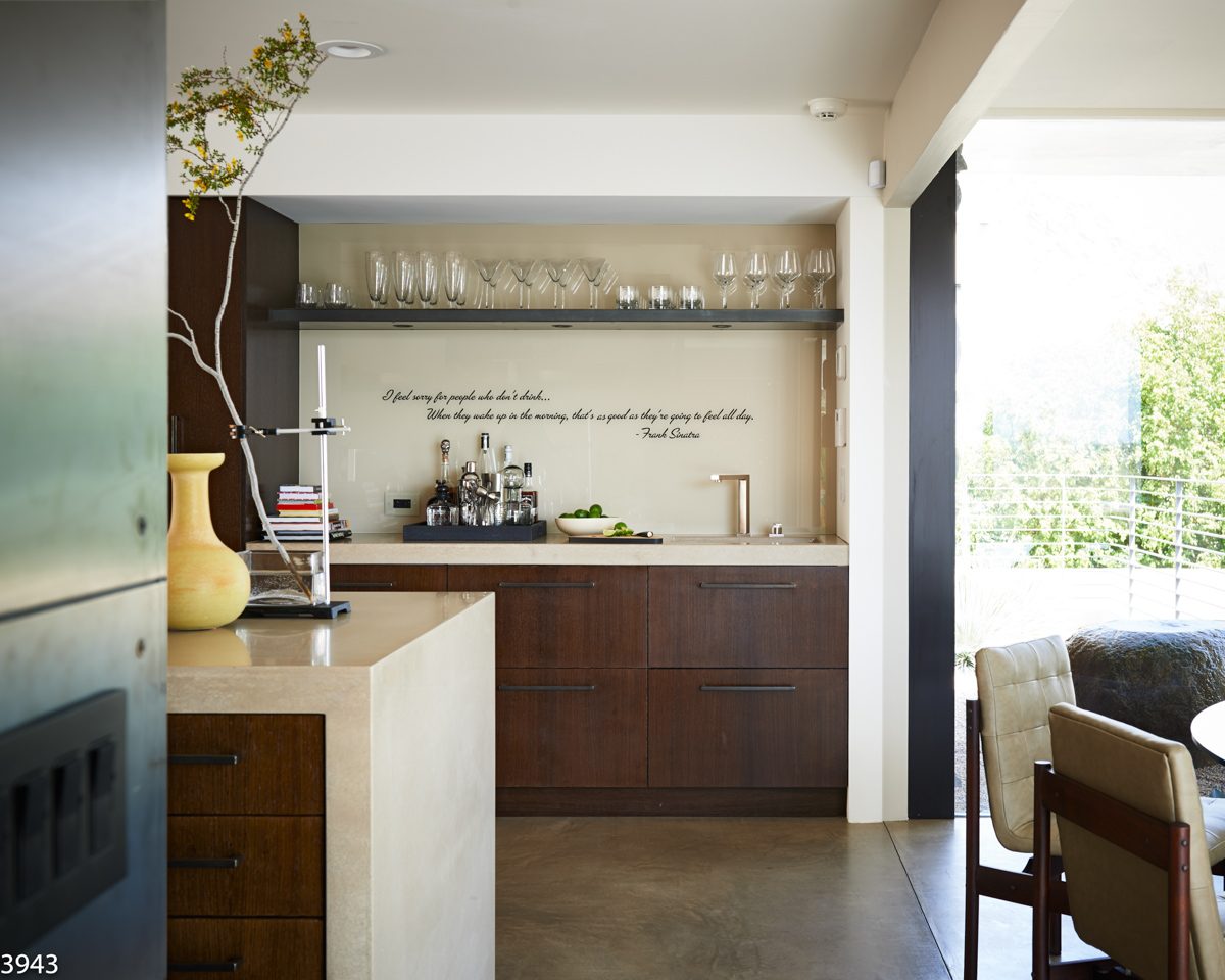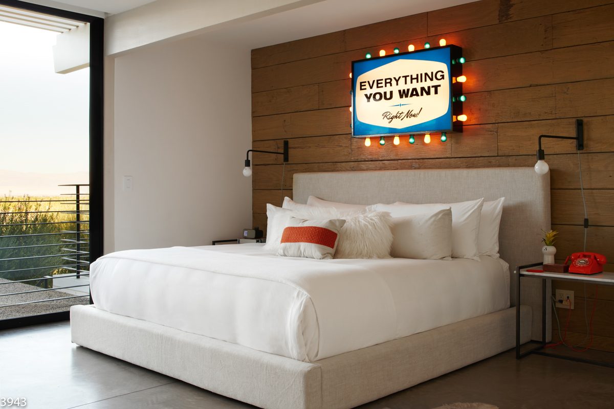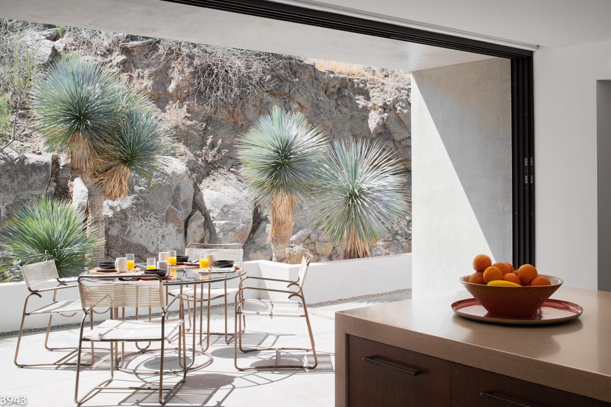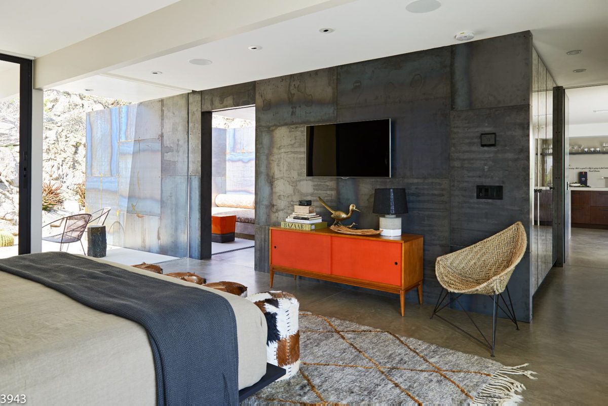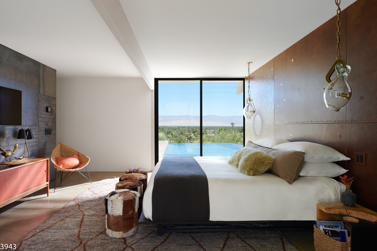 Situated high in the hills of the historic and eclectic Mesa neighborhood, On The Rocks is an original 1959 Hugh Kaptur, AIA, design, and has been often noted as “one of the finest examples of modern hillside architecture in Palm Springs”. Featuring 200-degree views of three mountain ranges, the cityscape of Palm Springs and the valley floor, On The Rocks enjoys a stunning vantage point.On The Rocks features three master suites. The first features a Four Seasons king sized bed and a daybed located on the adjacent private patio. The second bedroom also features a Four Seasons King sized bed. The “Love Shack” (so named for its decorative lyrics), which is the third bedroom in the detached casita, features a Four Seasons king sized bed and dual walls of sliding glass doors on both the east and west side of the Casita, resulting in a total indoor/outdoor living space.