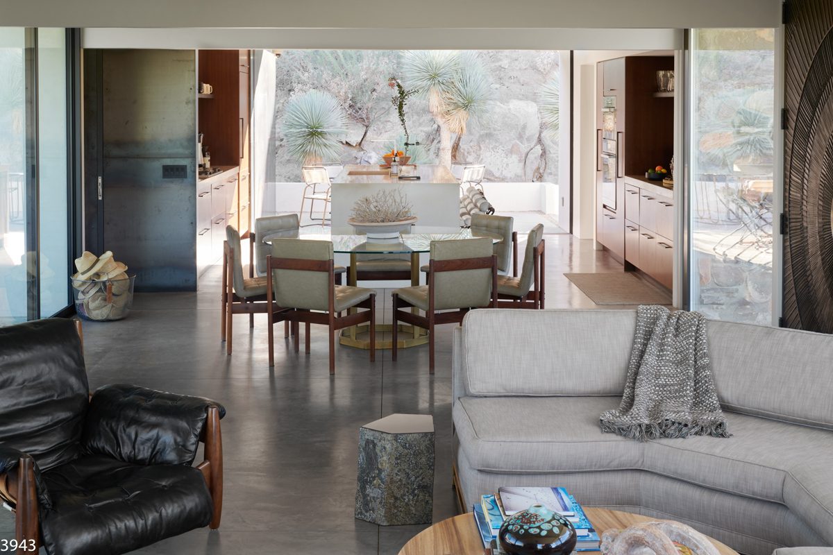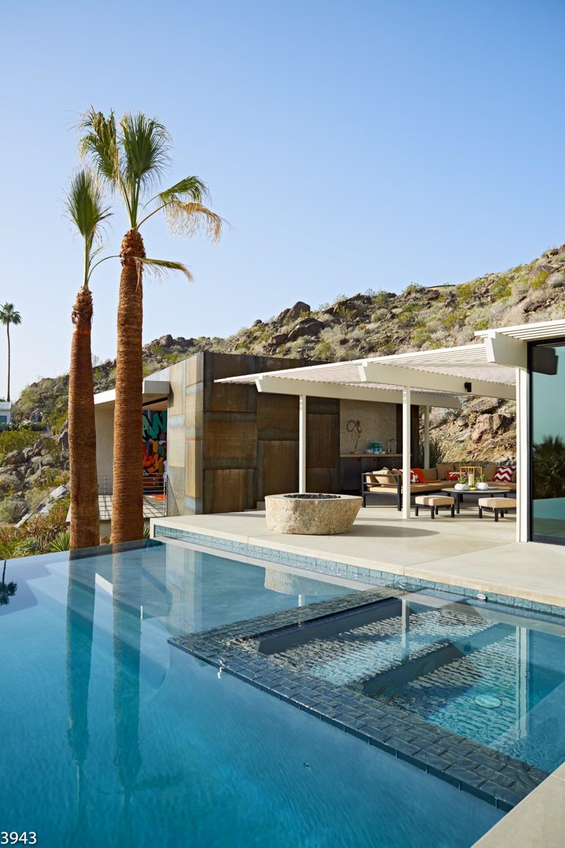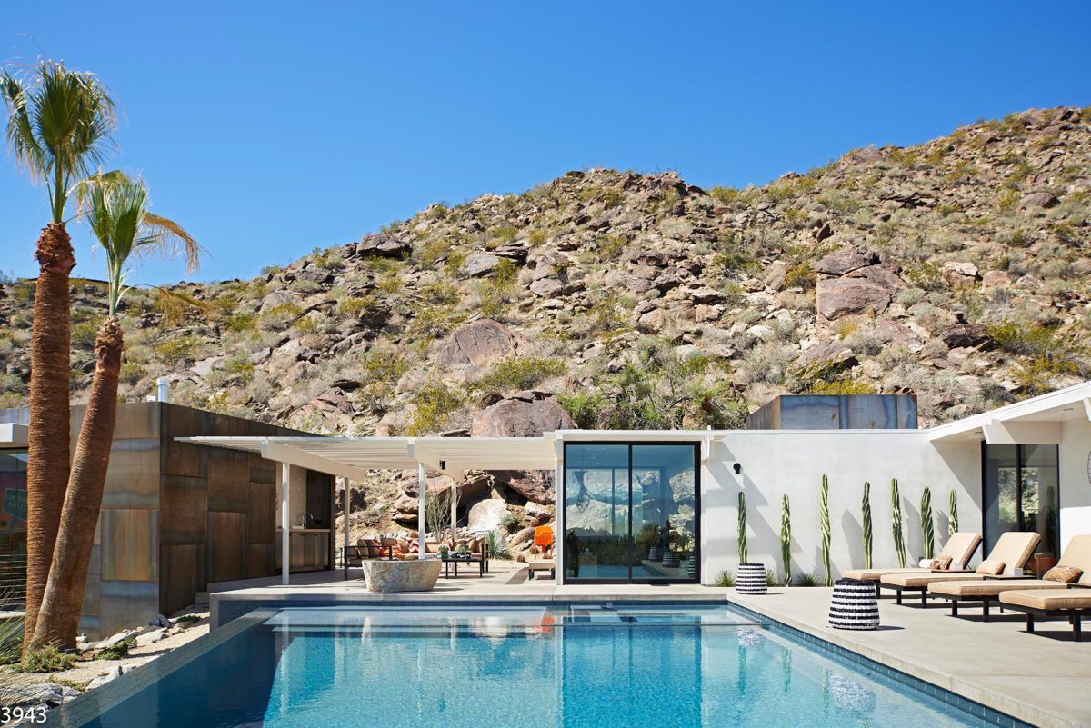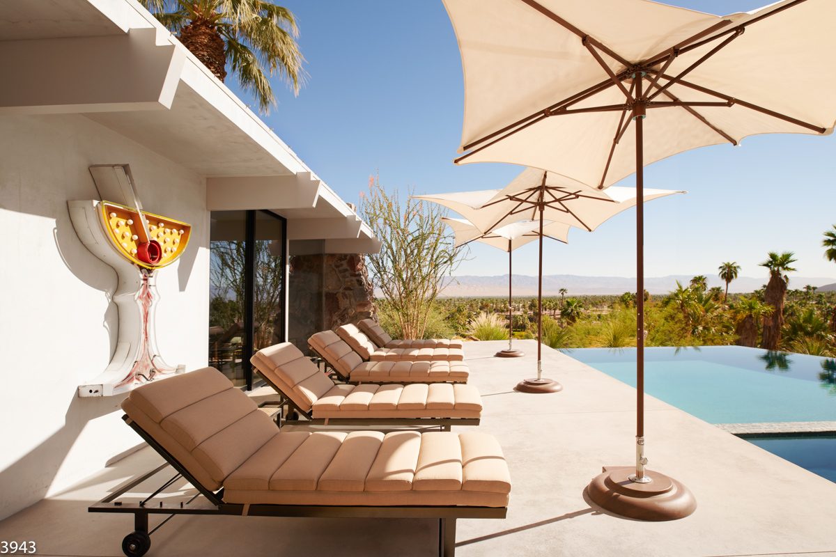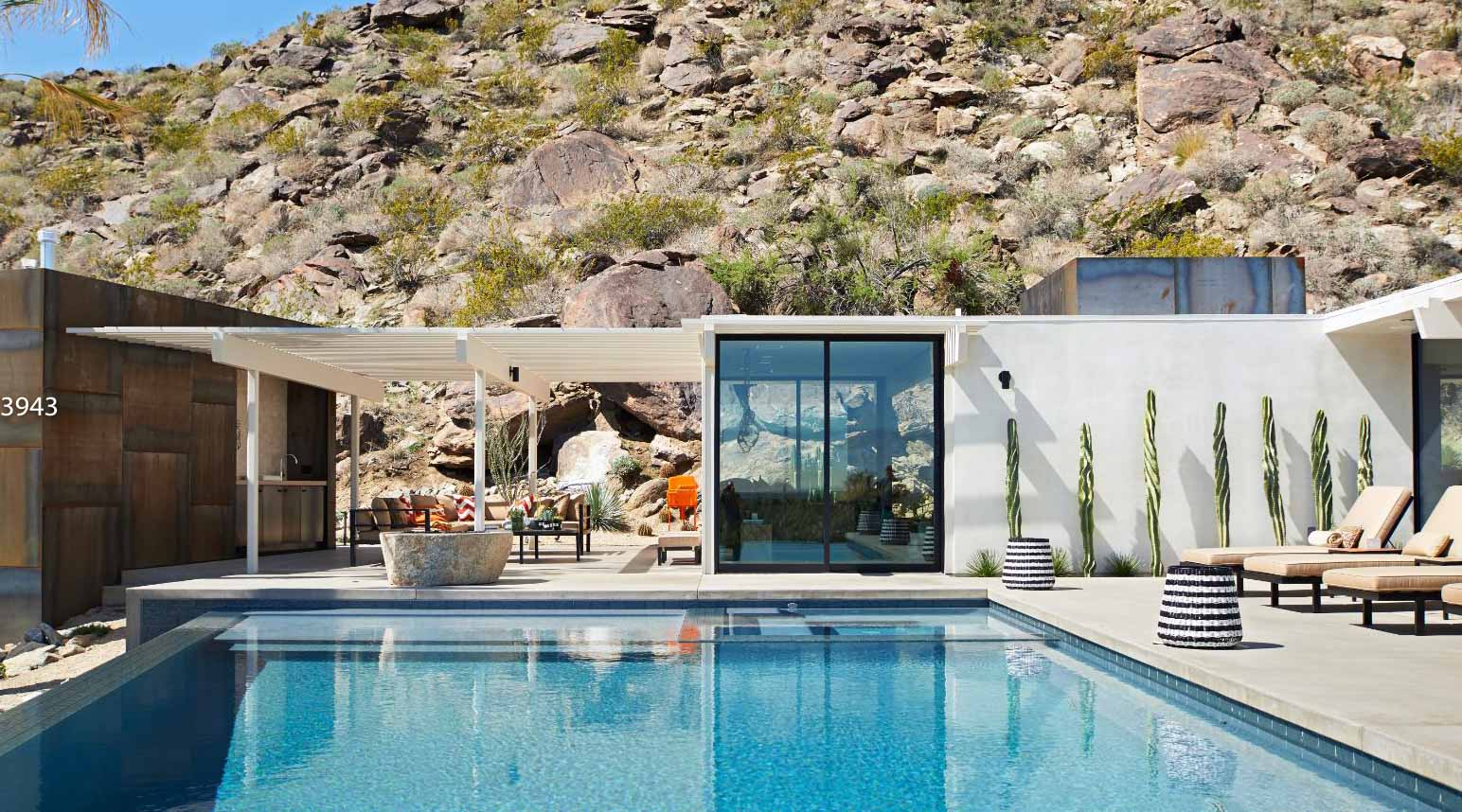 On The Rocks has a custom saline pool with two infinity edges, an integrated spa, and tanning shelf. Located between the main house and casita is the outdoor living room, which features a bar area, fire pit, restored vintage Orange Charmglow gas BBQ and projector for outdoor movie viewing.
