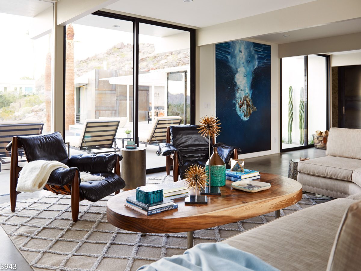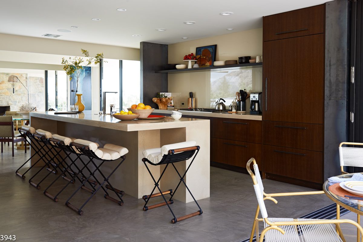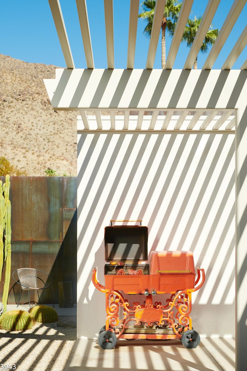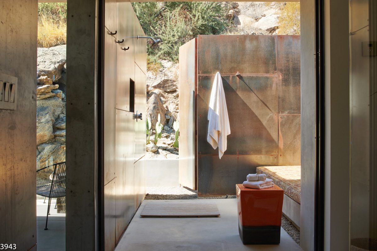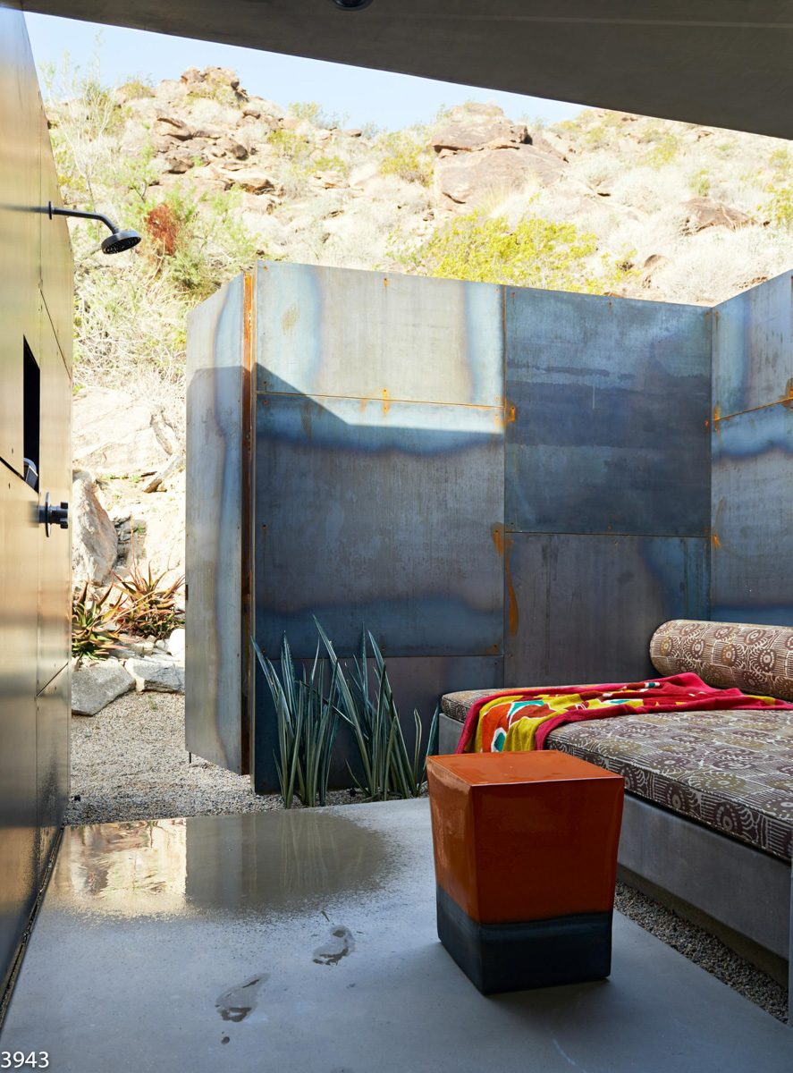 On The Rocks has a custom saline pool with two infinity edges, an integrated spa, and tanning shelf. Located between the main house and casita is the outdoor living room, which features a bar area, fire pit, restored vintage Orange Charmglow gas BBQ and projector for outdoor movie viewing.