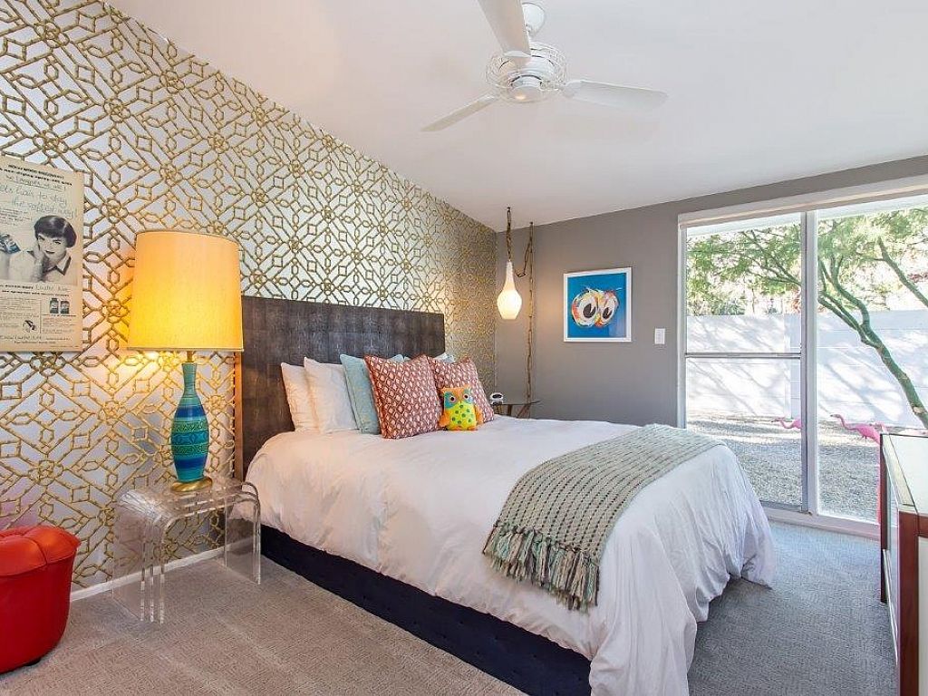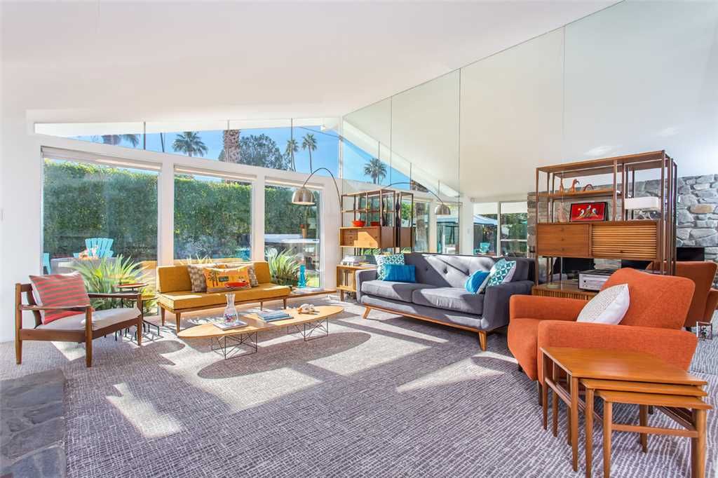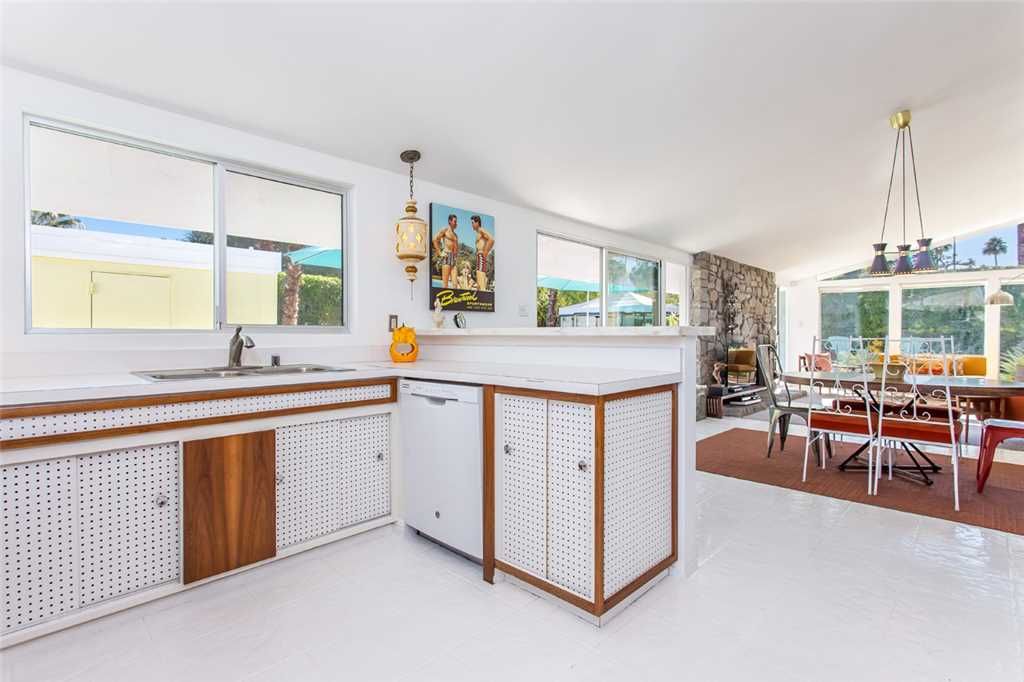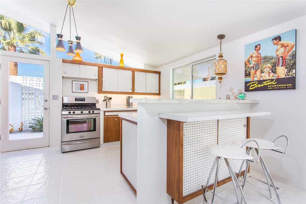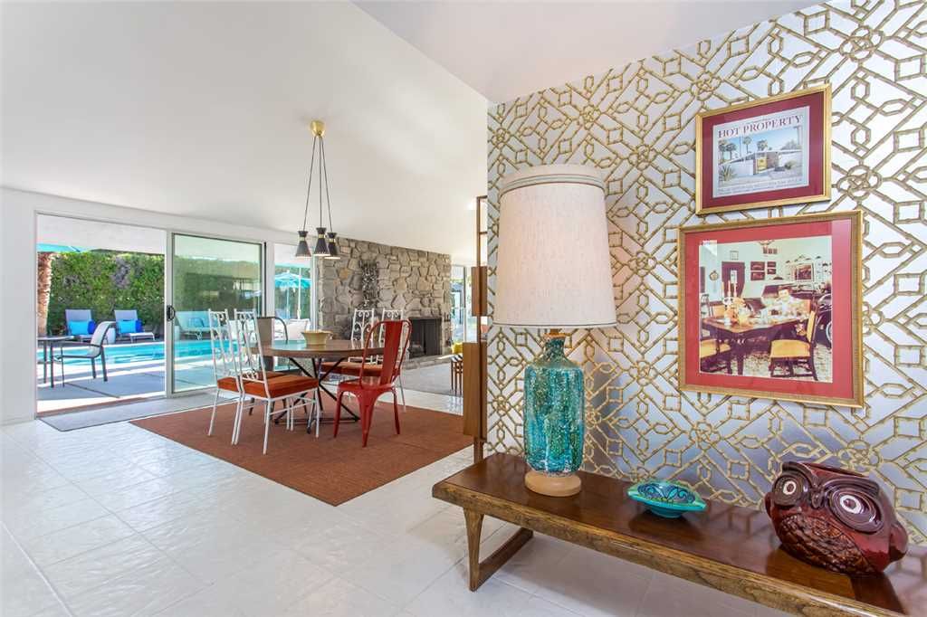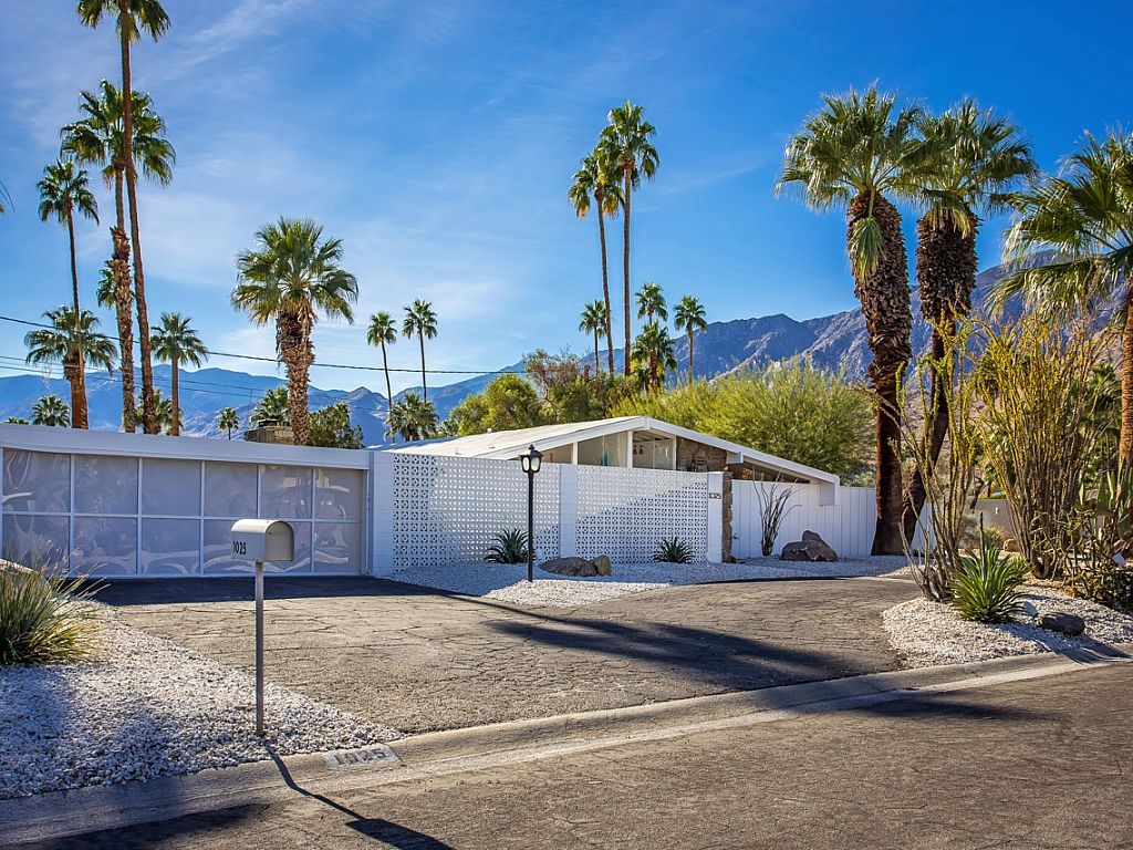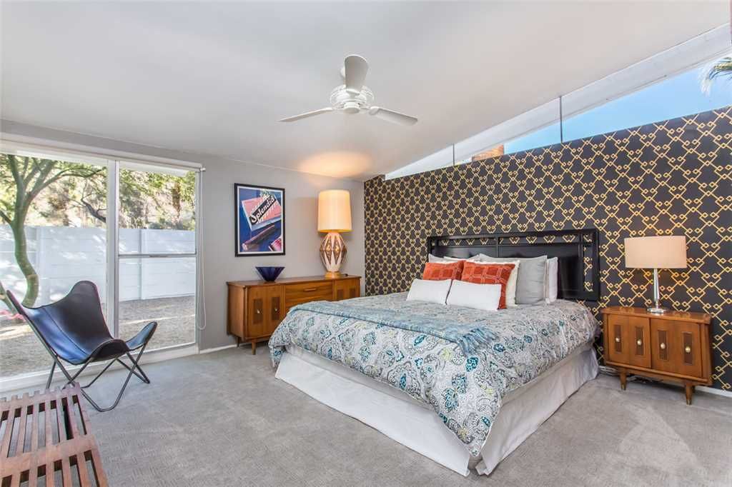 This is one of the original Alexander model homes, a 1957 beauty designed by Palmer & Krisel, just hit in the vacation renal market in Palm Springs. The one-story home in the Twin Palms neighborhood of Palm Spring has a high gabled roof, glass walls, three wallpapered bedrooms, and a large back and side yards.