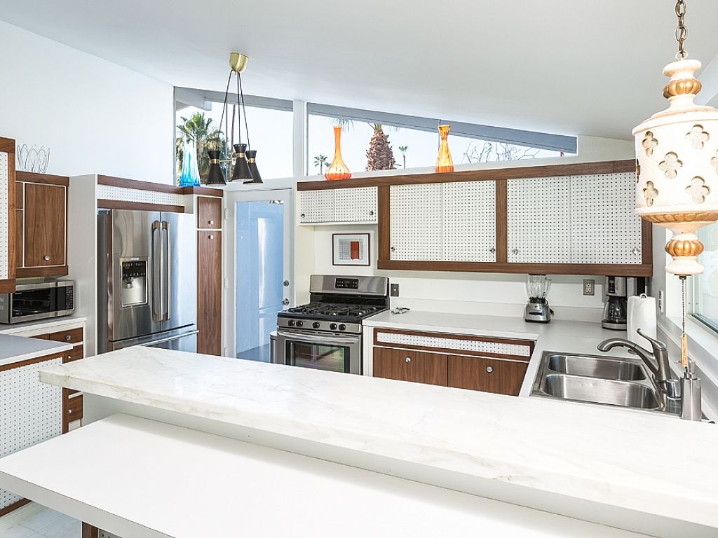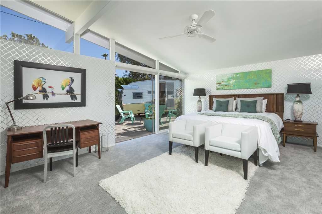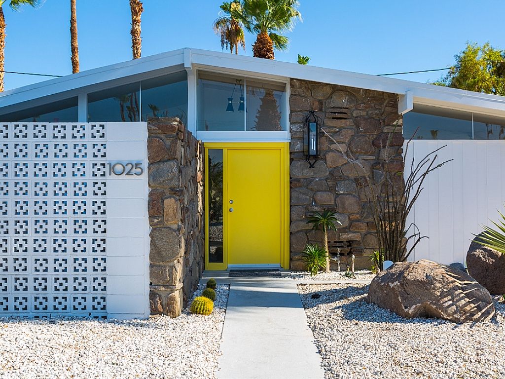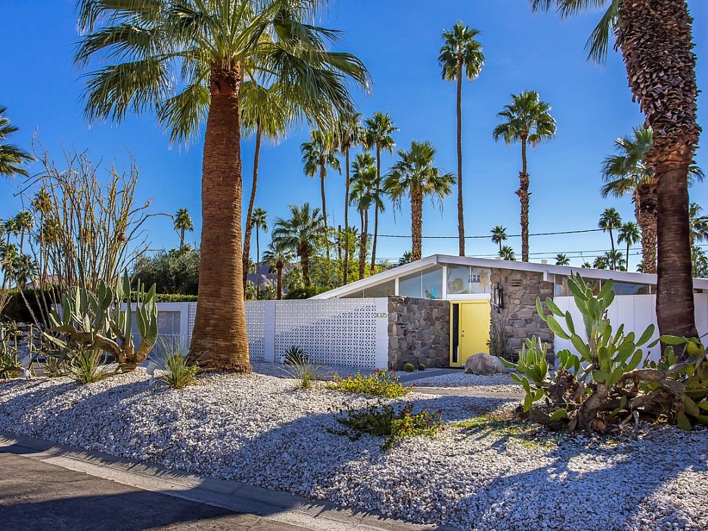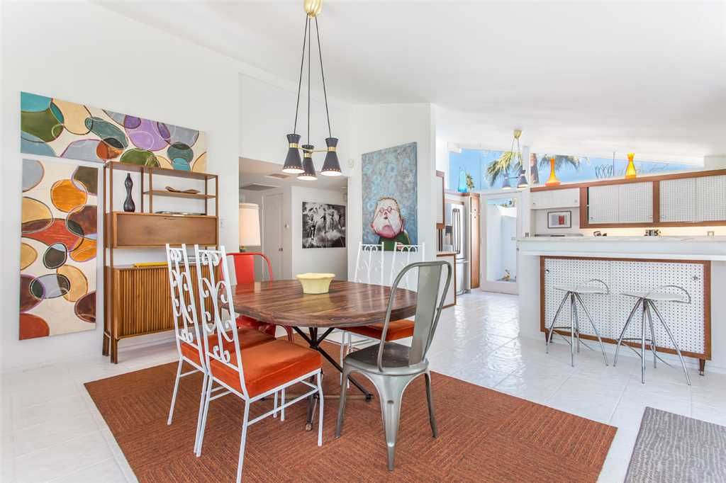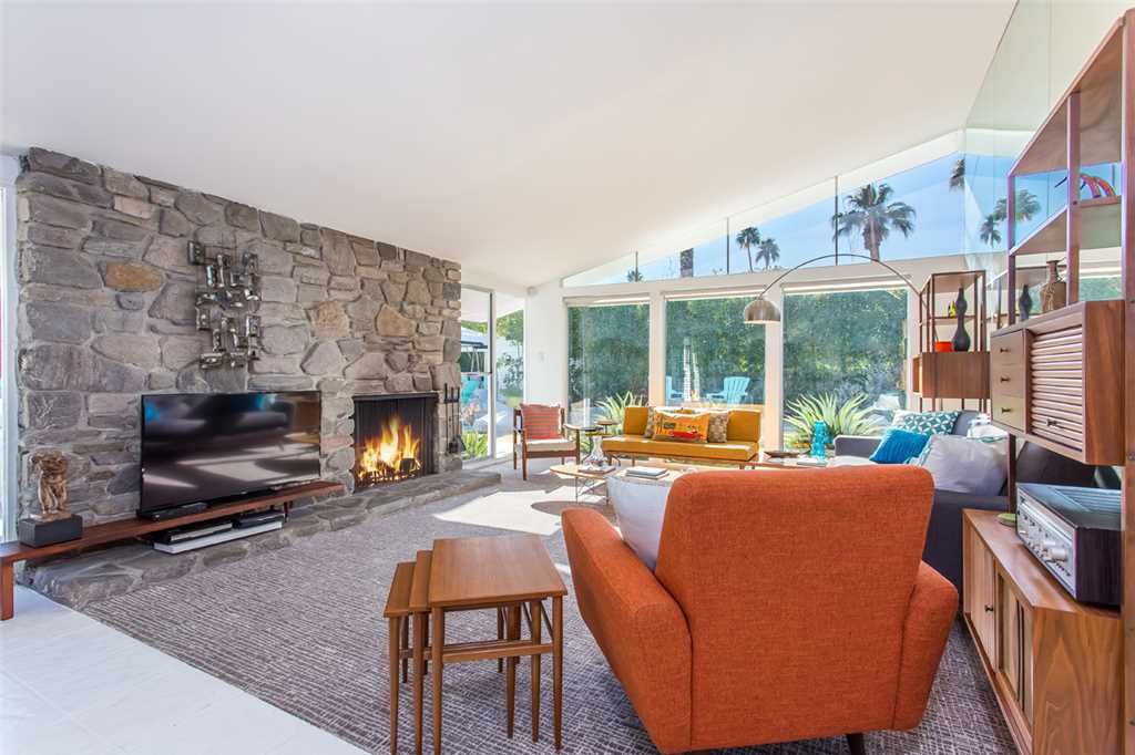 This is one of the original Alexander model homes, a 1957 beauty designed by Palmer & Krisel, just hit in the vacation renal market in Palm Springs. The one-story home in the Twin Palms neighborhood of Palm Spring has a high gabled roof, glass walls, three wallpapered bedrooms, and a large back and side yards.