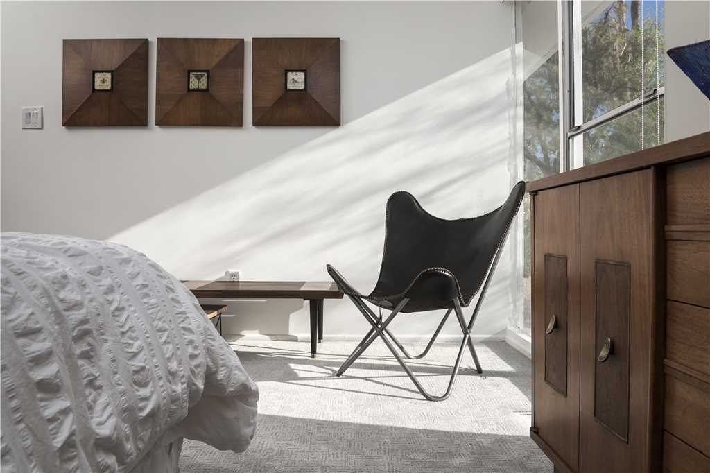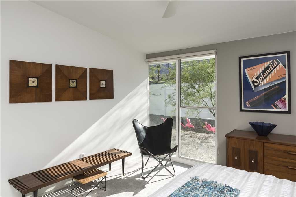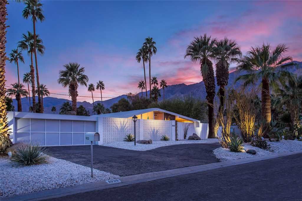 This midcentury modern Alexander home offers great views, spacious private grounds, lush landscaping, a large heated pool, and dozens of soaring palm trees. The home radiates with warmth and personality, texture and rich, deluxe finishes.