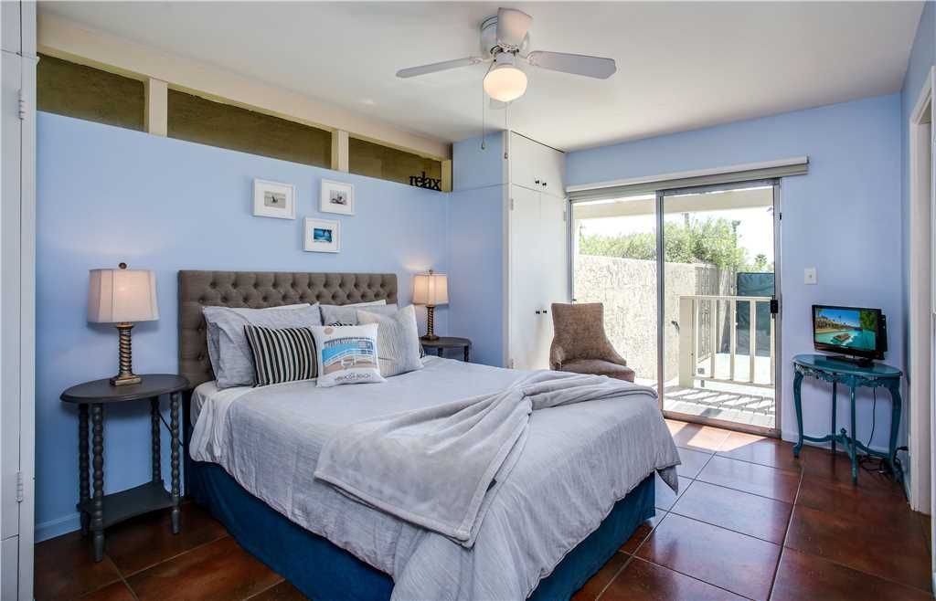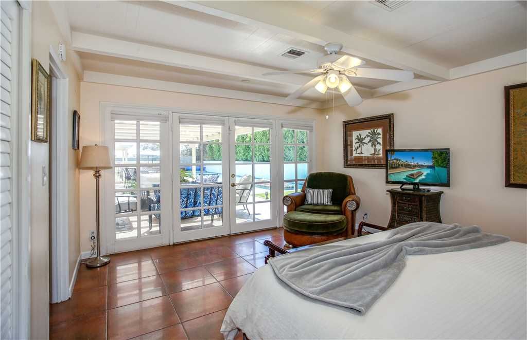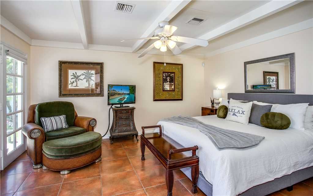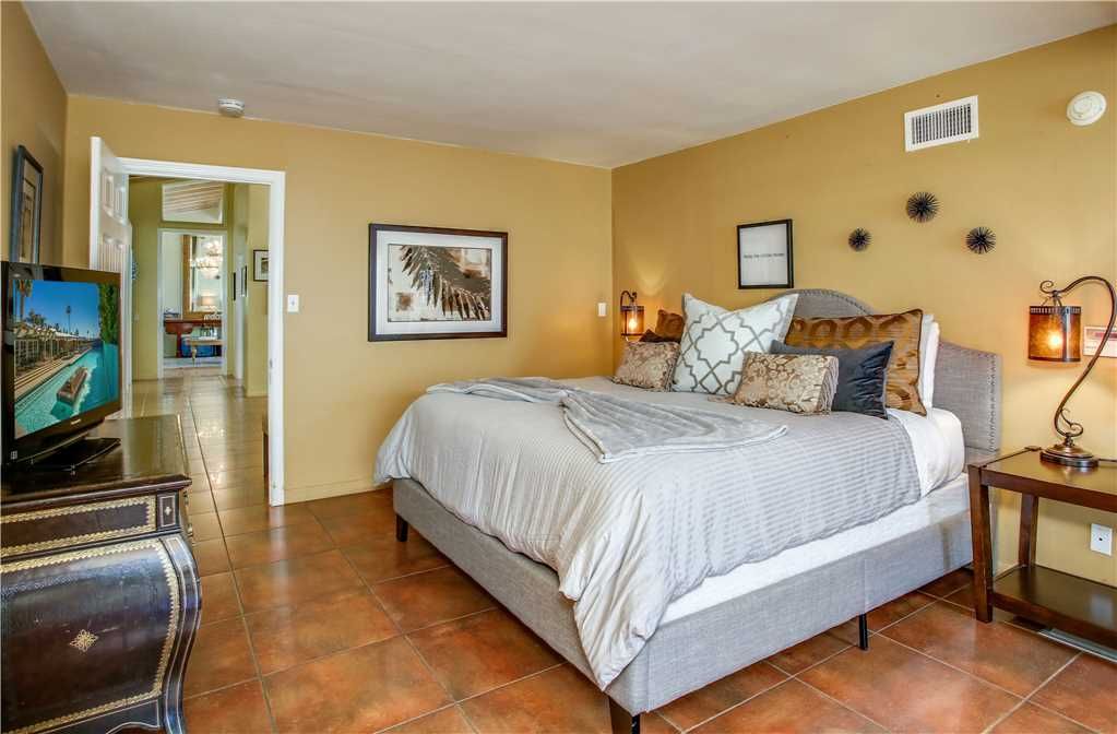 Bedroom #2: The Bahama room, king bed. Surround yourself with gorgeous palm tree prints, while you sink into the grand, luxurious chair for an afternoon of reading or napping The attached bathroom has a Mexican flair and mirrors everywhere This room opens to the backyard and pool area.