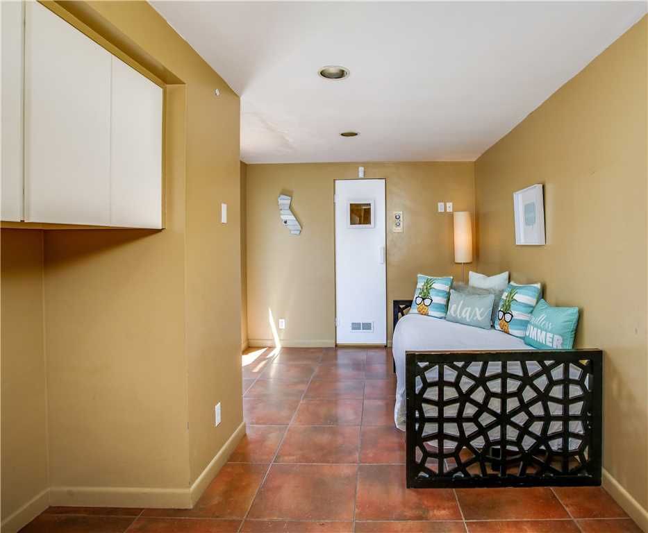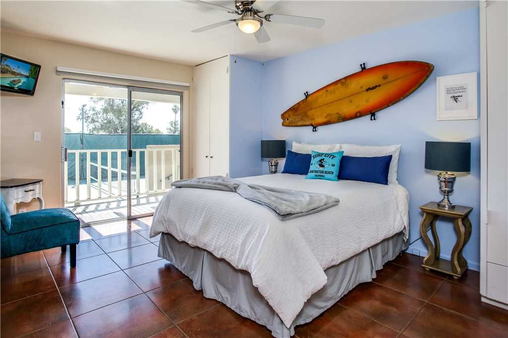 Bedroom #7: The Surf Room, queen bed. This room features an old and well-loved Electric Duck surfboard, shaped by Mike Richardson. This board was shaped the same year the Villa Grand was built This room also opens to the sport court.