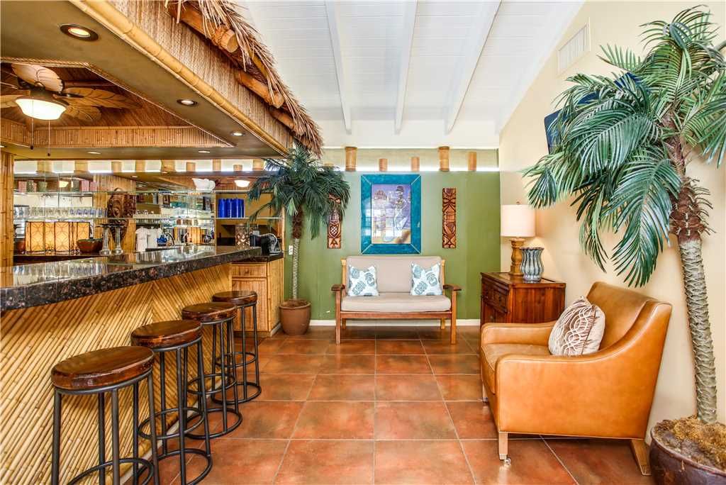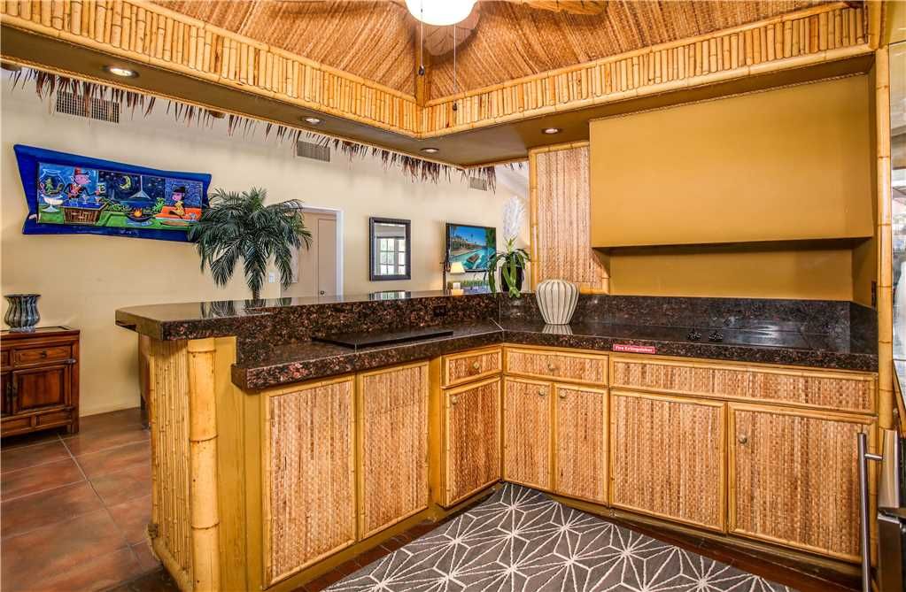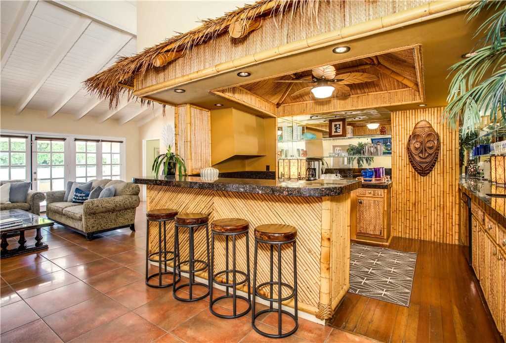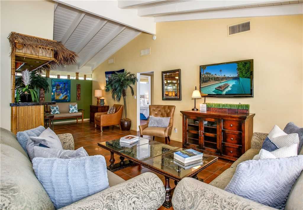 This home features a full-size Tiki bar See the photo This isn’t just any home tiki bar The bar and adjoining living room open to the back patio and pool area, making it a fabulous entertaining space Live the Palm Springs lifestyle Not as formal as the Cocktail Parlor living room, this space is comfy for entertaining or catching a game on the large TV. There is a cabinet full of games, puzzles, and books for your enjoyment.